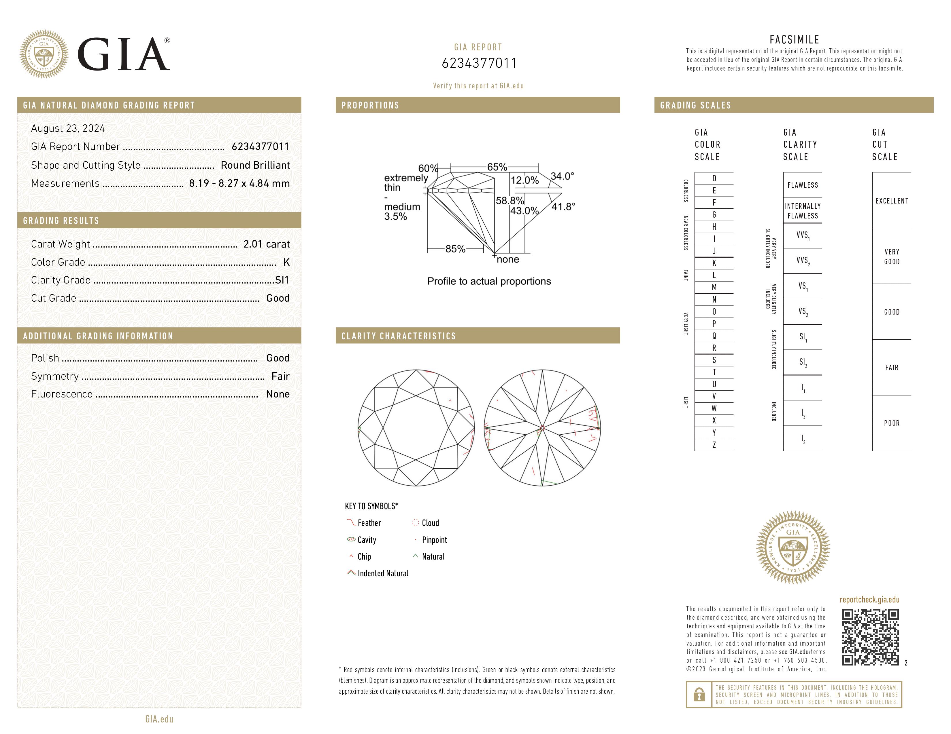 The round brilliant-cut diamond measures 8.19 - 8.27 x 4.84 mm and weighs 2.01 carats. A GIA report # 6234377011, dated August 23, 2024, stating K color, SI1 clarity, accompanies the diamond.