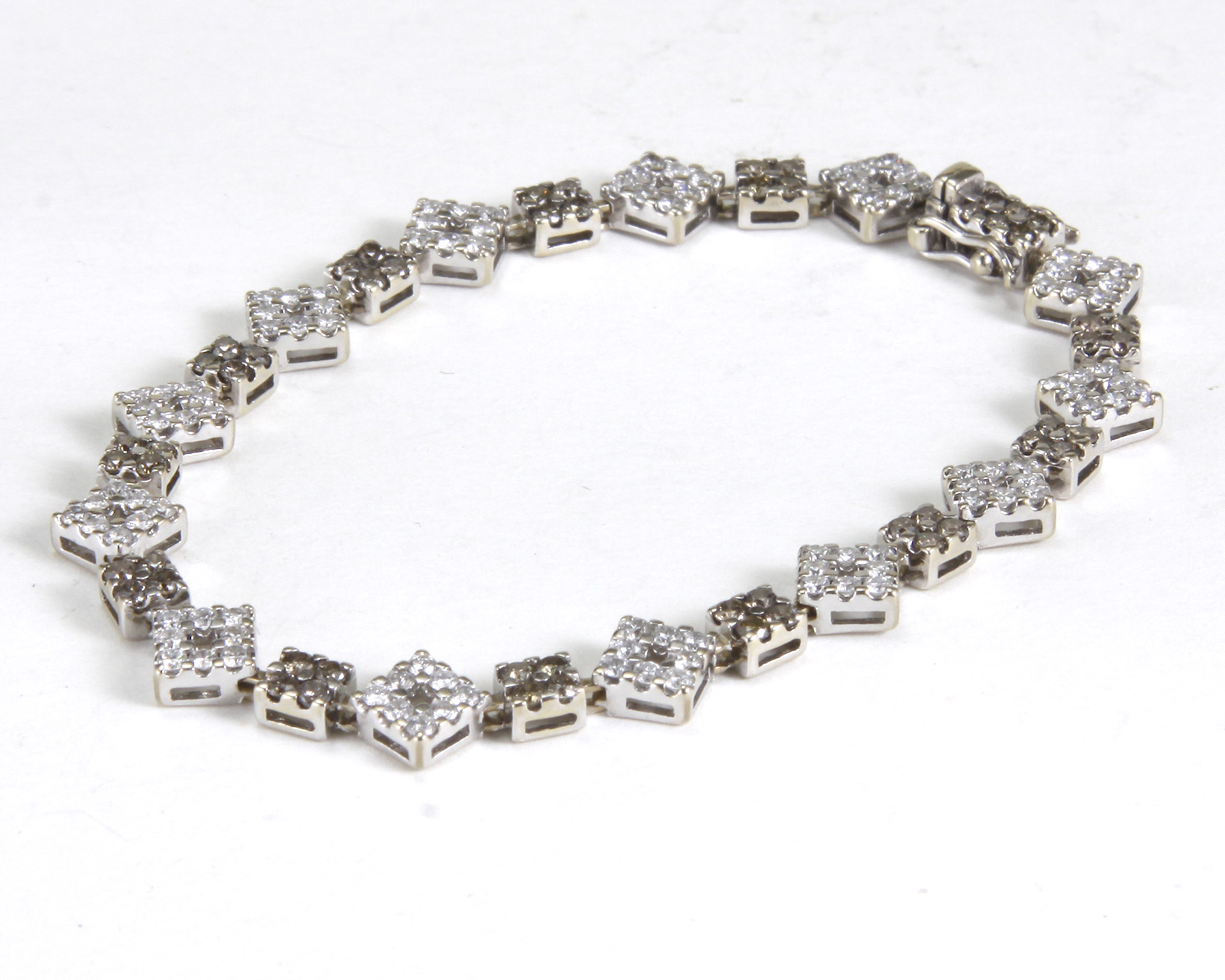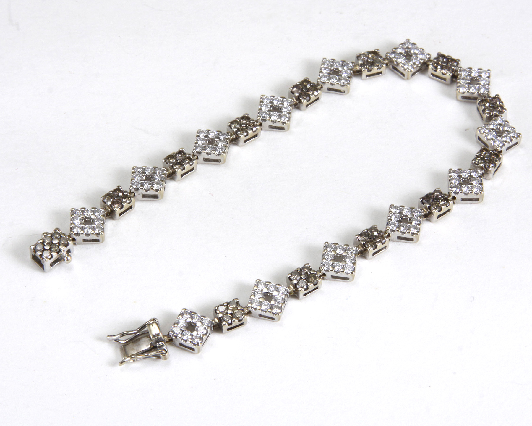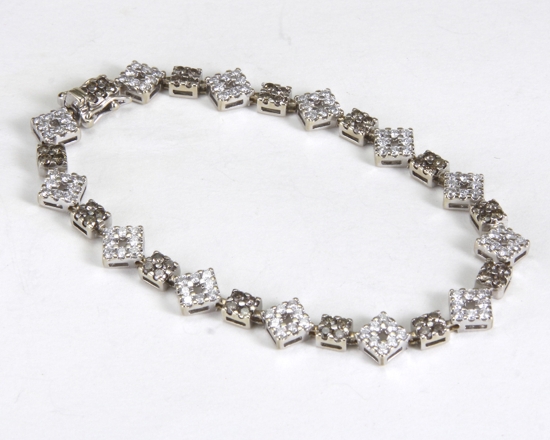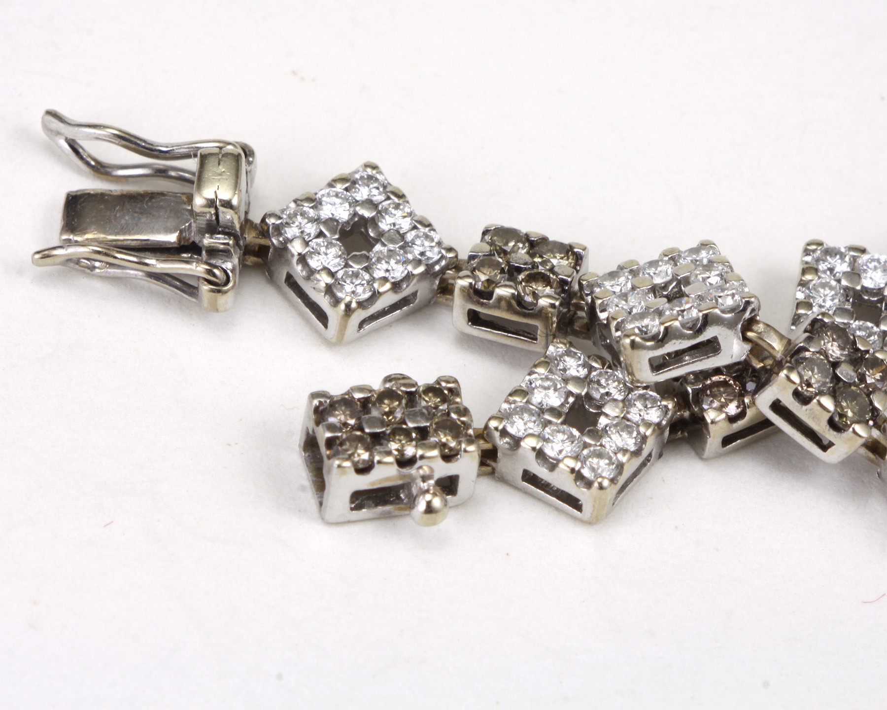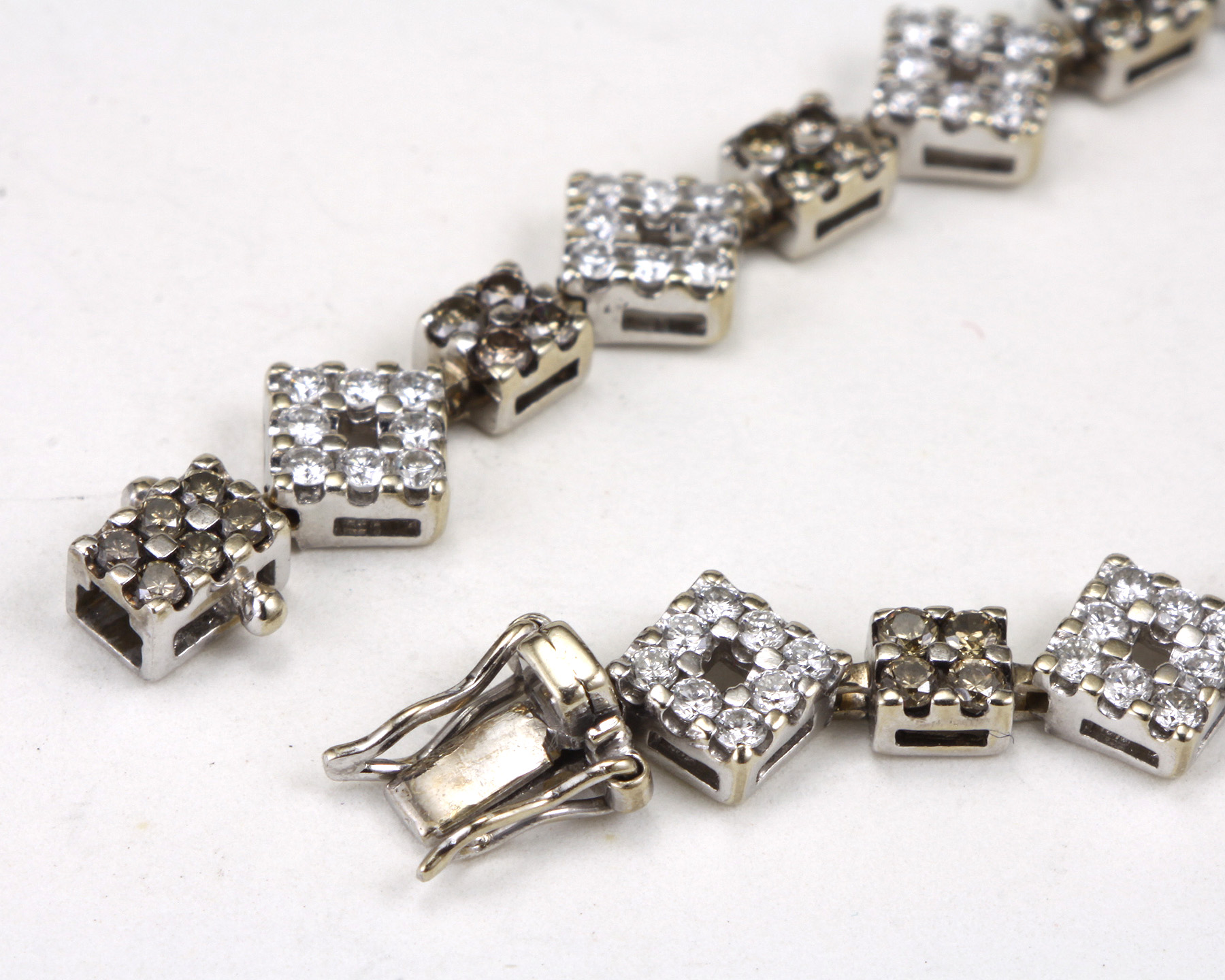 The dainty square/diagonal bracelet set with 182 round brilliant cut diamonds ranging in color from H-I to Cognac (Fancy Light Brown) and VS1-VS2 clarity.