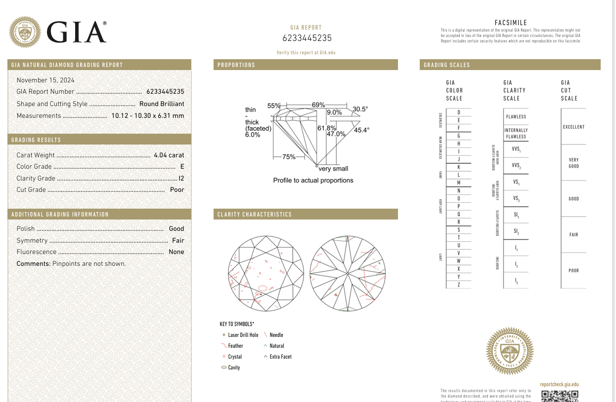 The round brilliant-cut diamond measures 10.12 - 10.30 x 6.31 mm and weighs 4.04 carats. A GIA report # 6233445235, dated November 15, 2024, stating E color, I2 clarity, accompanies the diamond.