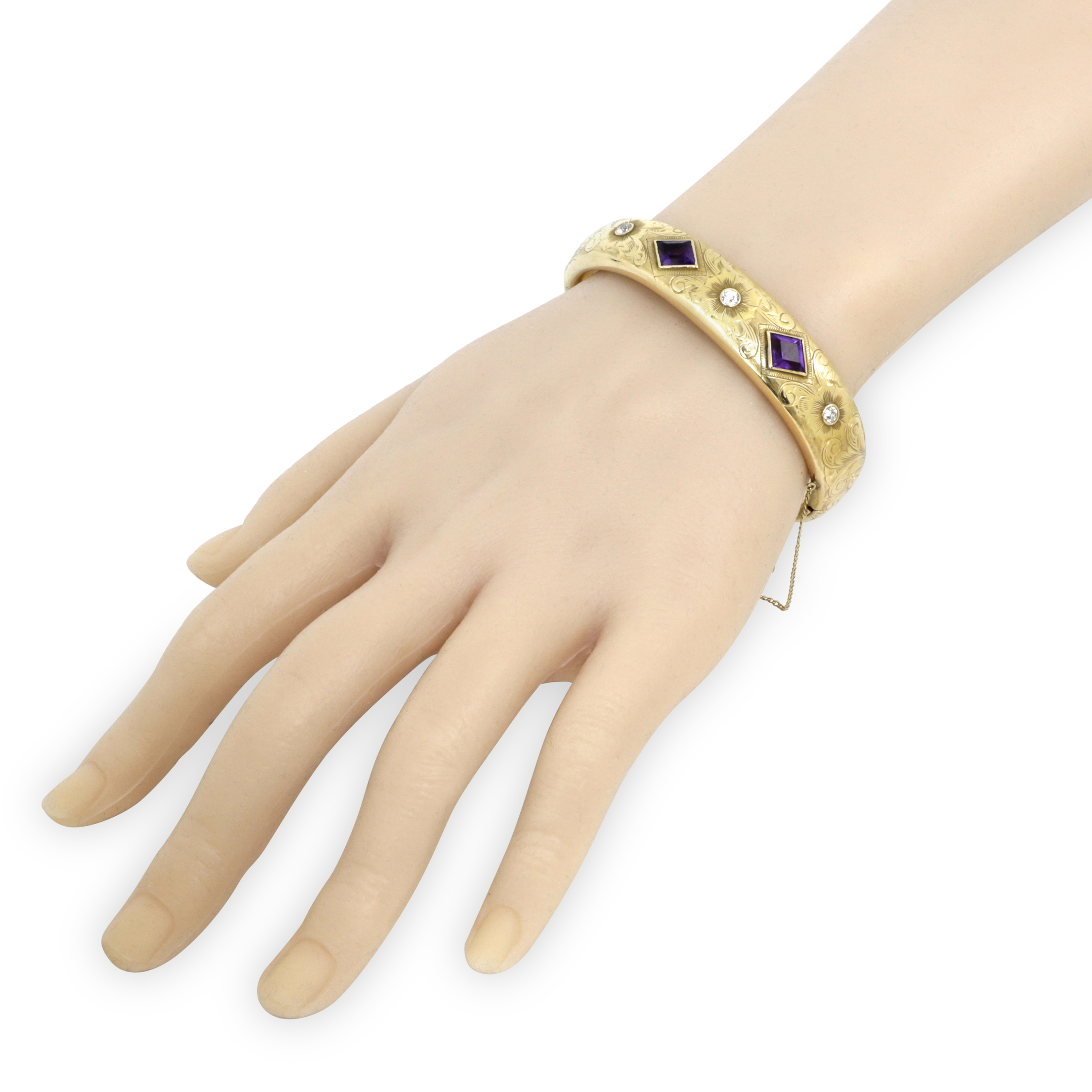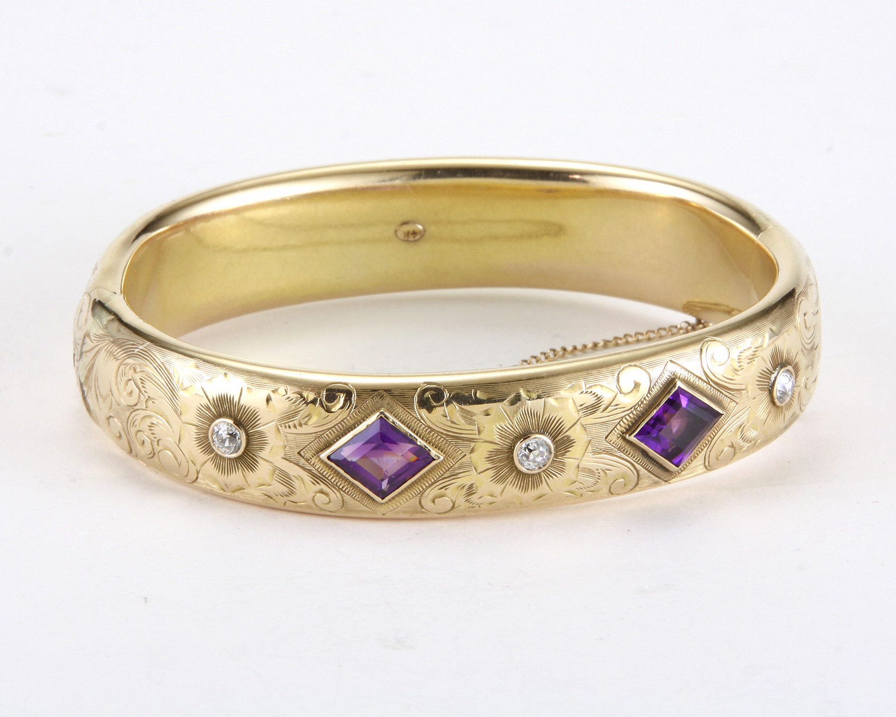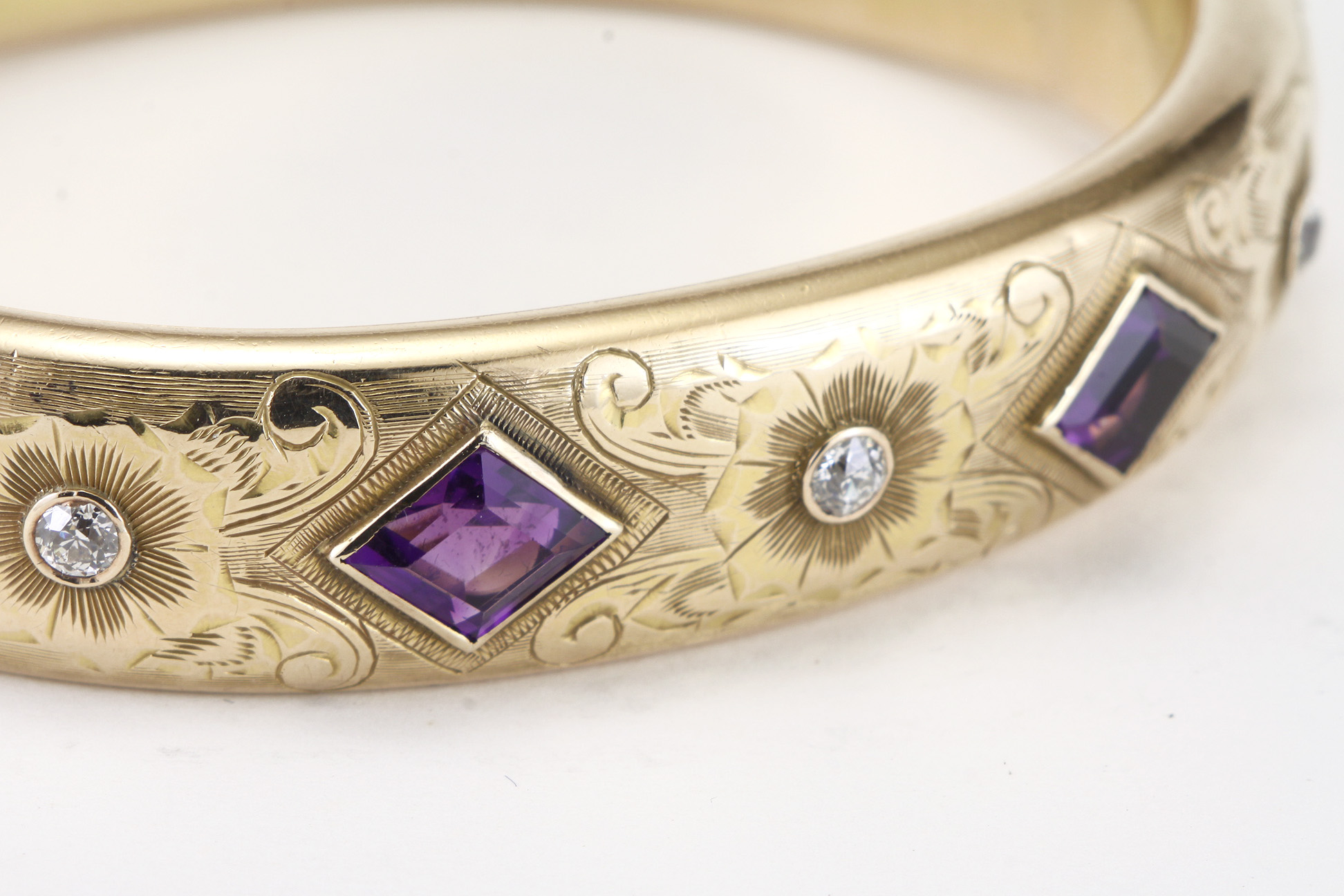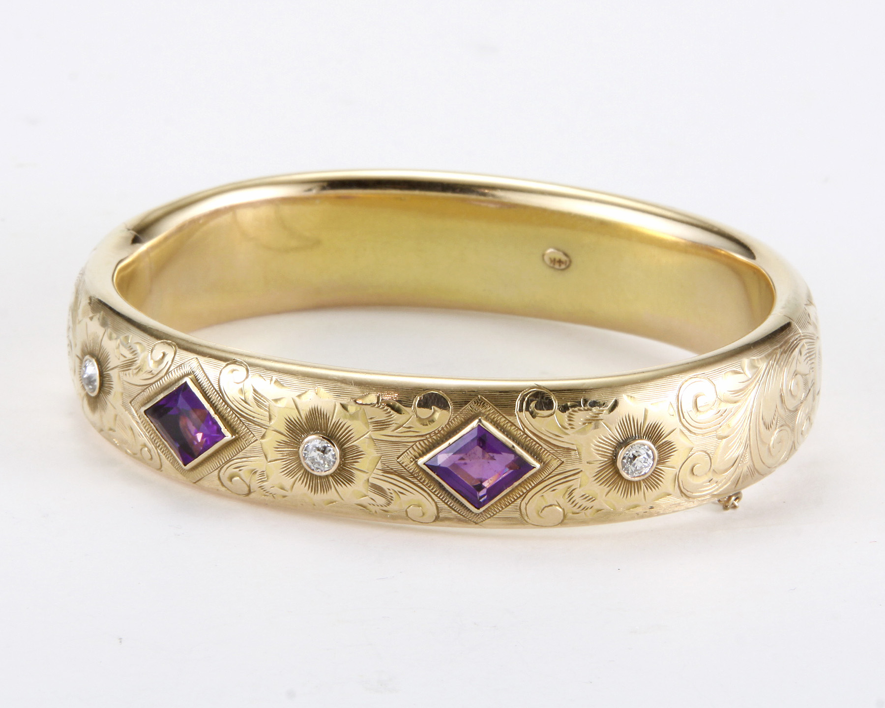 The hand chased 15mm wide bangle set with 2 kite shaped bezel set amethyst, flanked by 3 Old European cut diamonds of H-I color and VS2-SI1 clarity.