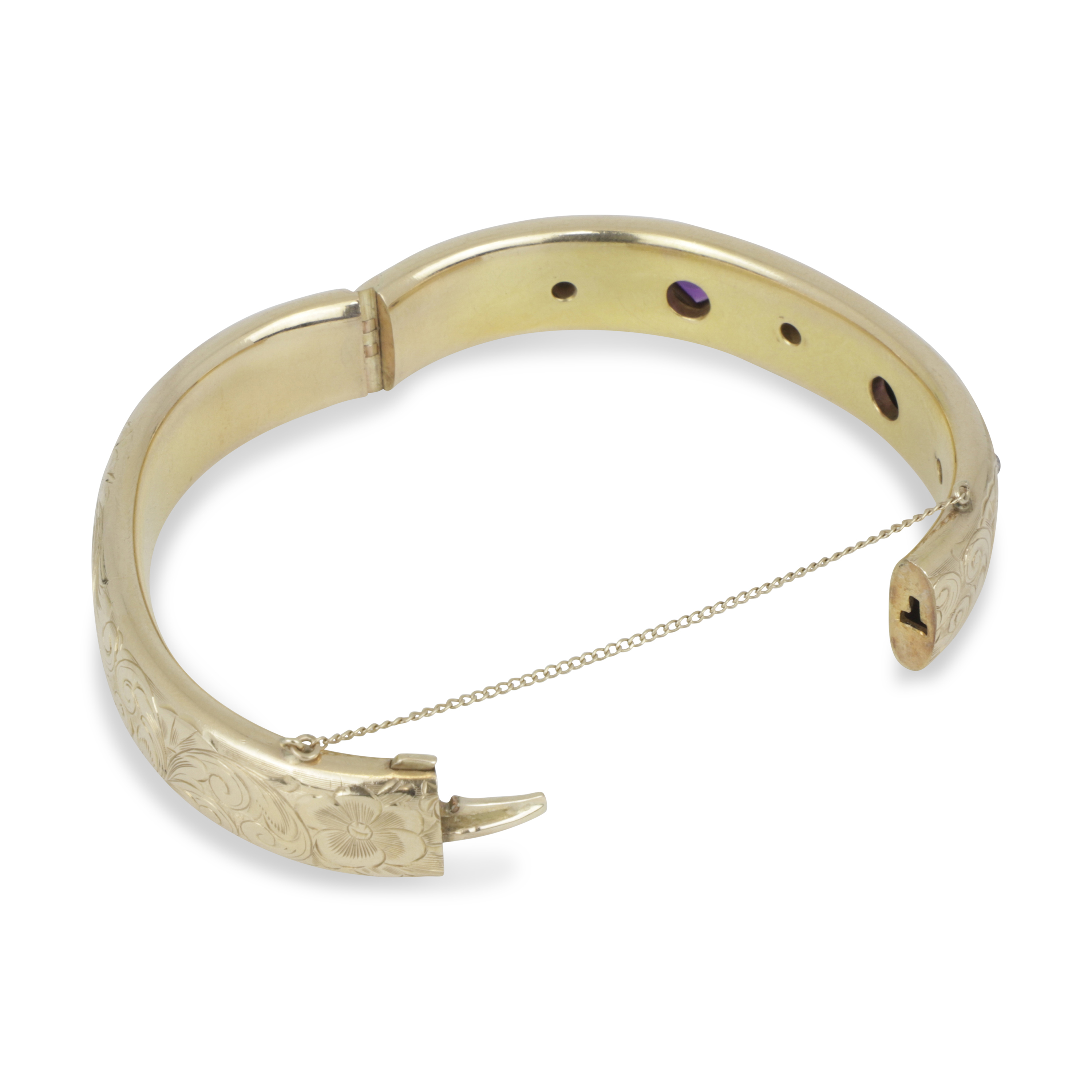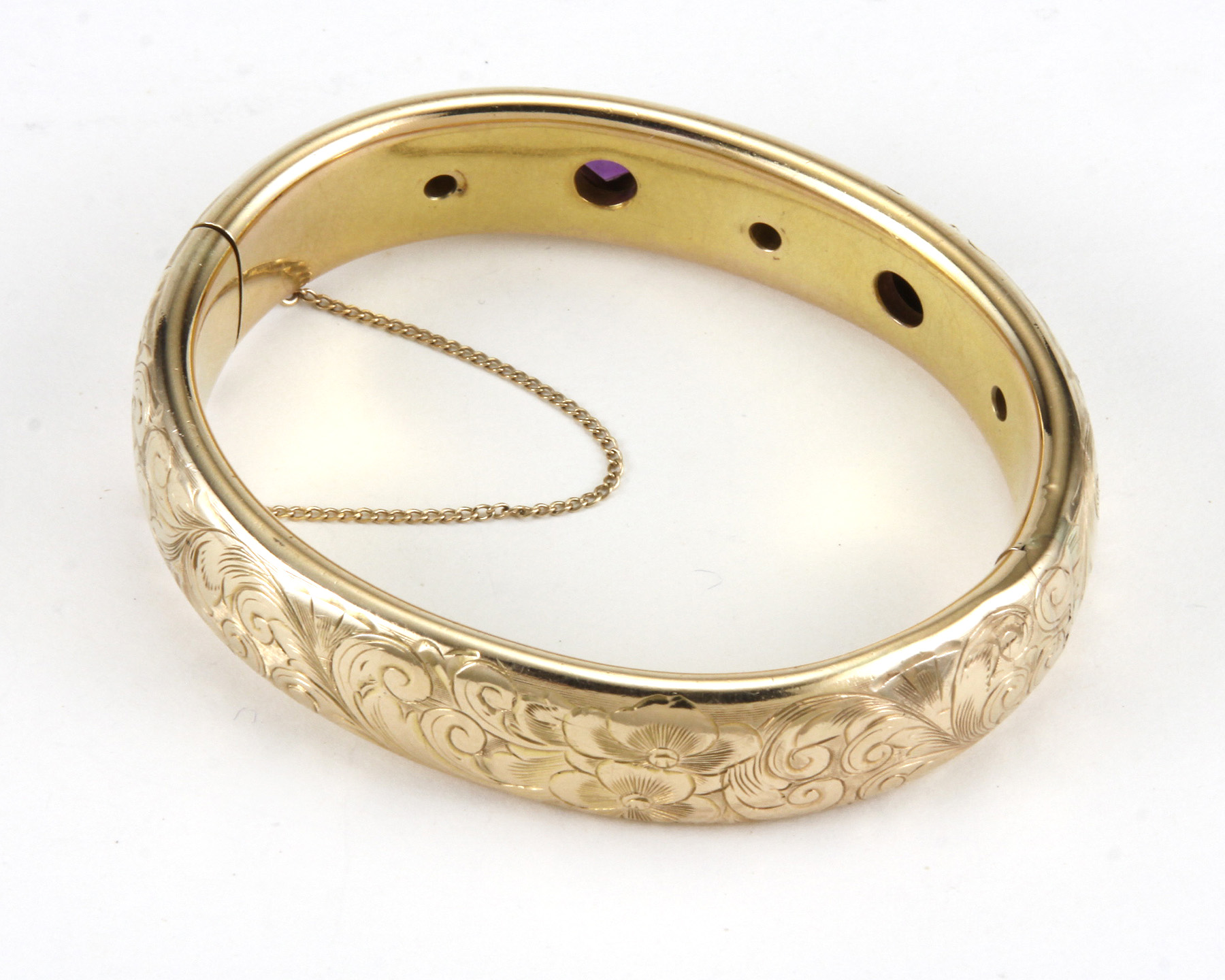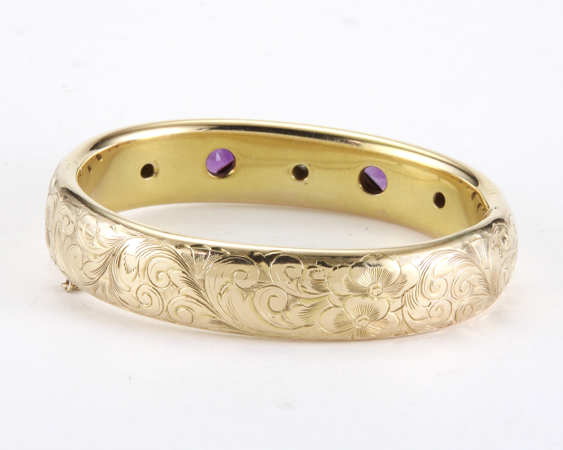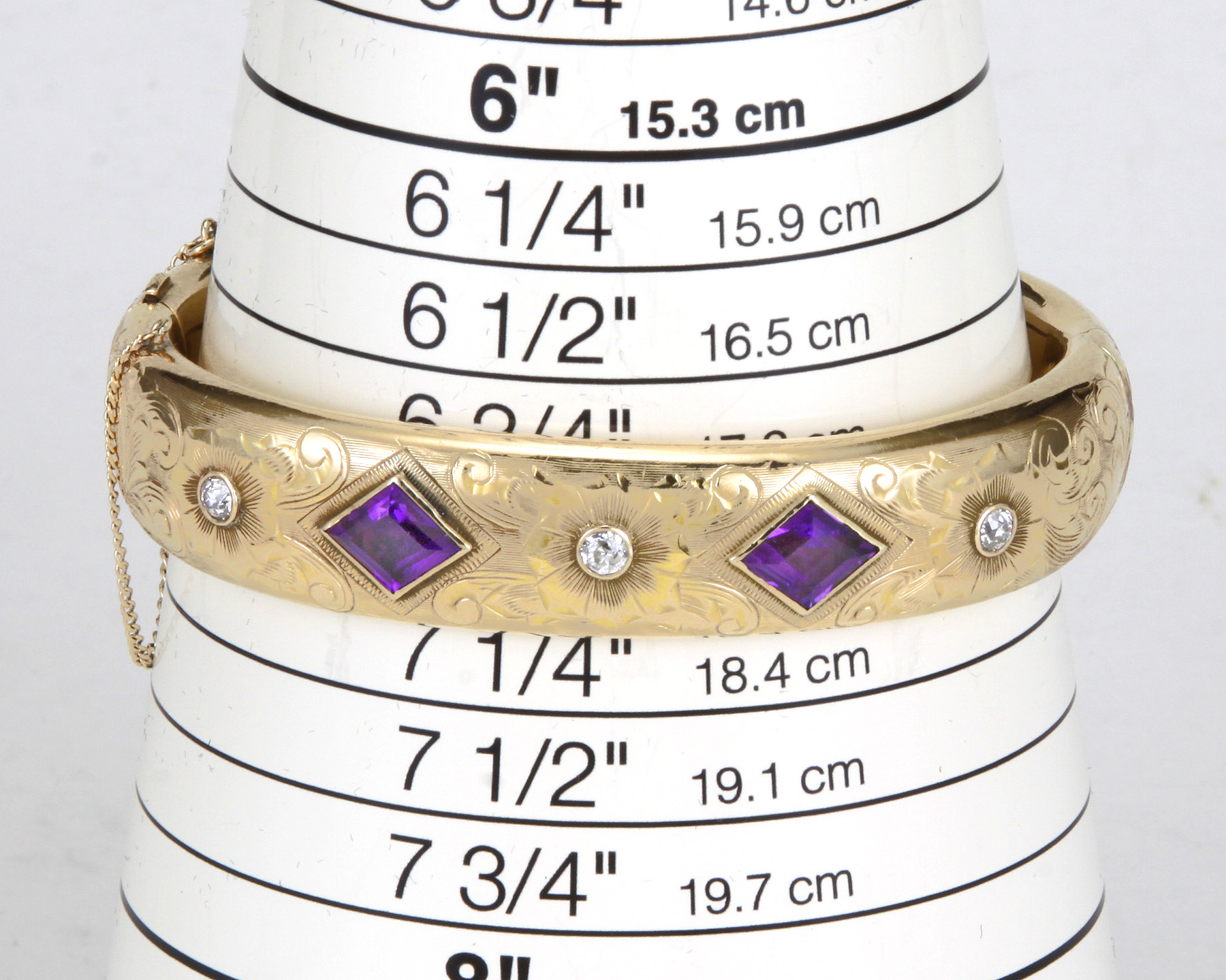 The hand chased 15mm wide bangle set with 2 kite shaped bezel set amethyst, flanked by 3 Old European cut diamonds of H-I color and VS2-SI1 clarity.
