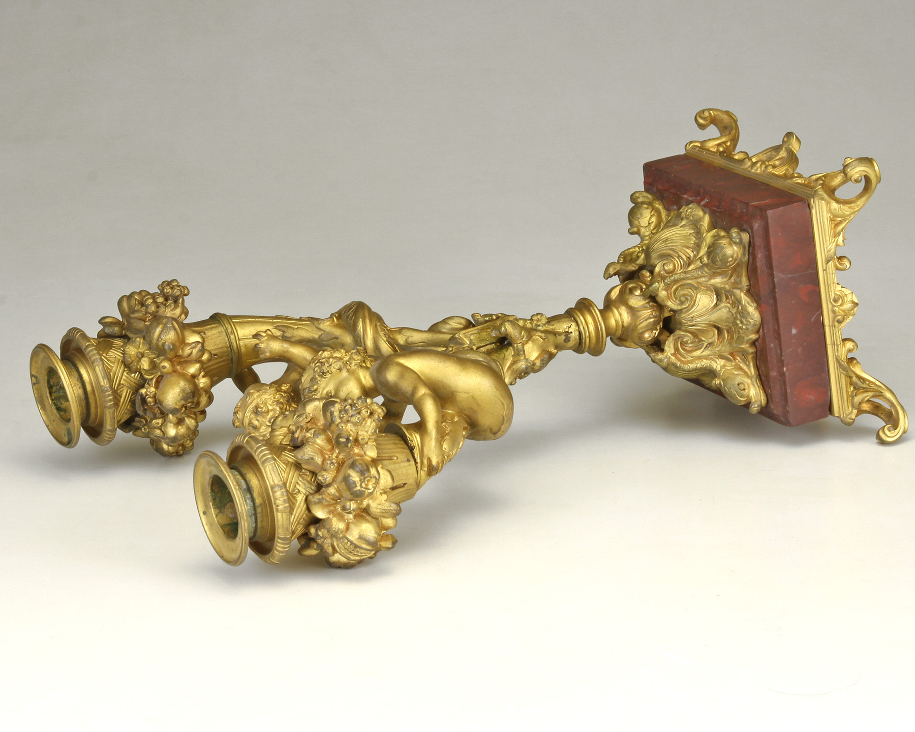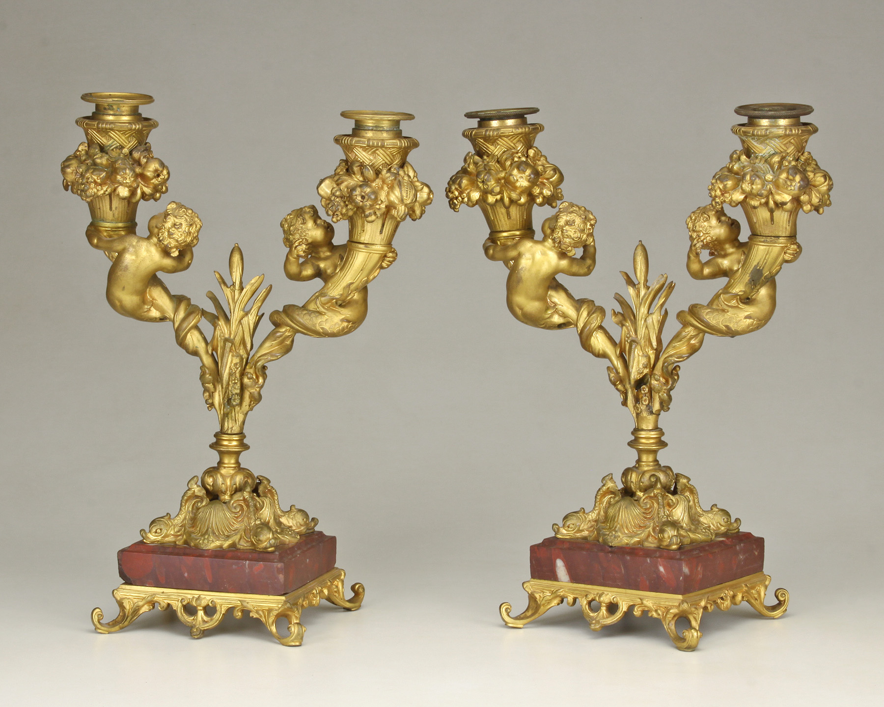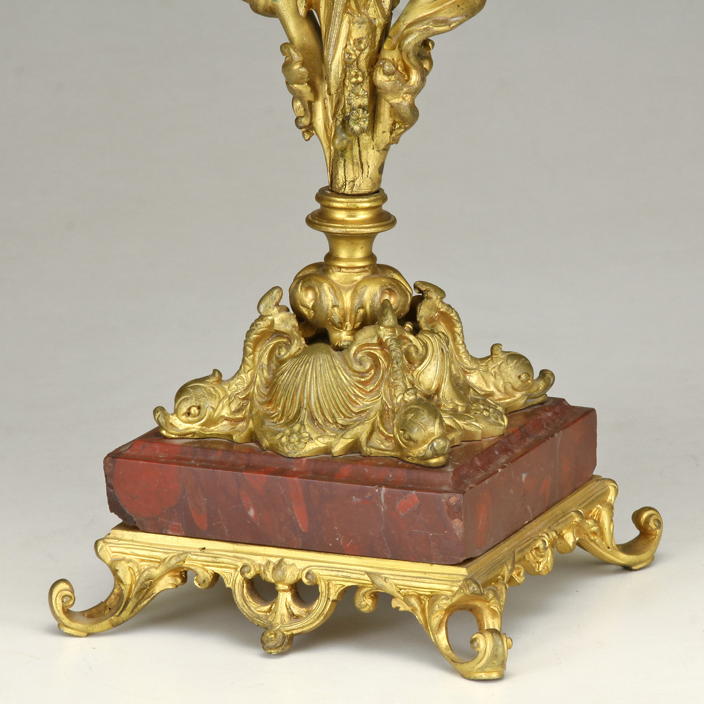 with floral festoons at center below a 2-arm candelabra with fruit finial/ bobeche: decorated by cherubs in high relief, surmounted by a 4-dolphin squared standard; all mounted to a gorgeous deep-reddish/burgundy rouge marble ending in C scroll Rocco style feet.