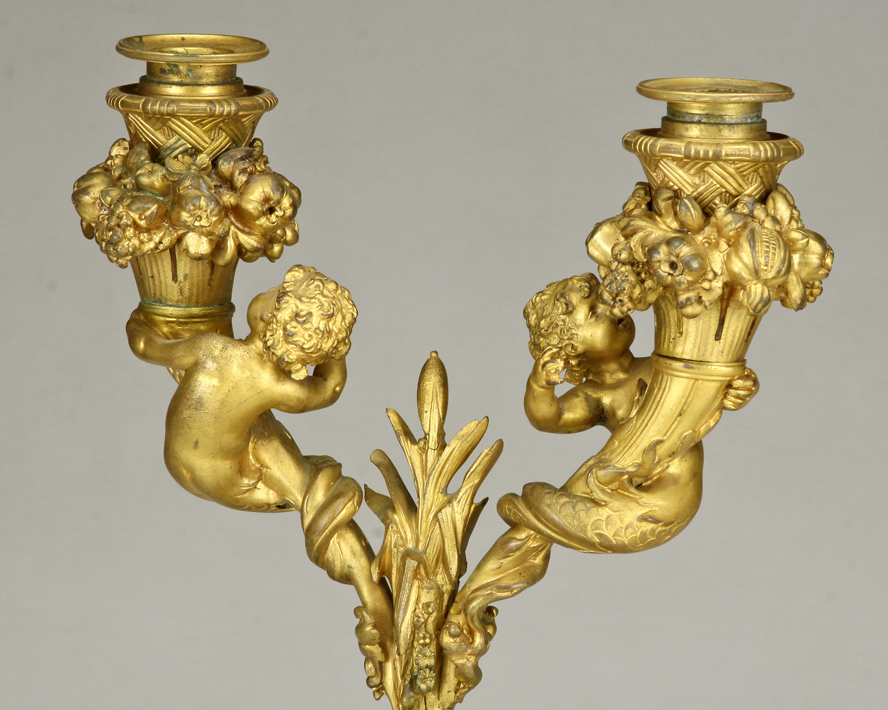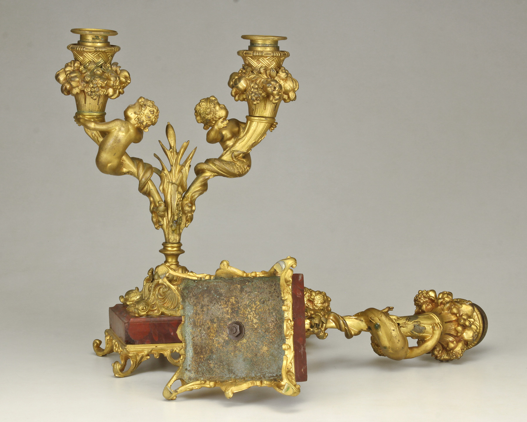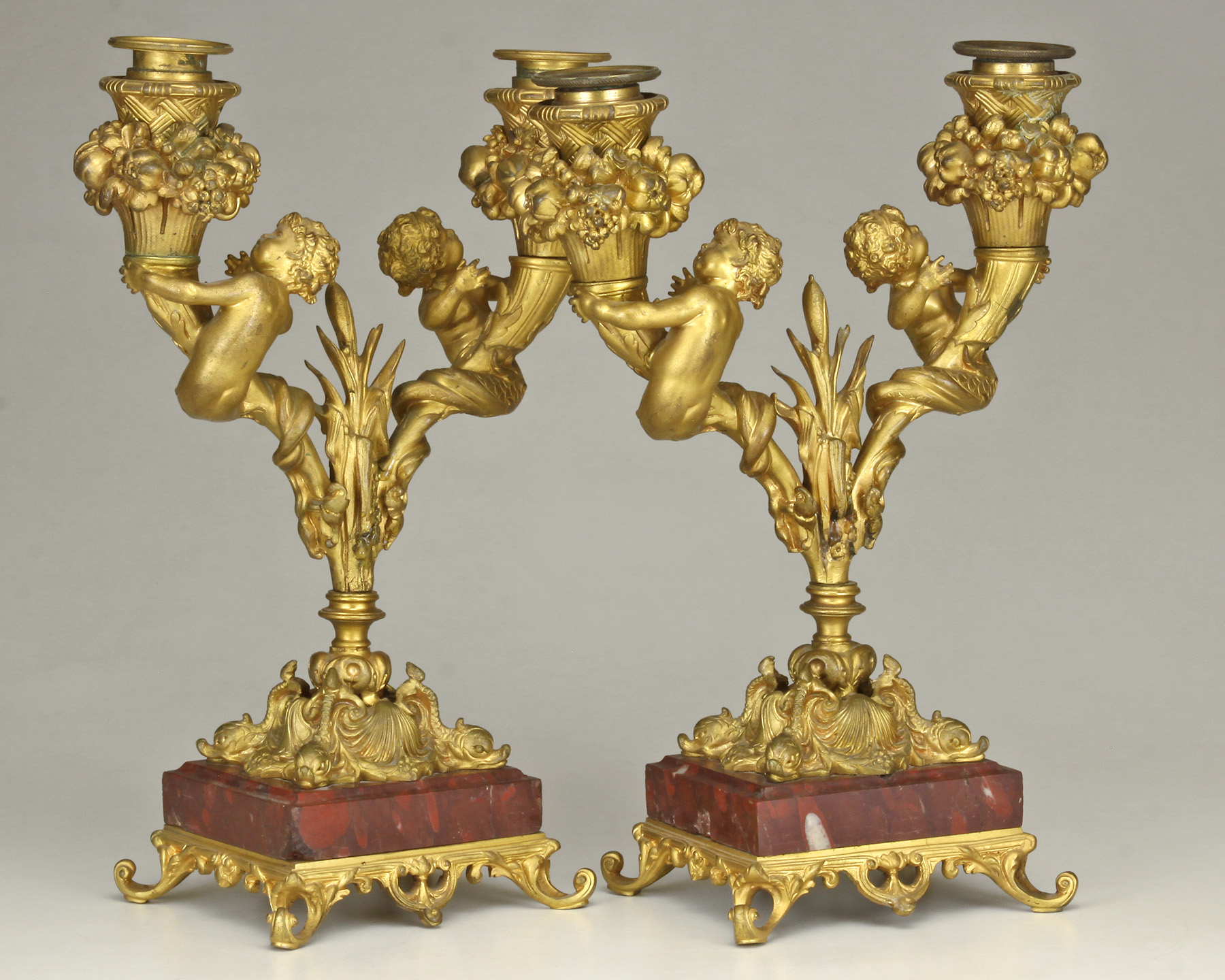 with floral festoons at center below a 2-arm candelabra with fruit finial/ bobeche: decorated by cherubs in high relief, surmounted by a 4-dolphin squared standard; all mounted to a gorgeous deep-reddish/burgundy rouge marble ending in C scroll Rocco style feet.