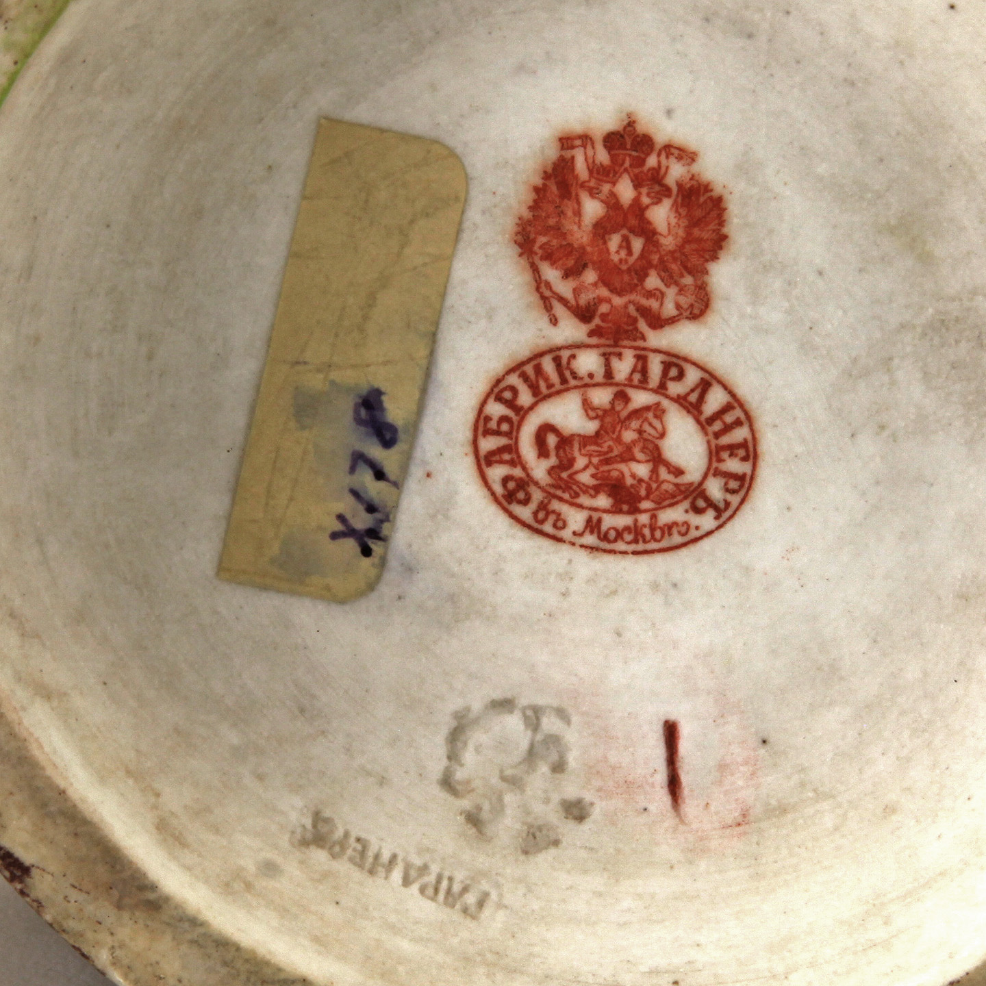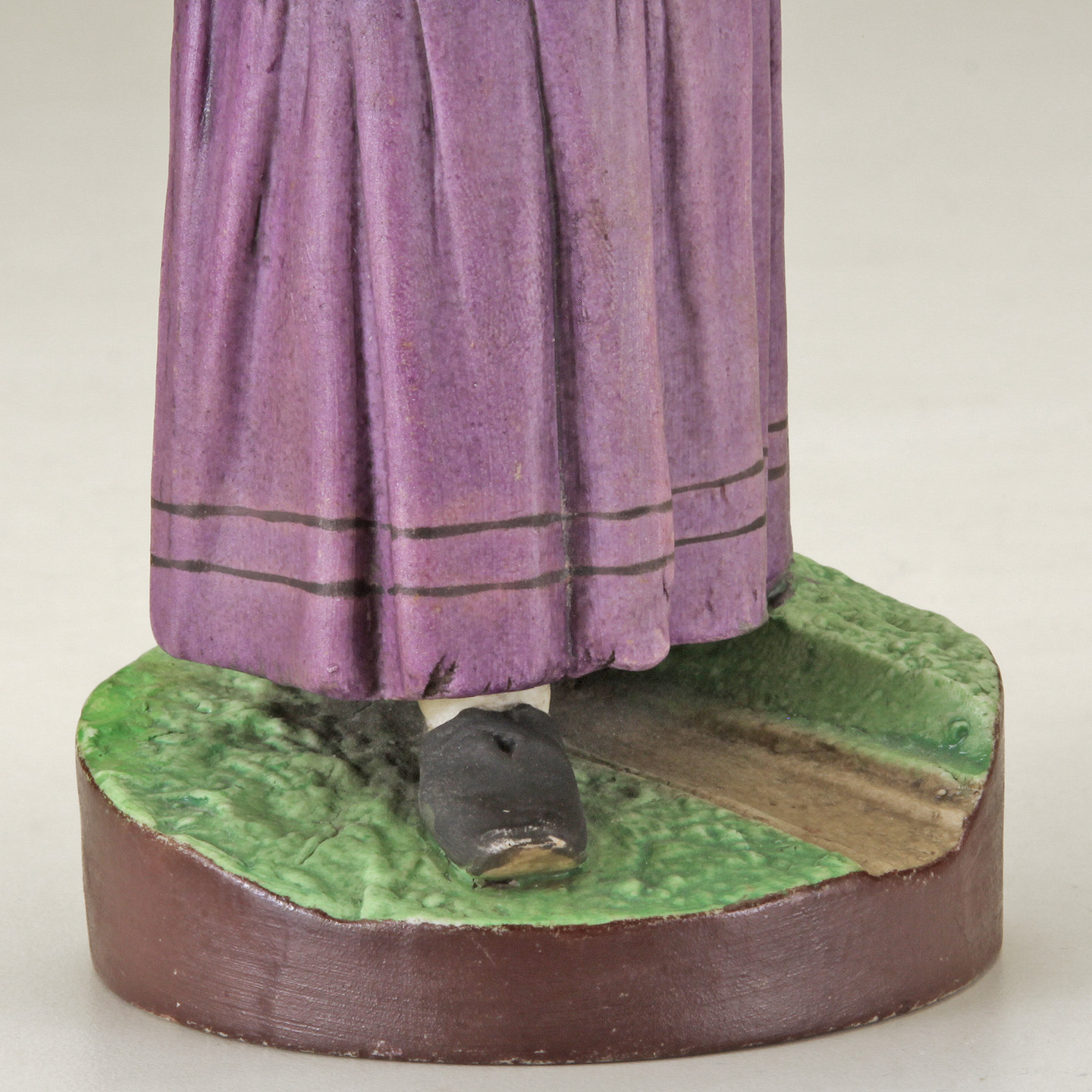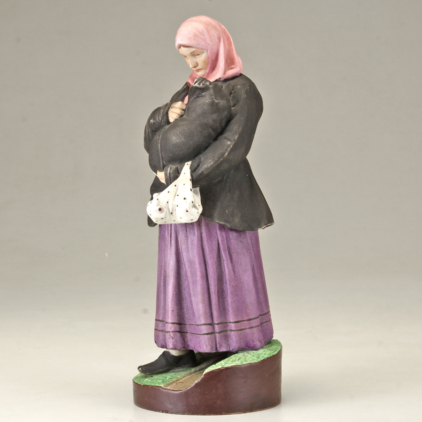 Realistically & finely modeled, wearing a purple skirt with black trim, a black coat and a pale pink headscarf, holding the baby tucked into her clothing, a white polk a dot bag on her arm, standing on a brown-green grass-like circular base, red over-glazed Gardner factory mark beneath imperial warrant and impressed numeral 1 under base.