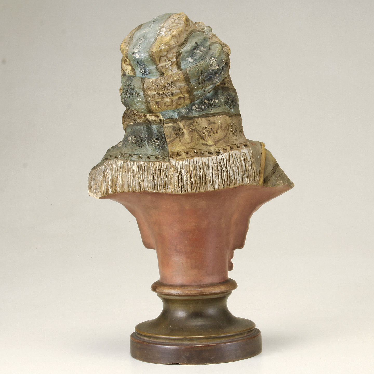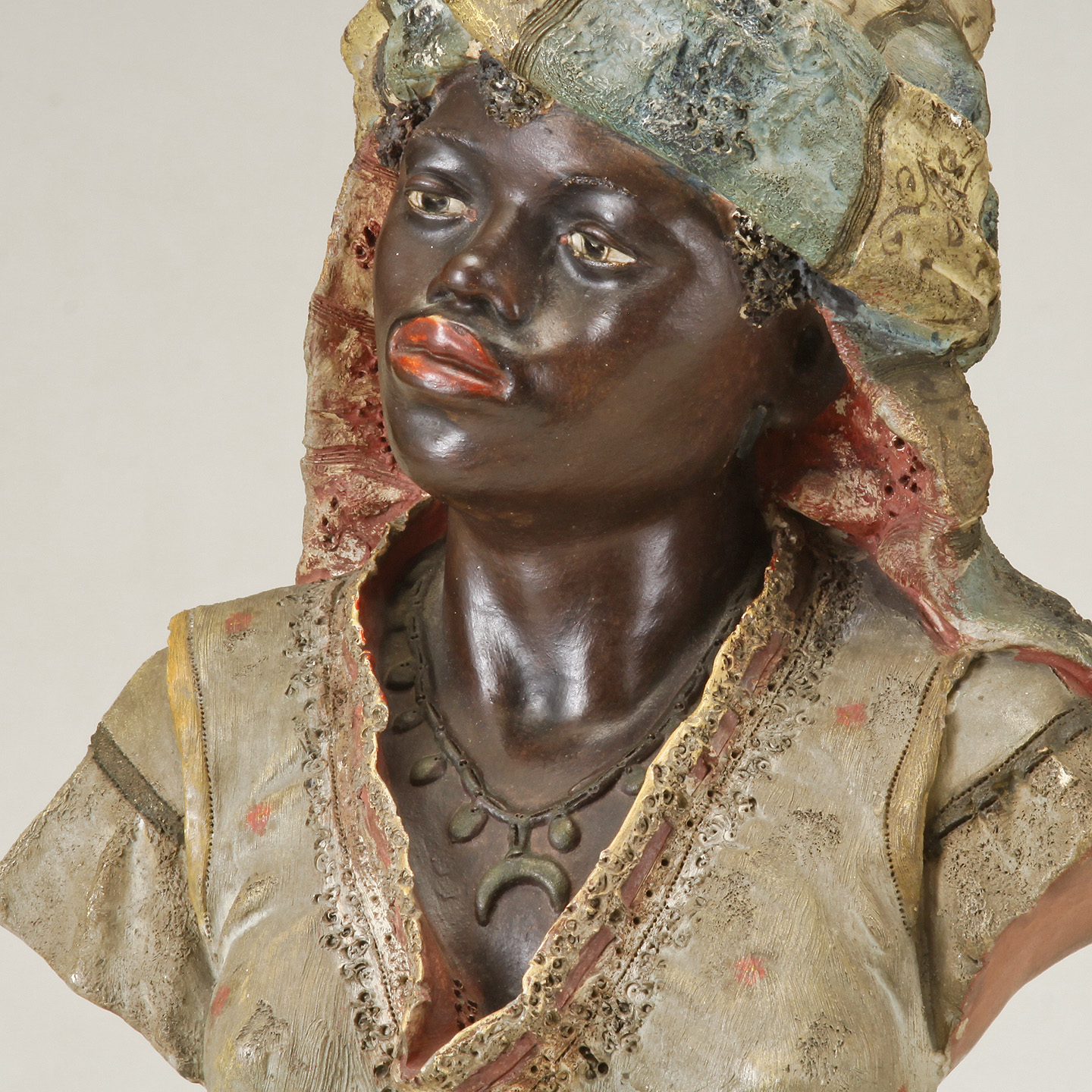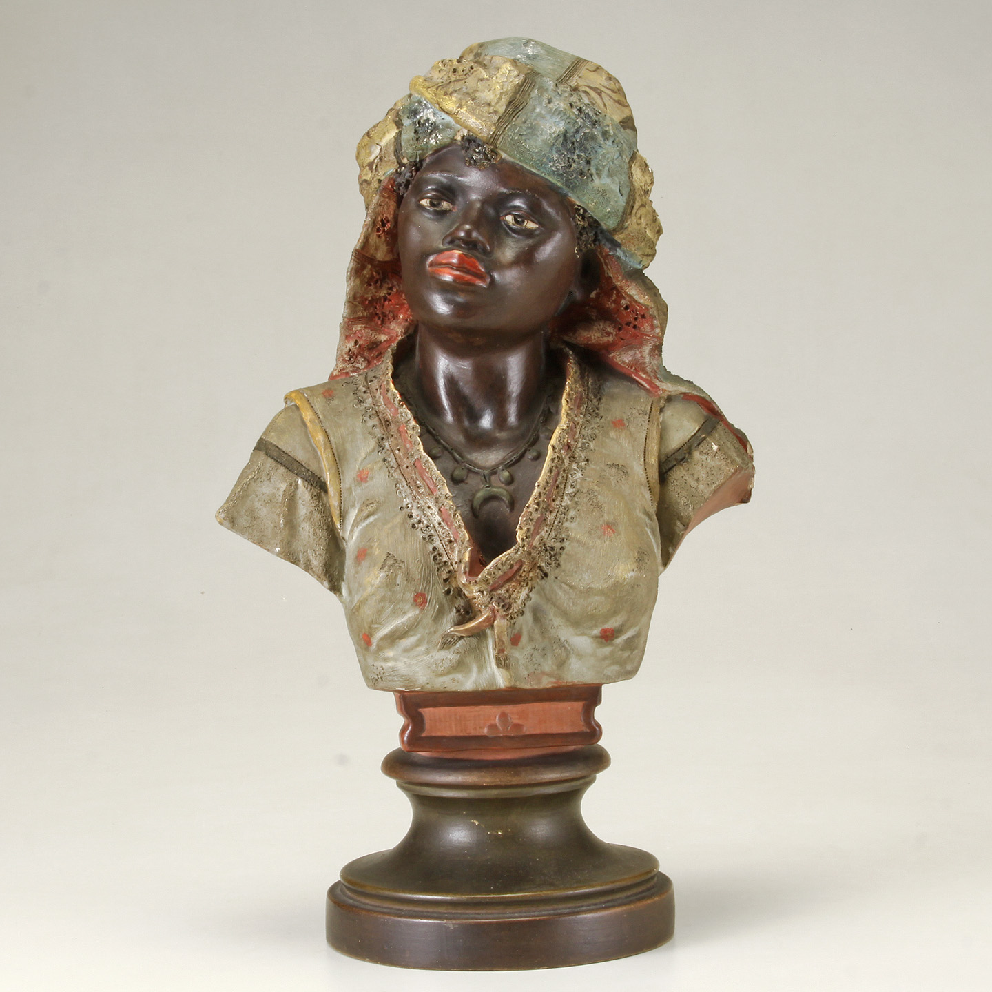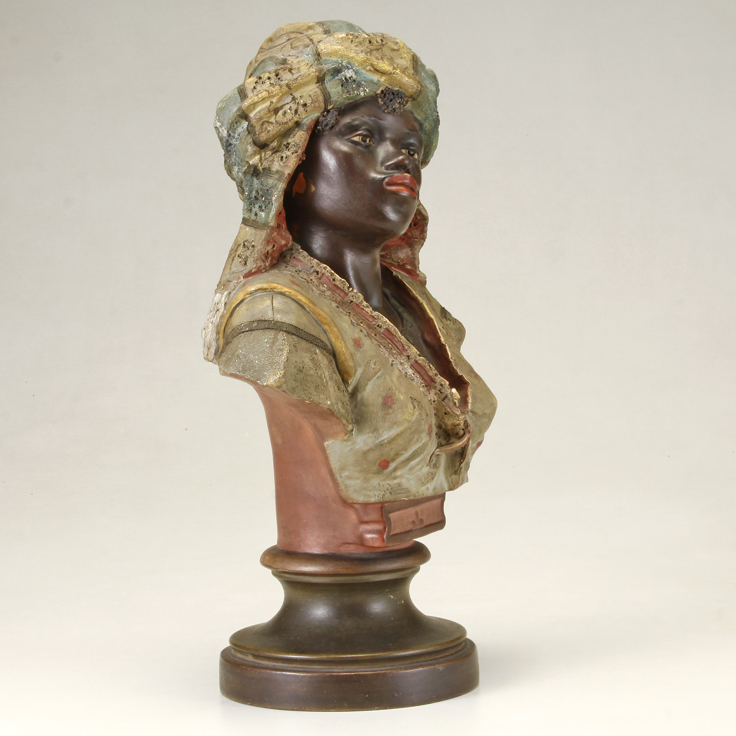 Blackamoor Bust on brownish colored double pedestal socle base.