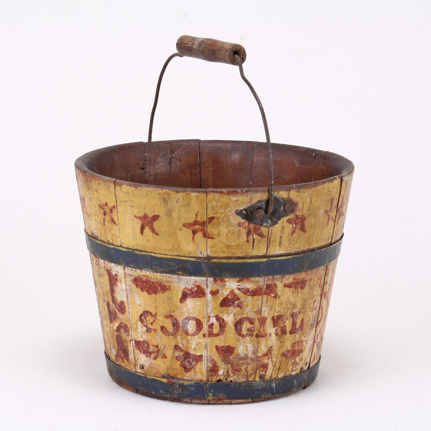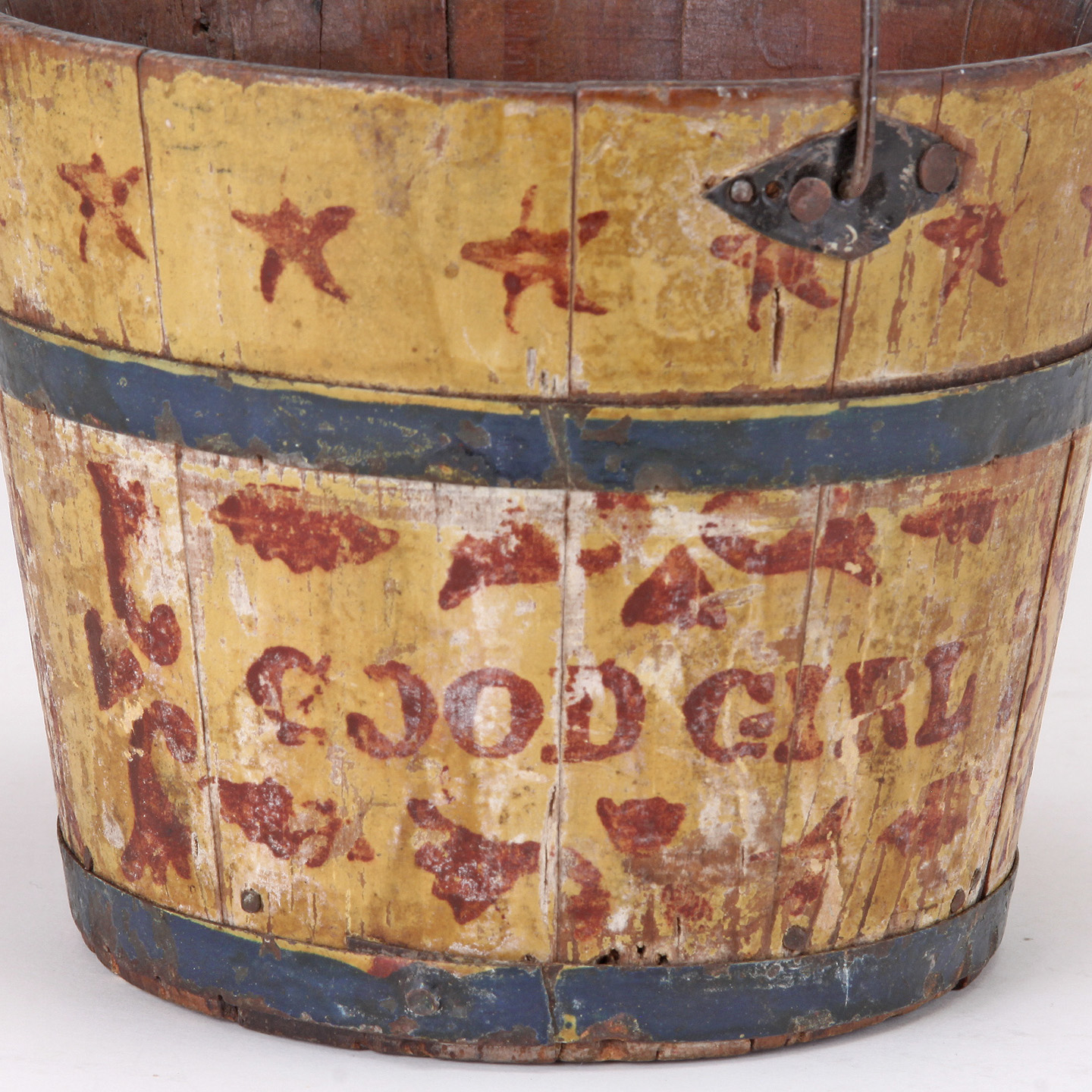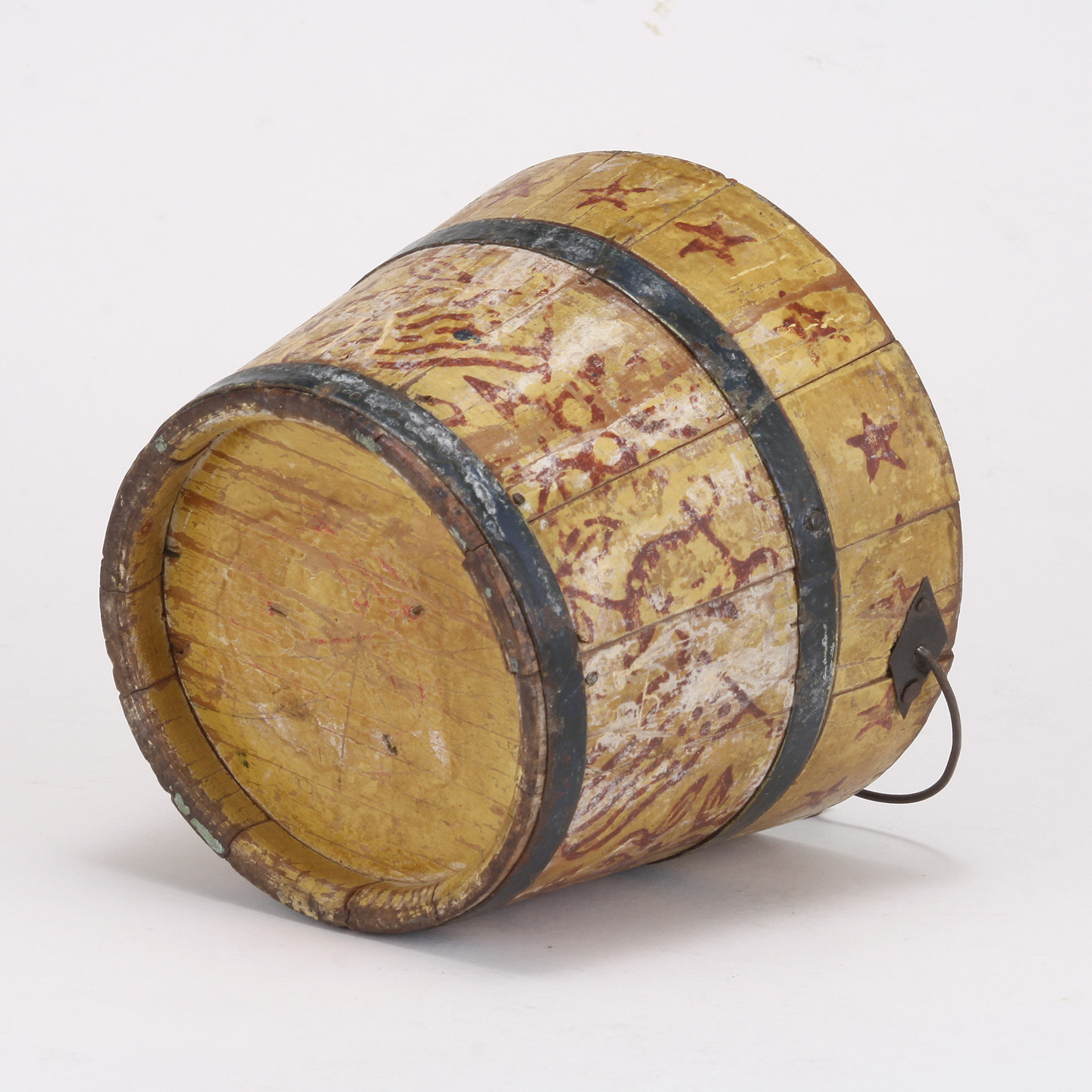 Stave-constructed wood with painted blue metal straps. The staves painted “mustard yellow” with iron red 5 pointed stars across the top. Decorated with flowers, vine, lyre, and American Flag, further enhanced by a red stenciled: “GOOD GIRL”