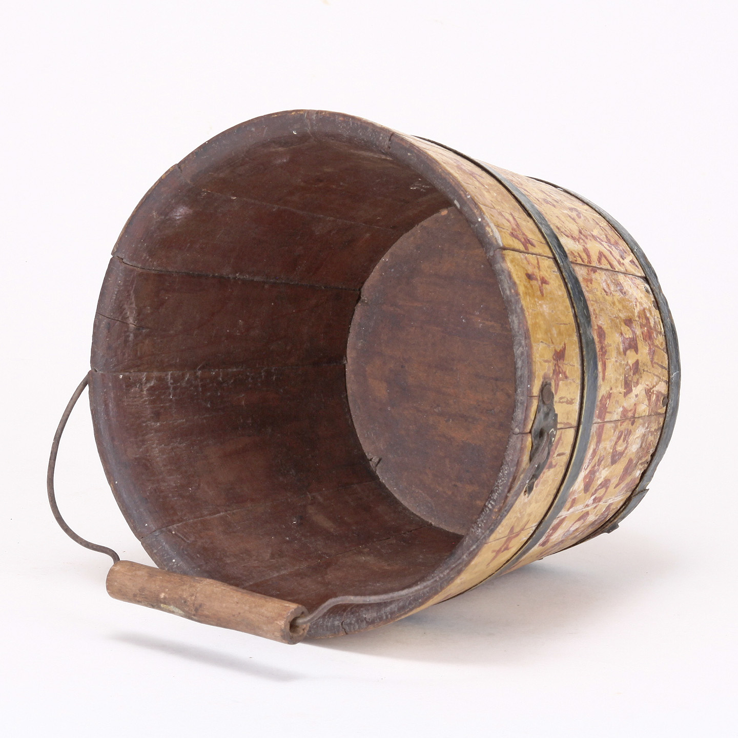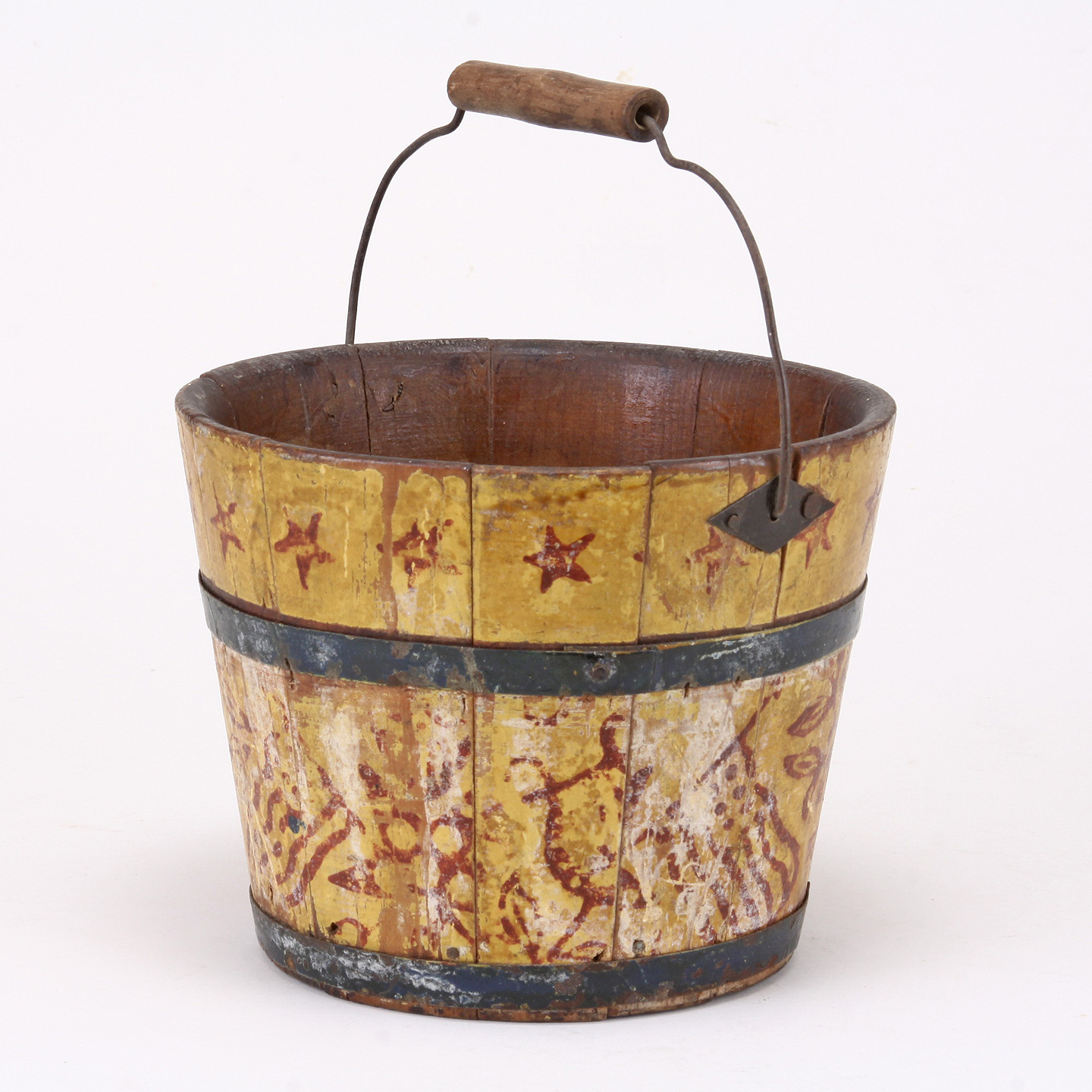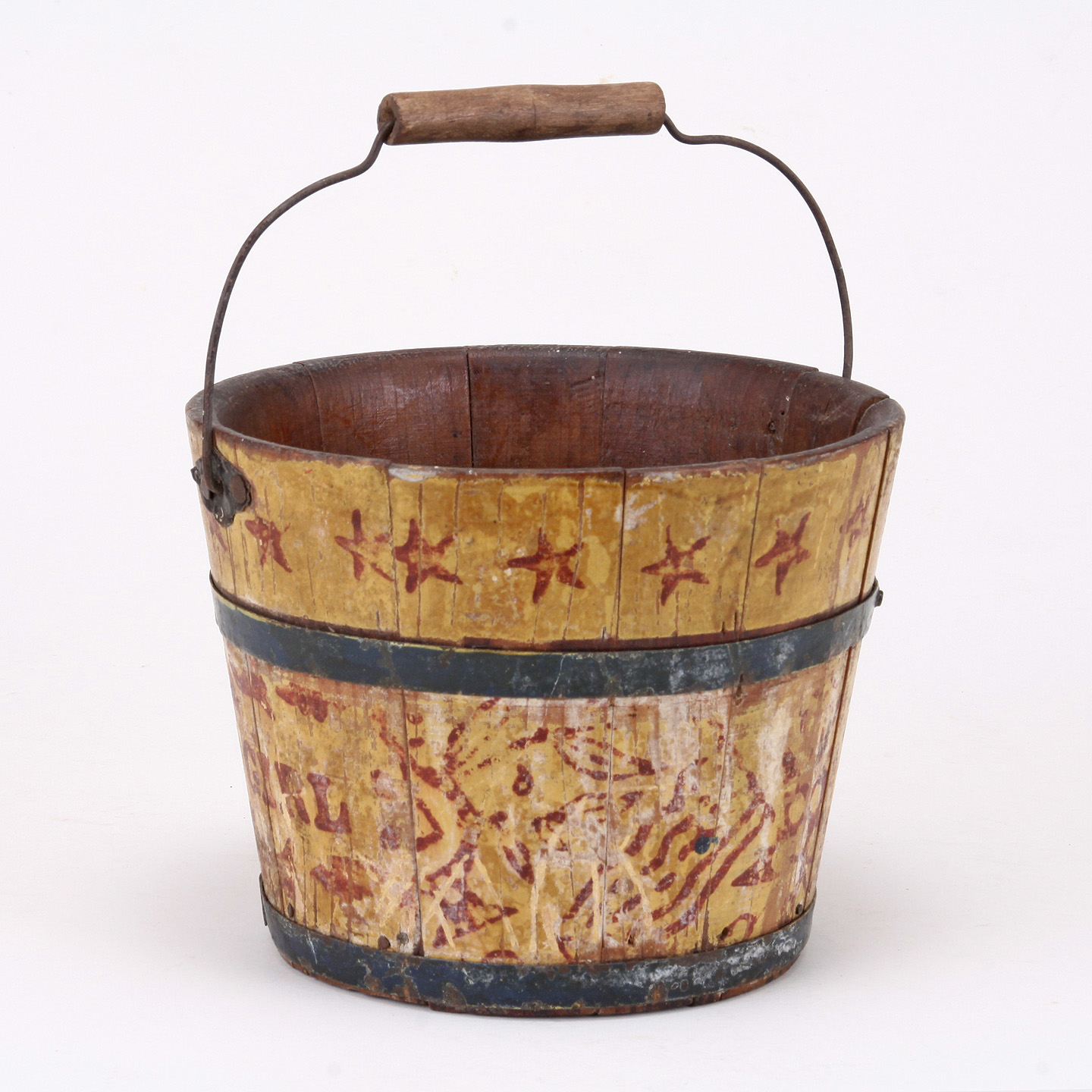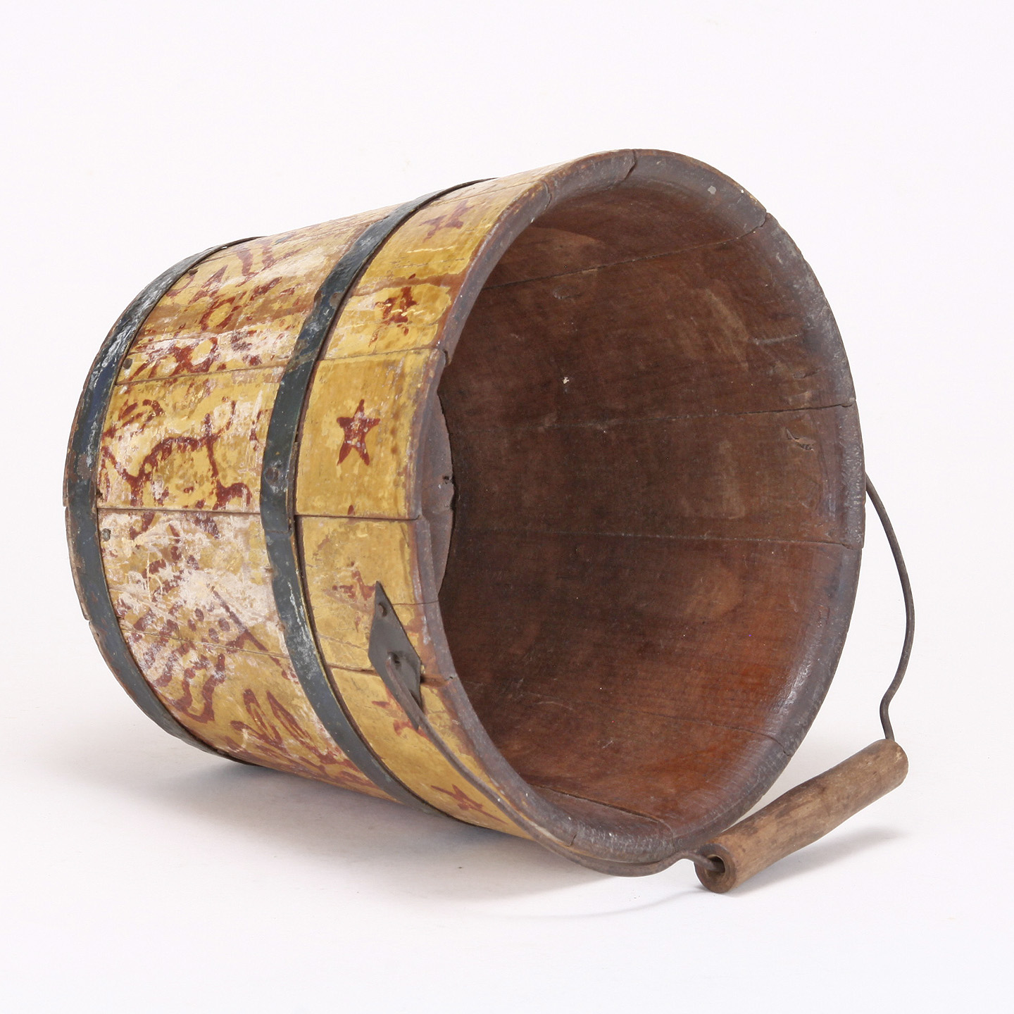 Stave-constructed wood with painted blue metal straps. The staves painted “mustard yellow” with iron red 5 pointed stars across the top. Decorated with flowers, vine, lyre, and American Flag, further enhanced by a red stenciled: “GOOD GIRL”