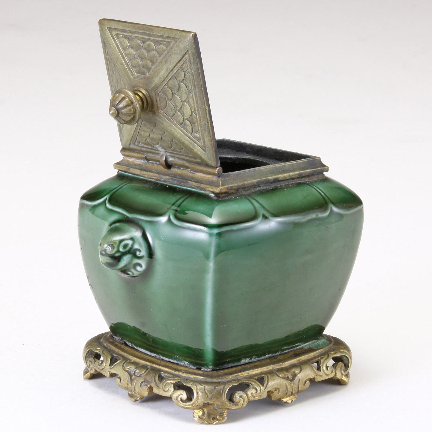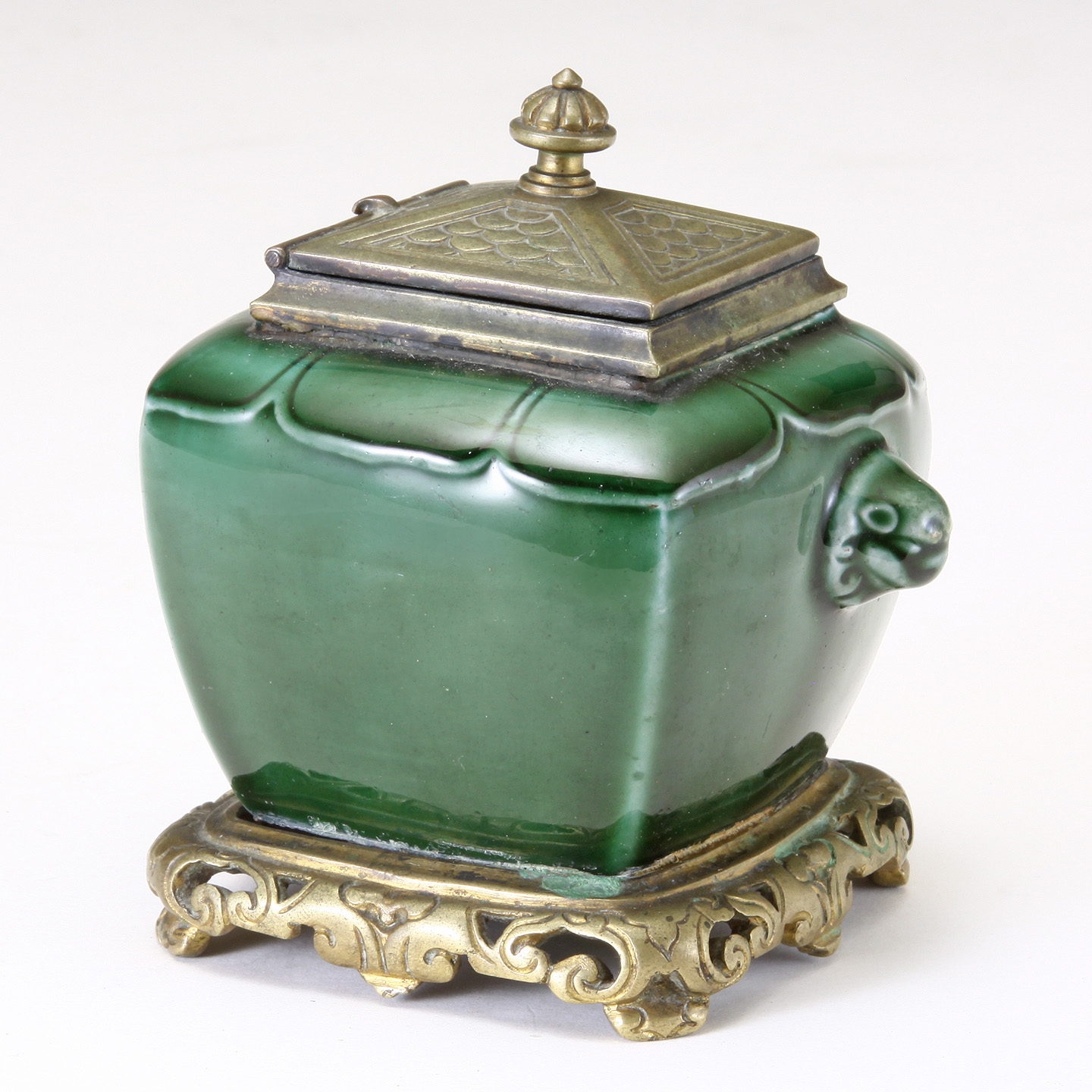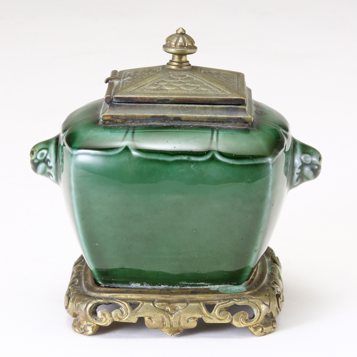 French Green Glazed earthenware Pottery Inkwell. Marked TH. Deck to the underside. Bronze mounts possibly F. Barbedienne. Rich color and nice form.