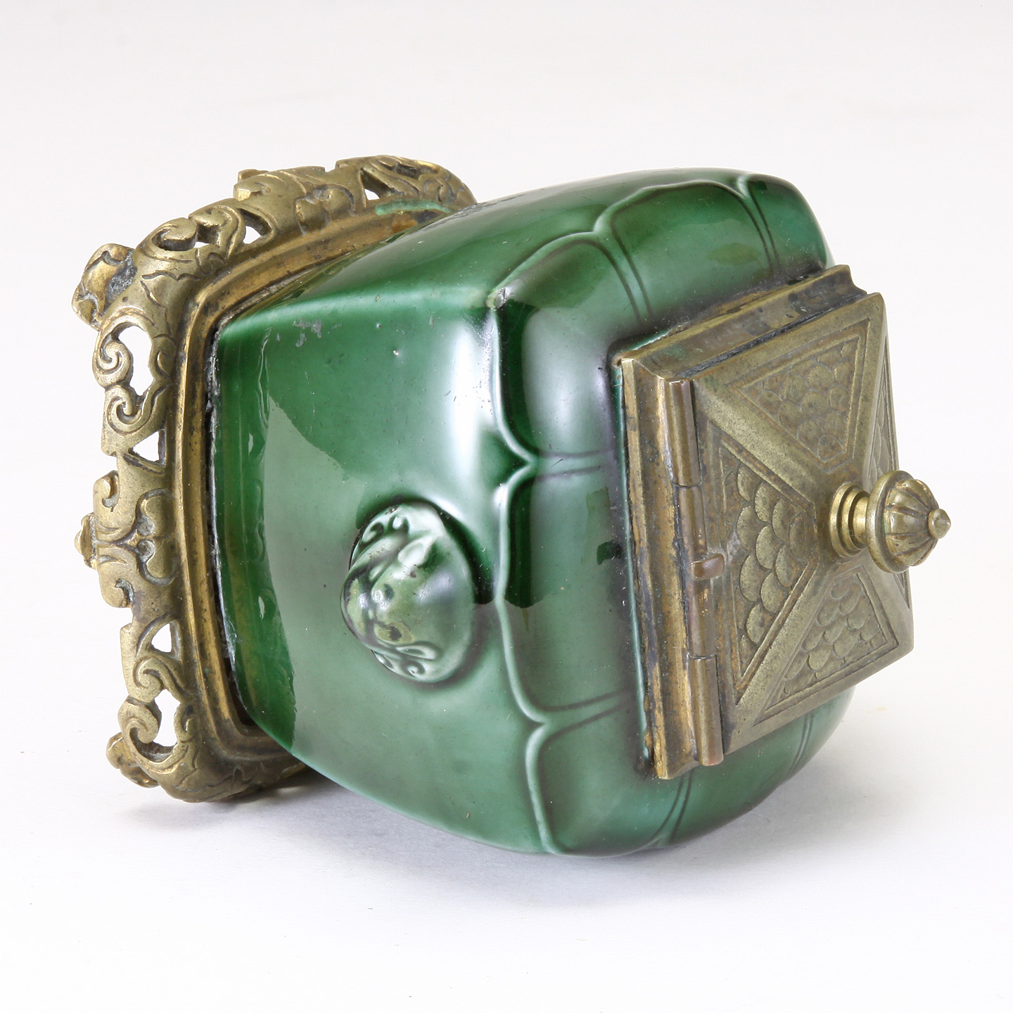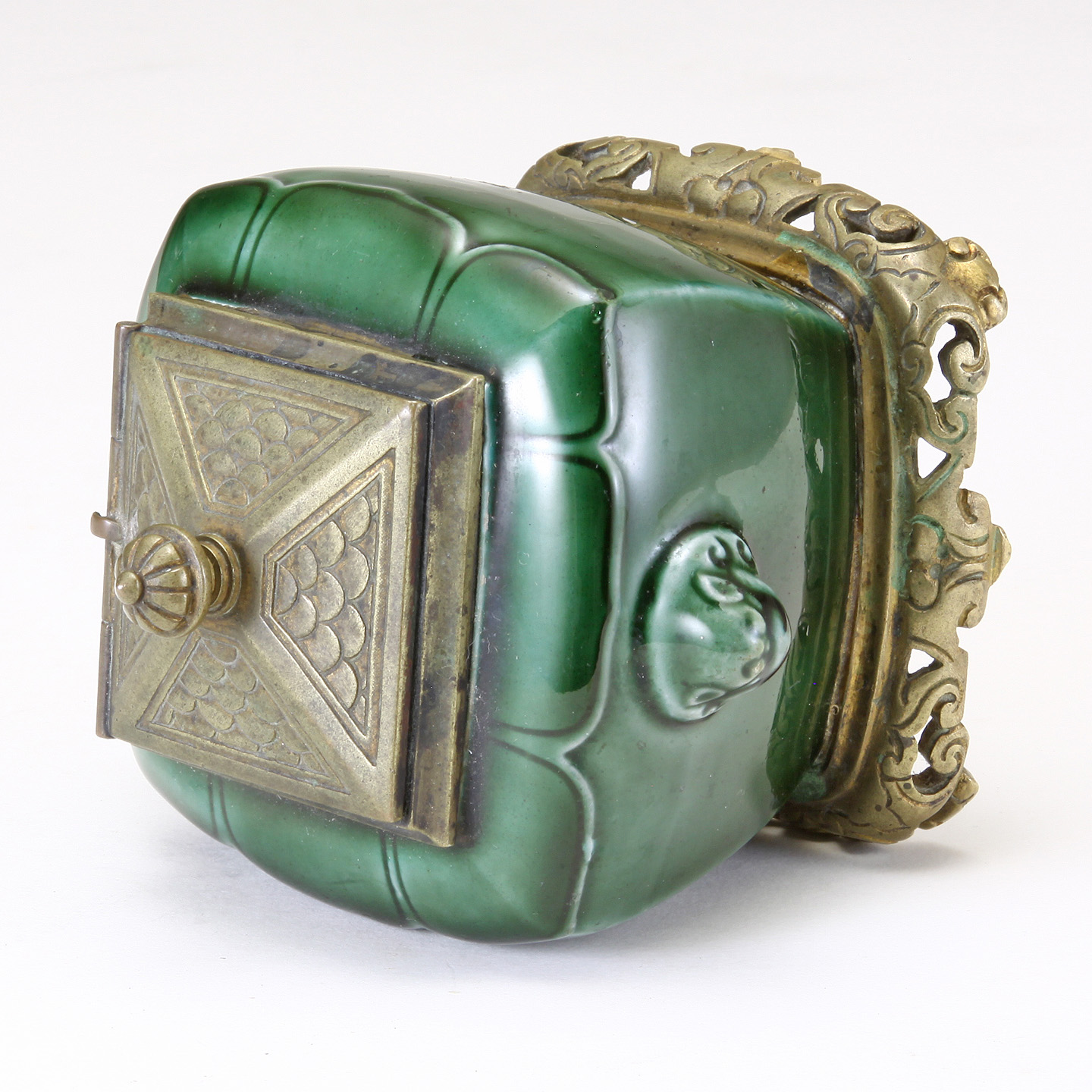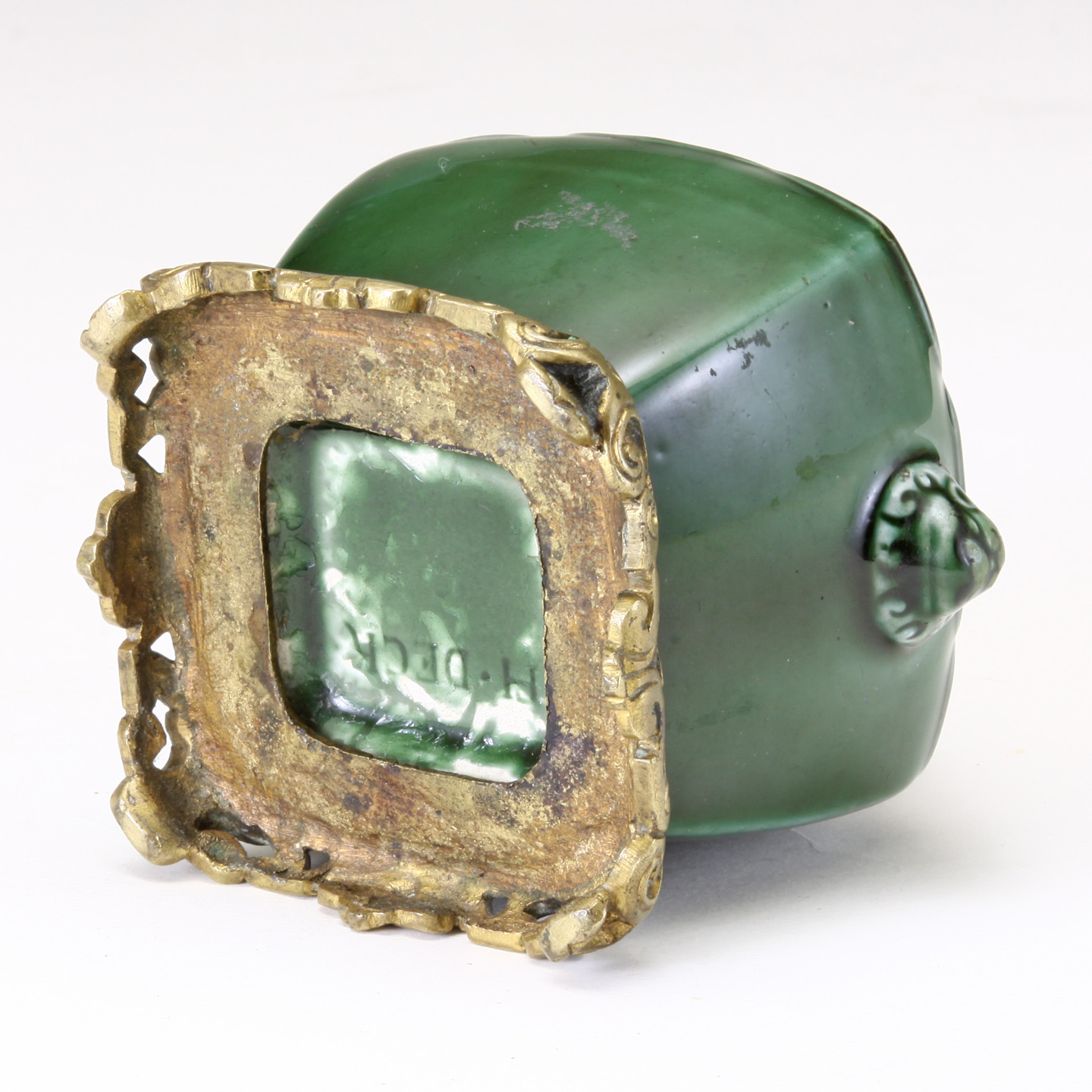 French Green Glazed earthenware Pottery Inkwell. Marked TH. Deck to the underside. Bronze mounts possibly F. Barbedienne. Rich color and nice form.