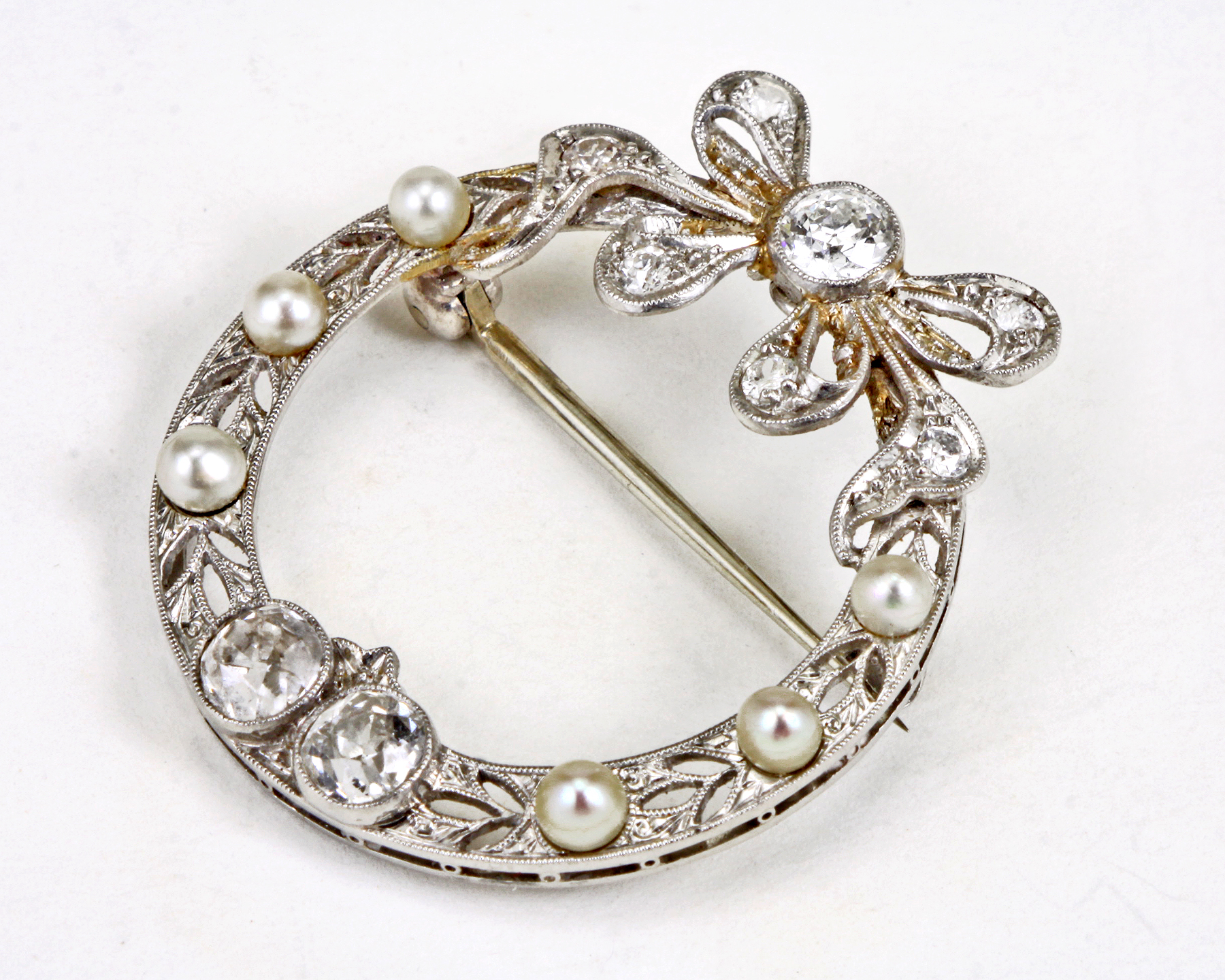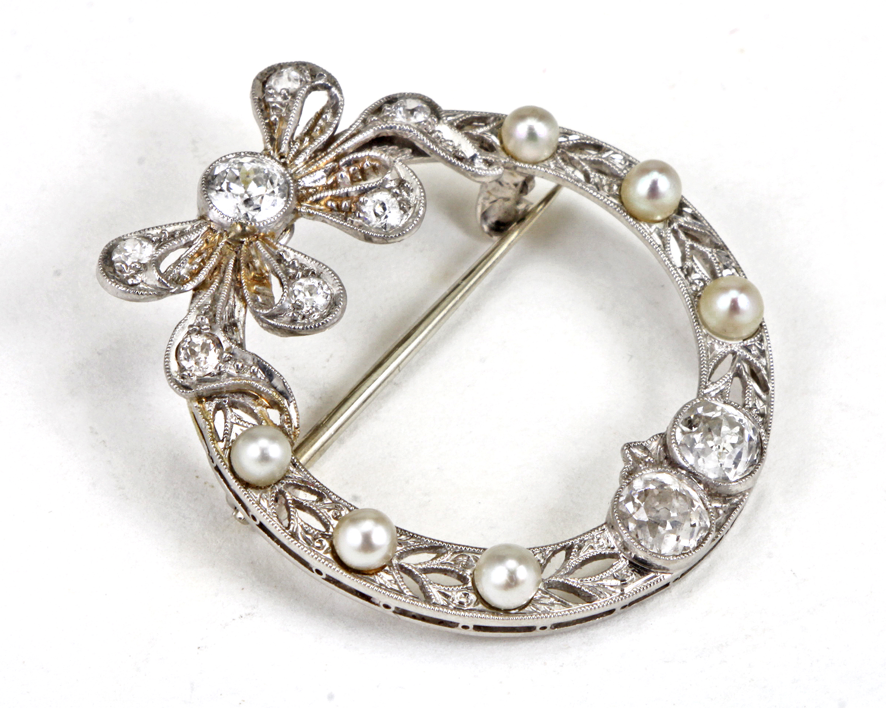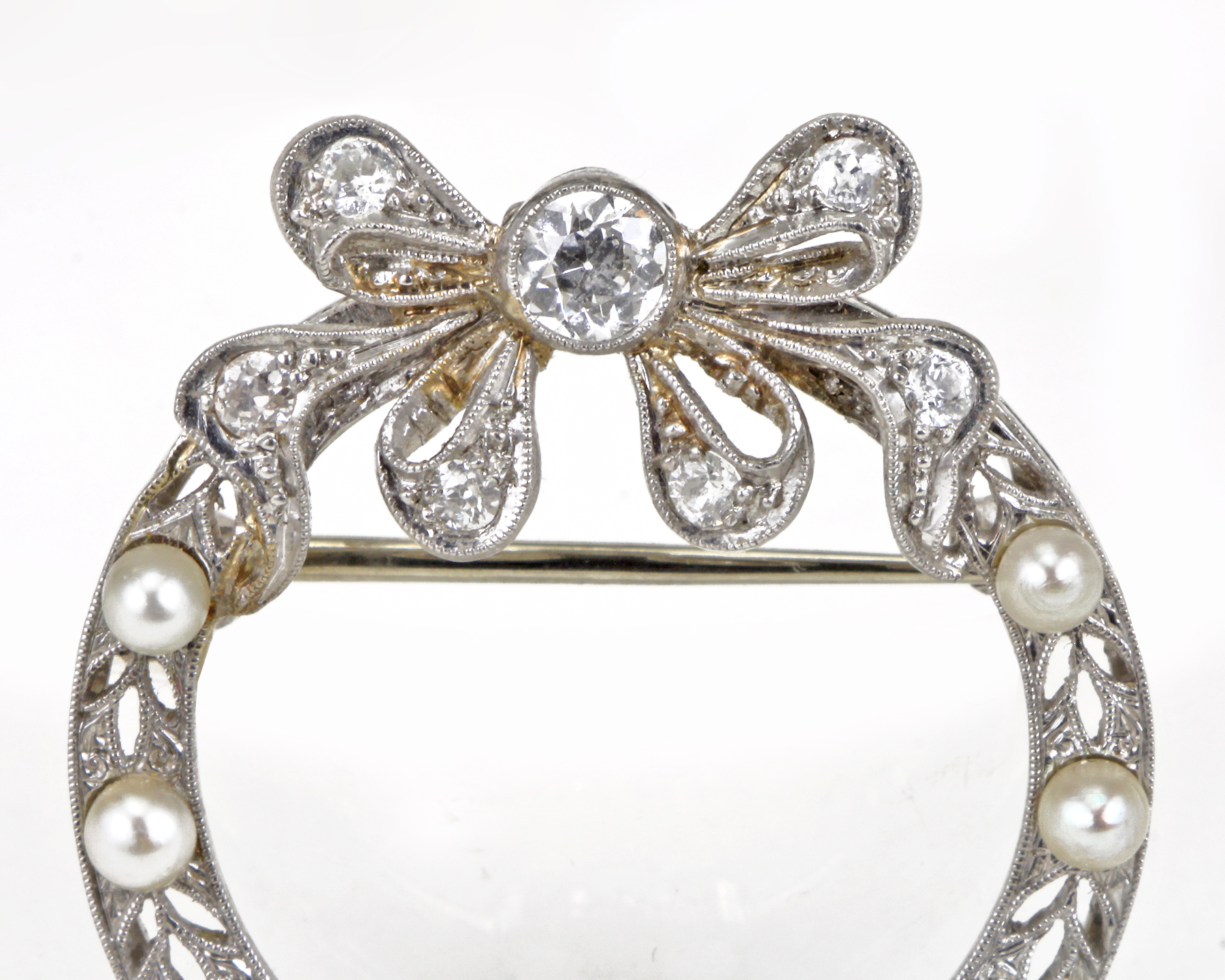 The brooch features a ribbon-esque open work design with millegrain accent featuring European cut diamonds weighing a total of approximately 1.14 carats, enhanced by round cultured pearls (with natural blemishes)
