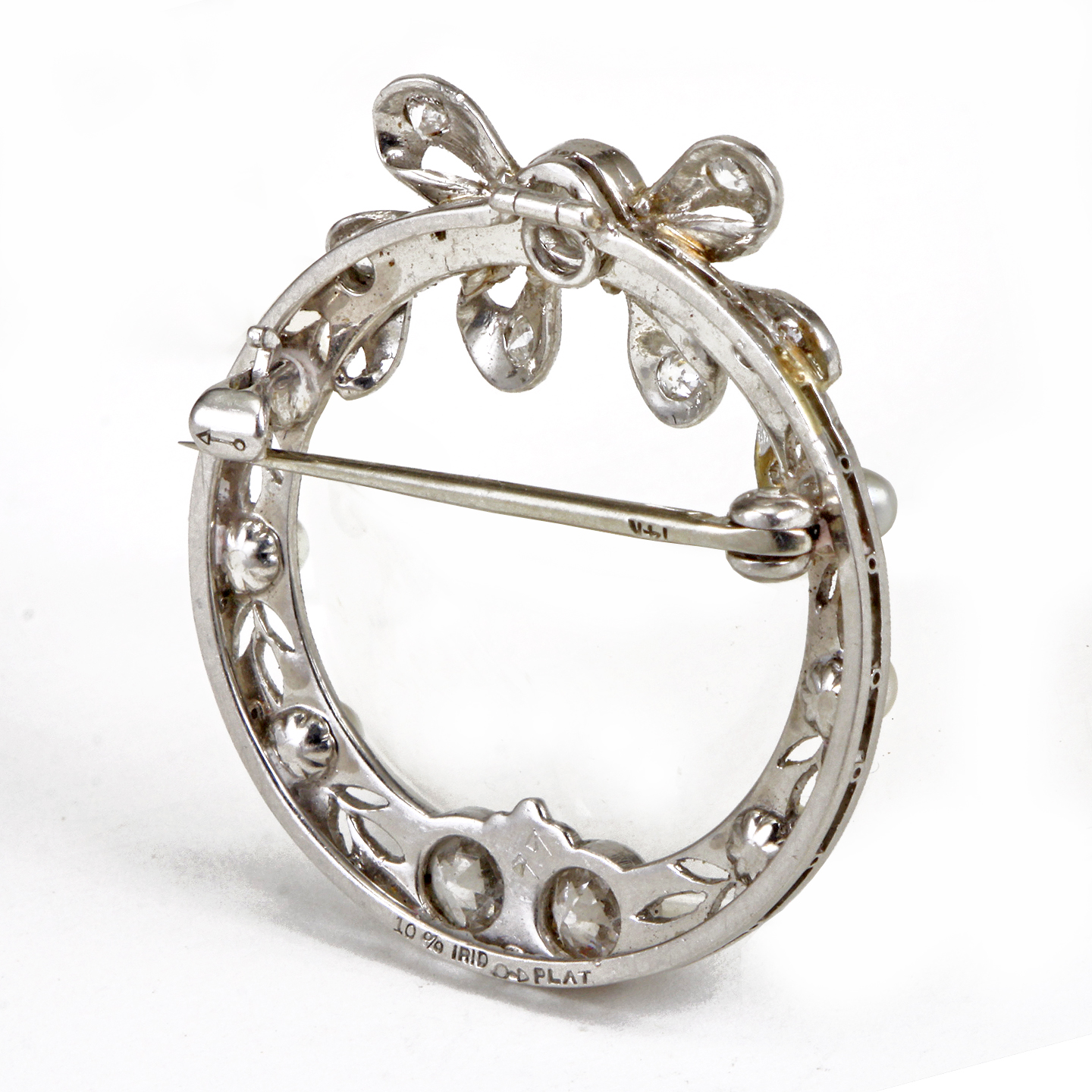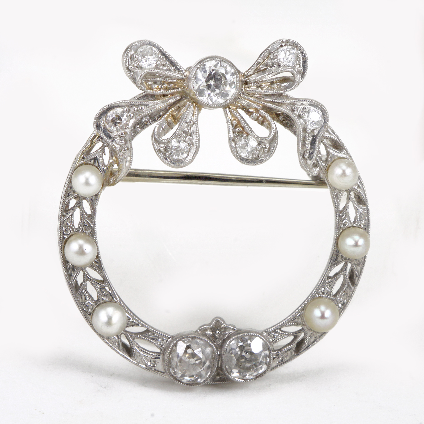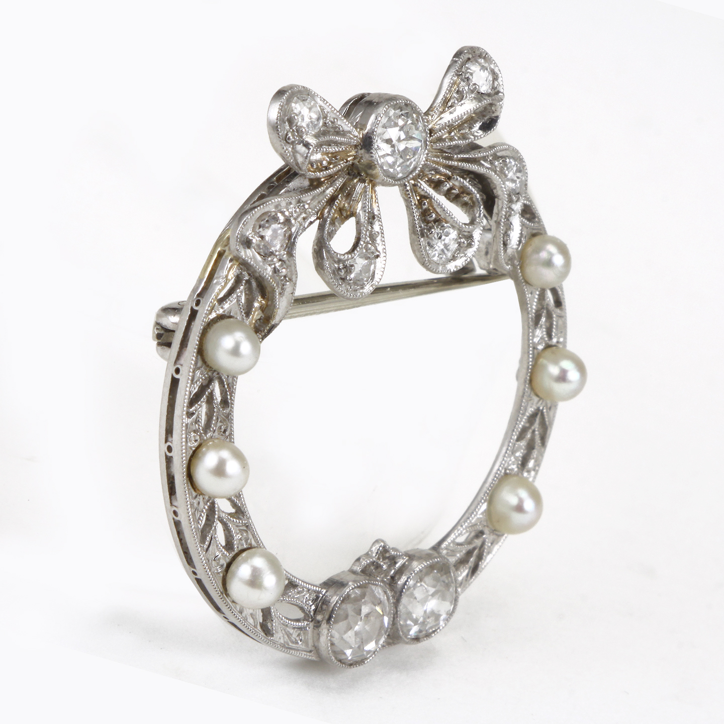 The brooch features a ribbon-esque open work design with millegrain accent featuring European cut diamonds weighing a total of approximately 1.14 carats, enhanced by round cultured pearls (with natural blemishes)