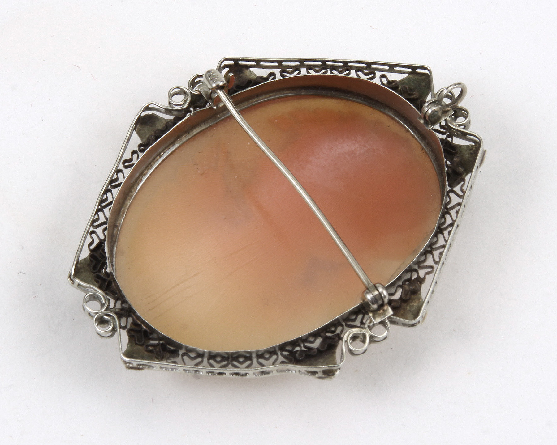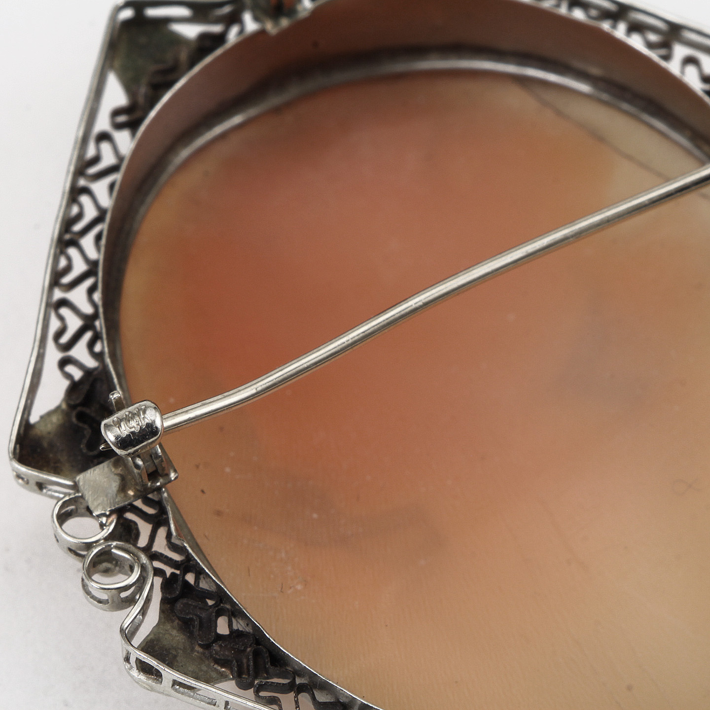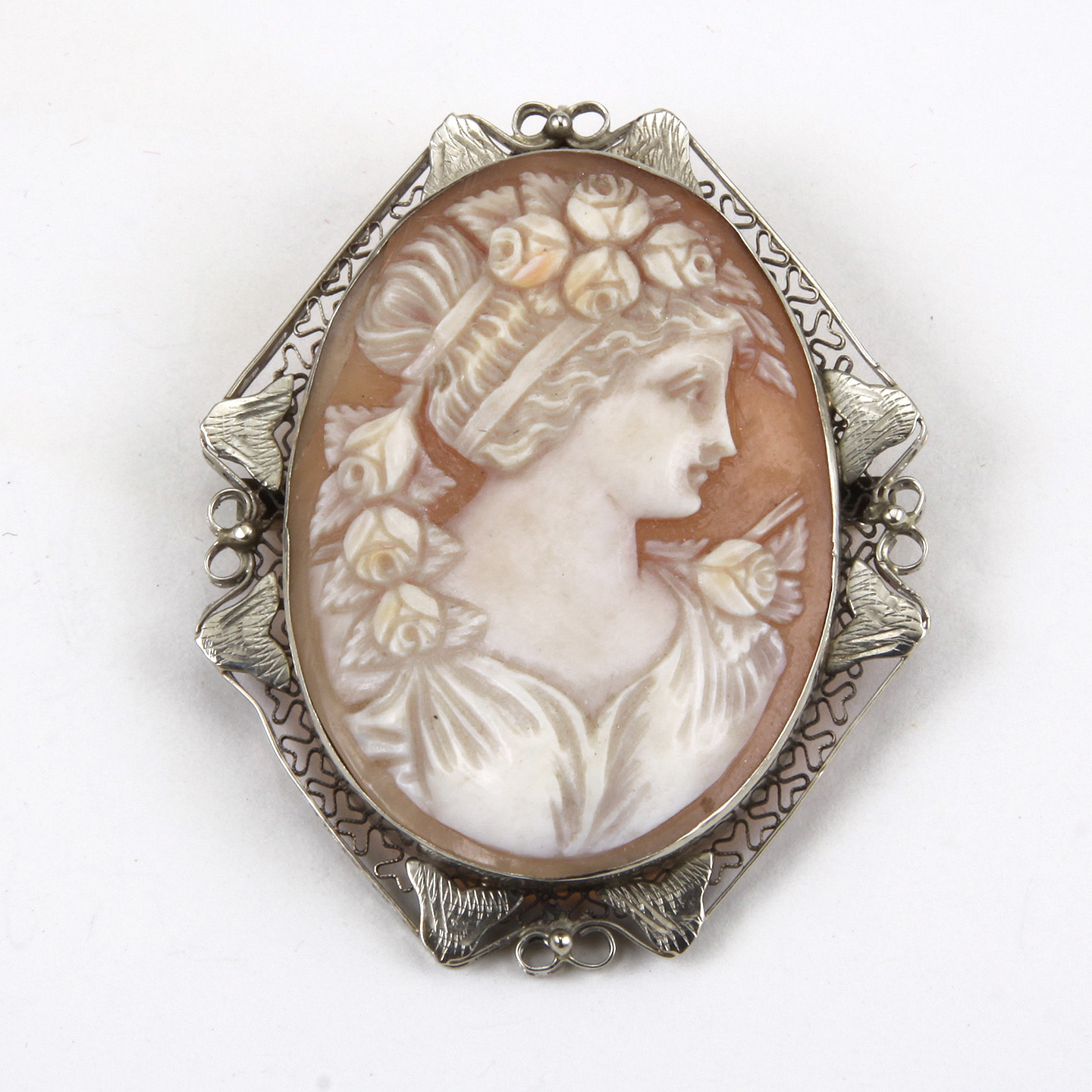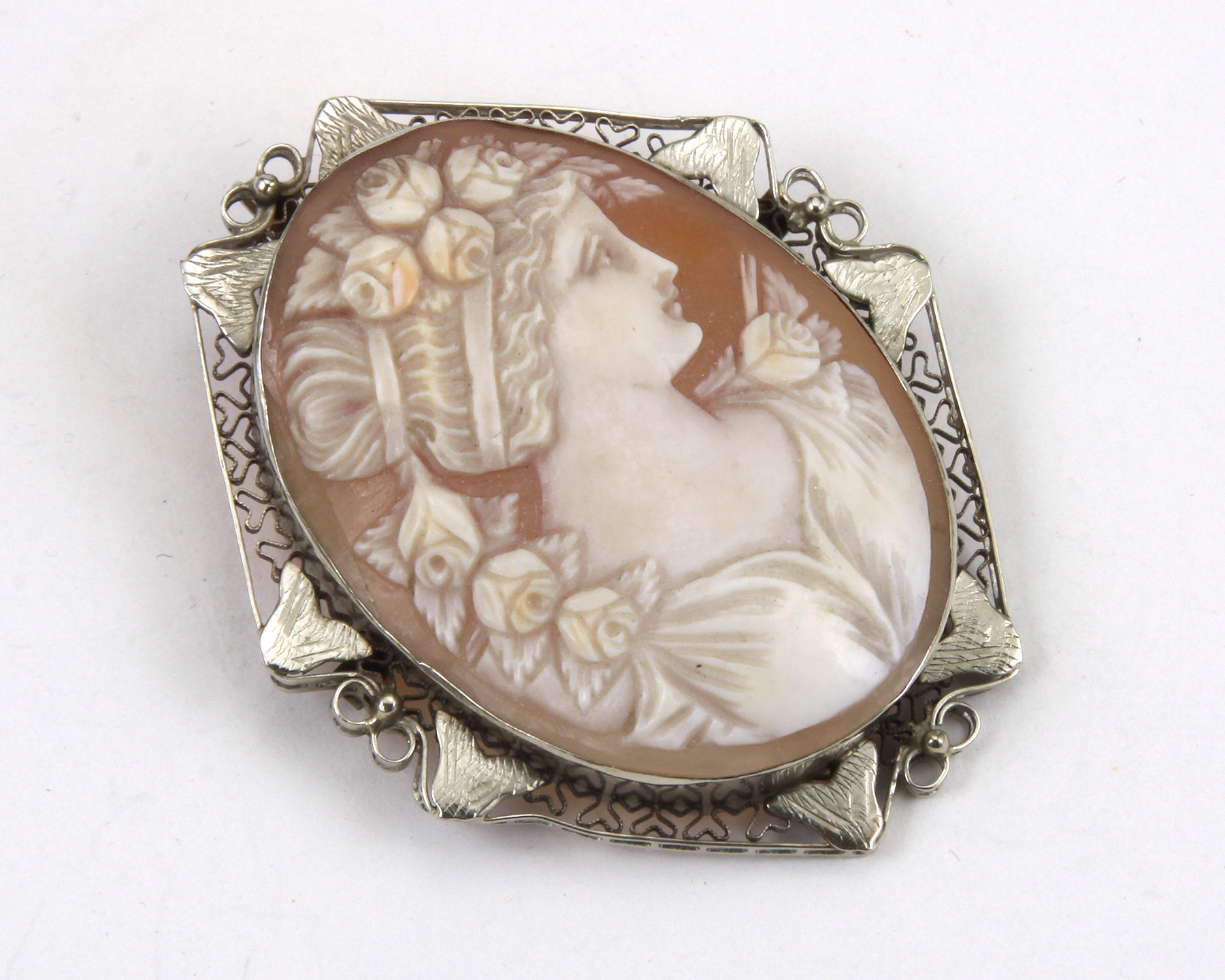 Lot Note(s): With a curly up-do, flowers and feathers in the hair. Completed by pinstem and catch, as well as a bail for pendant use.