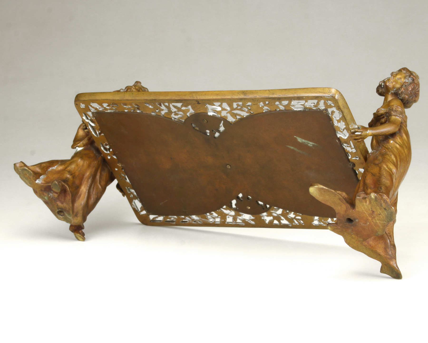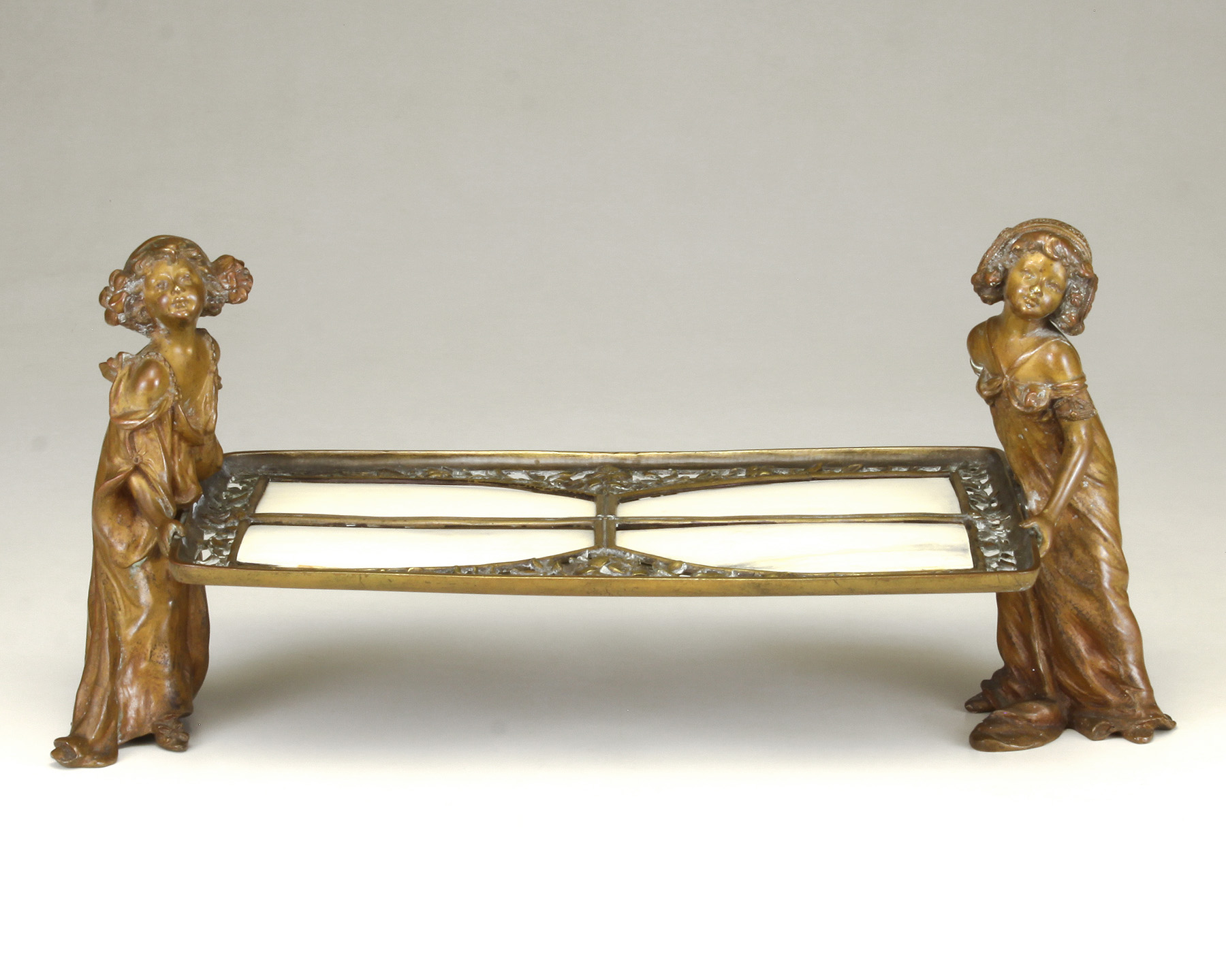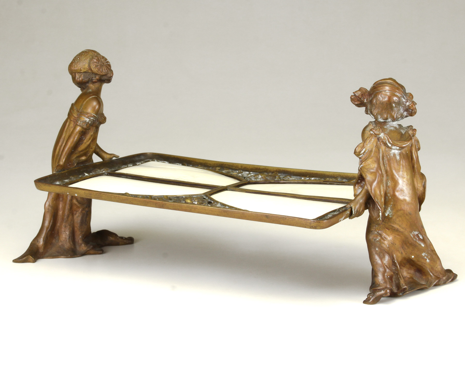 Lot Note(s): A pair of young girls holding a reticulated bronze tray/holder inset with celluloid shaped panels, reddish brown patina to figures. Circa 1895