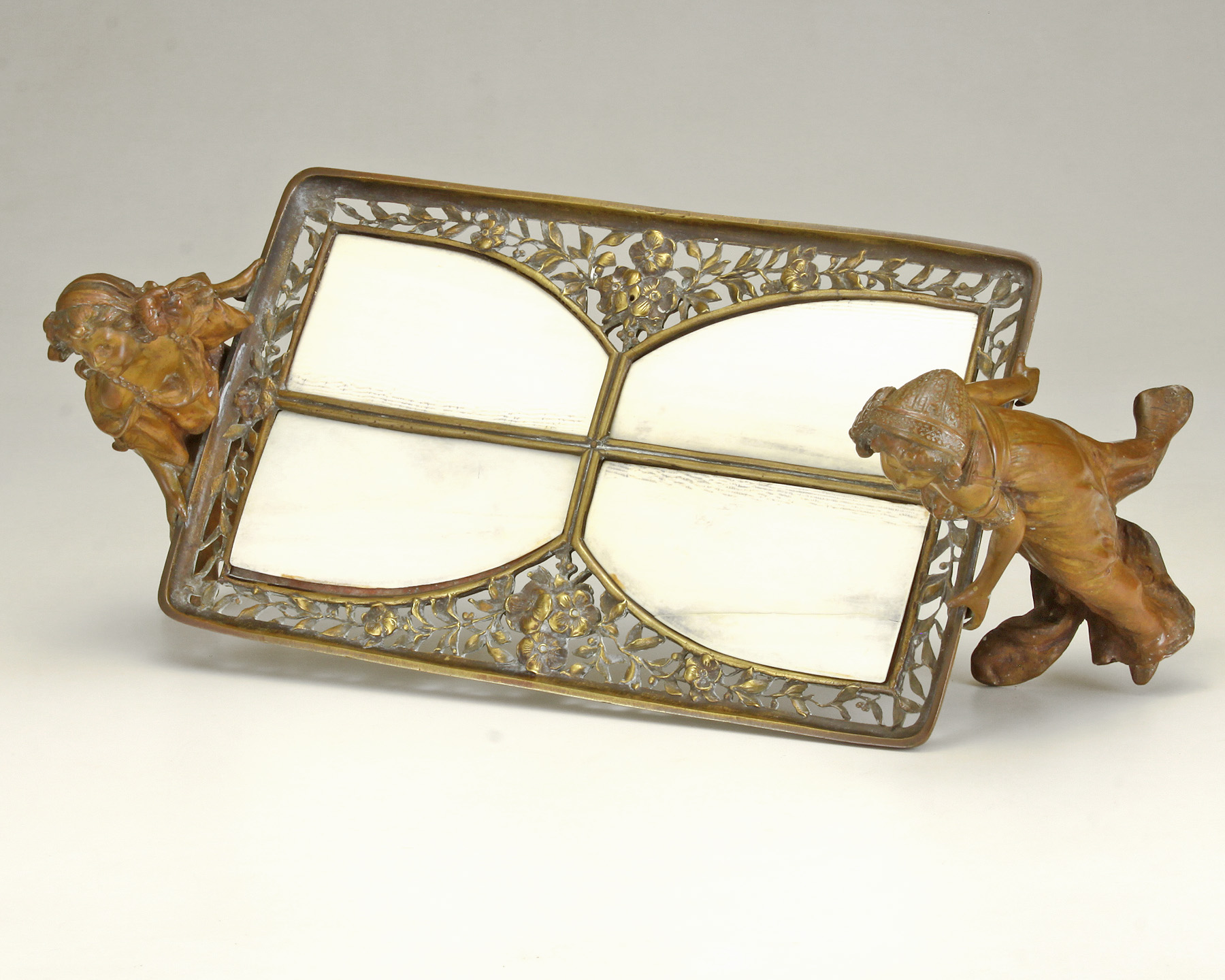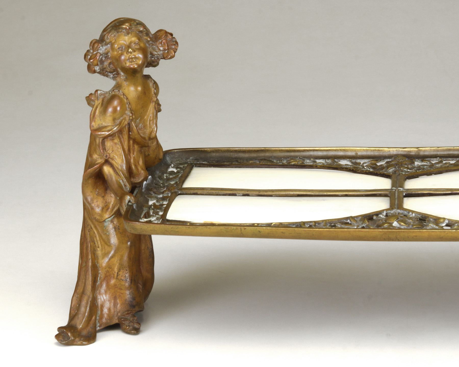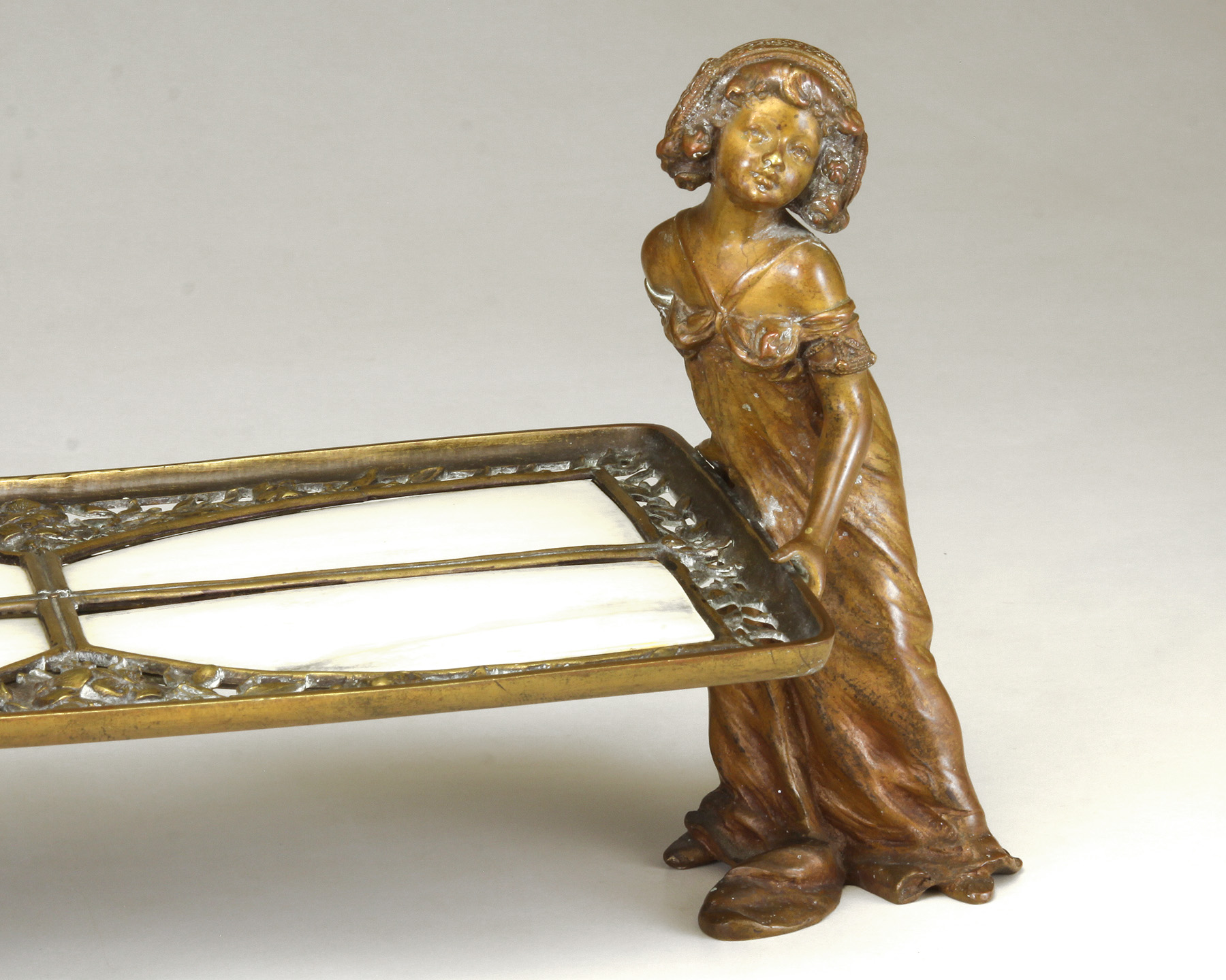 Lot Note(s): A pair of young girls holding a reticulated bronze tray/holder inset with celluloid shaped panels, reddish brown patina to figures. Circa 1895