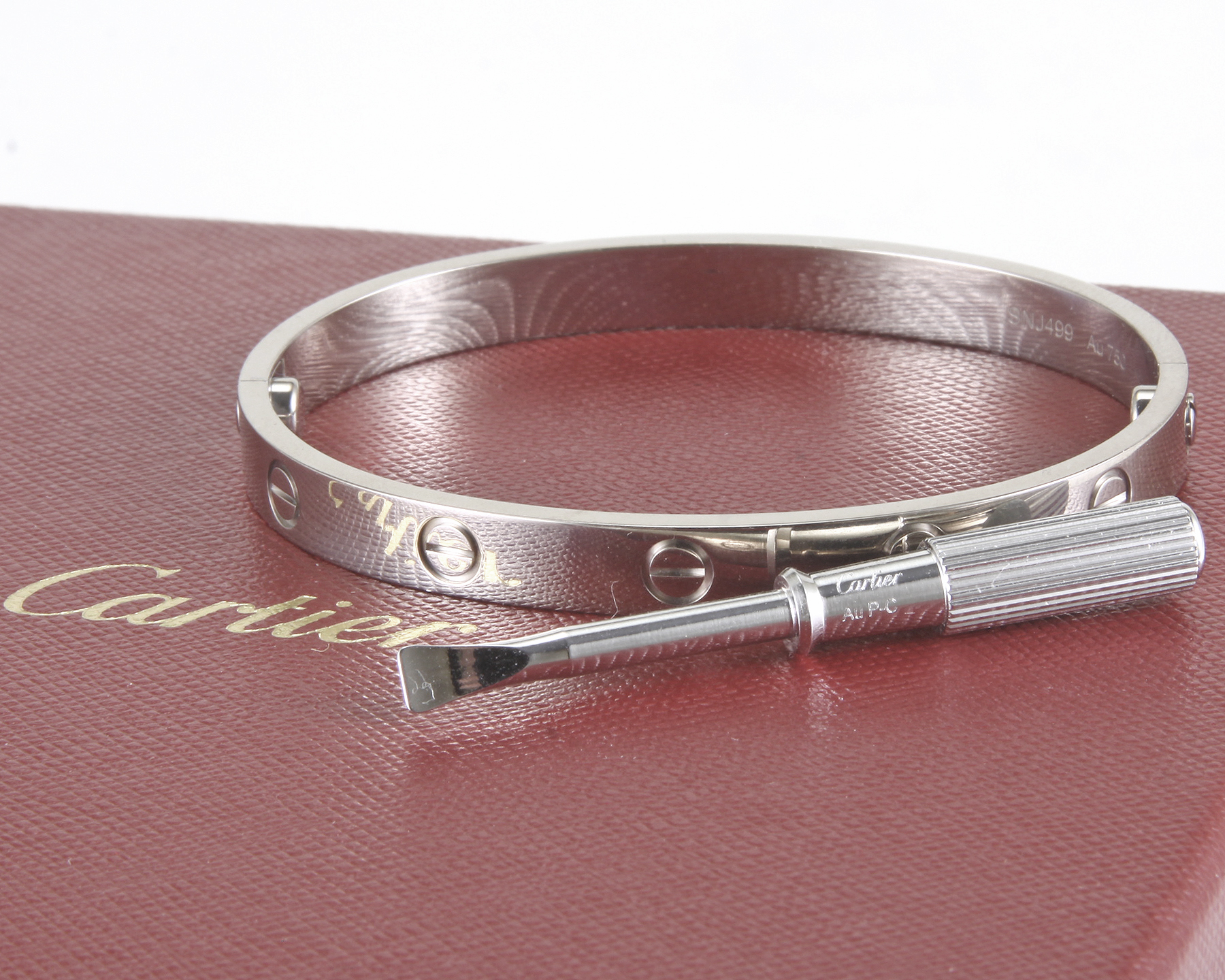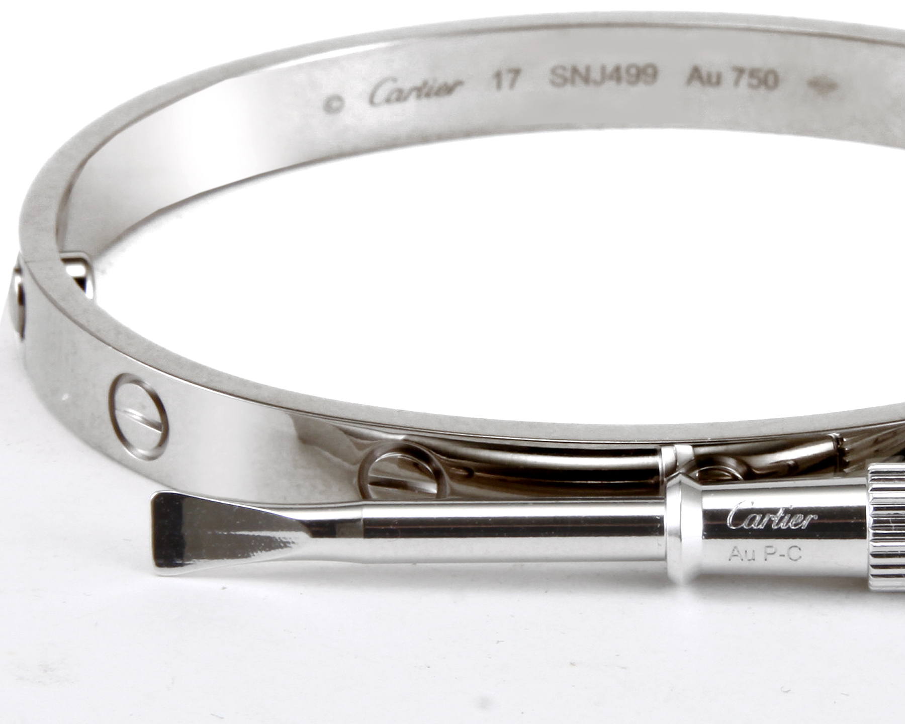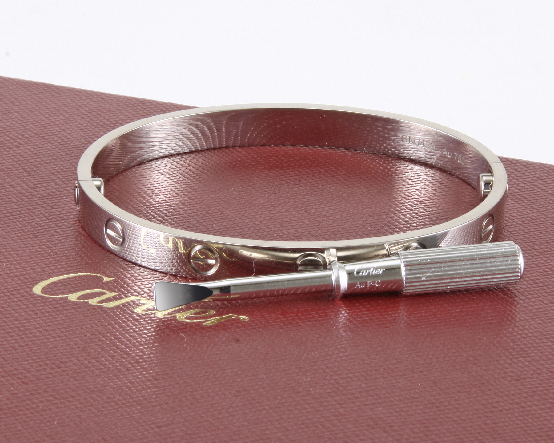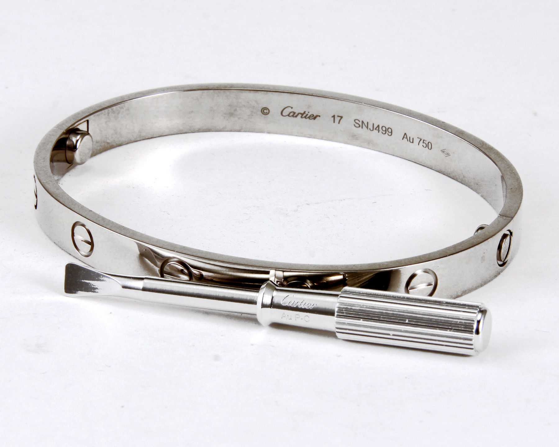 Authentic Cartier Love bracelet crafted in 18 karat White gold. Designed by Aldo Cipullo in 1969, the Cartier Love bracelet remains a timeless symbol of everlasting love. The iconic bracelet is accompanied by a Cartier 18kt gold screwdriver to secure it on to your wrist.