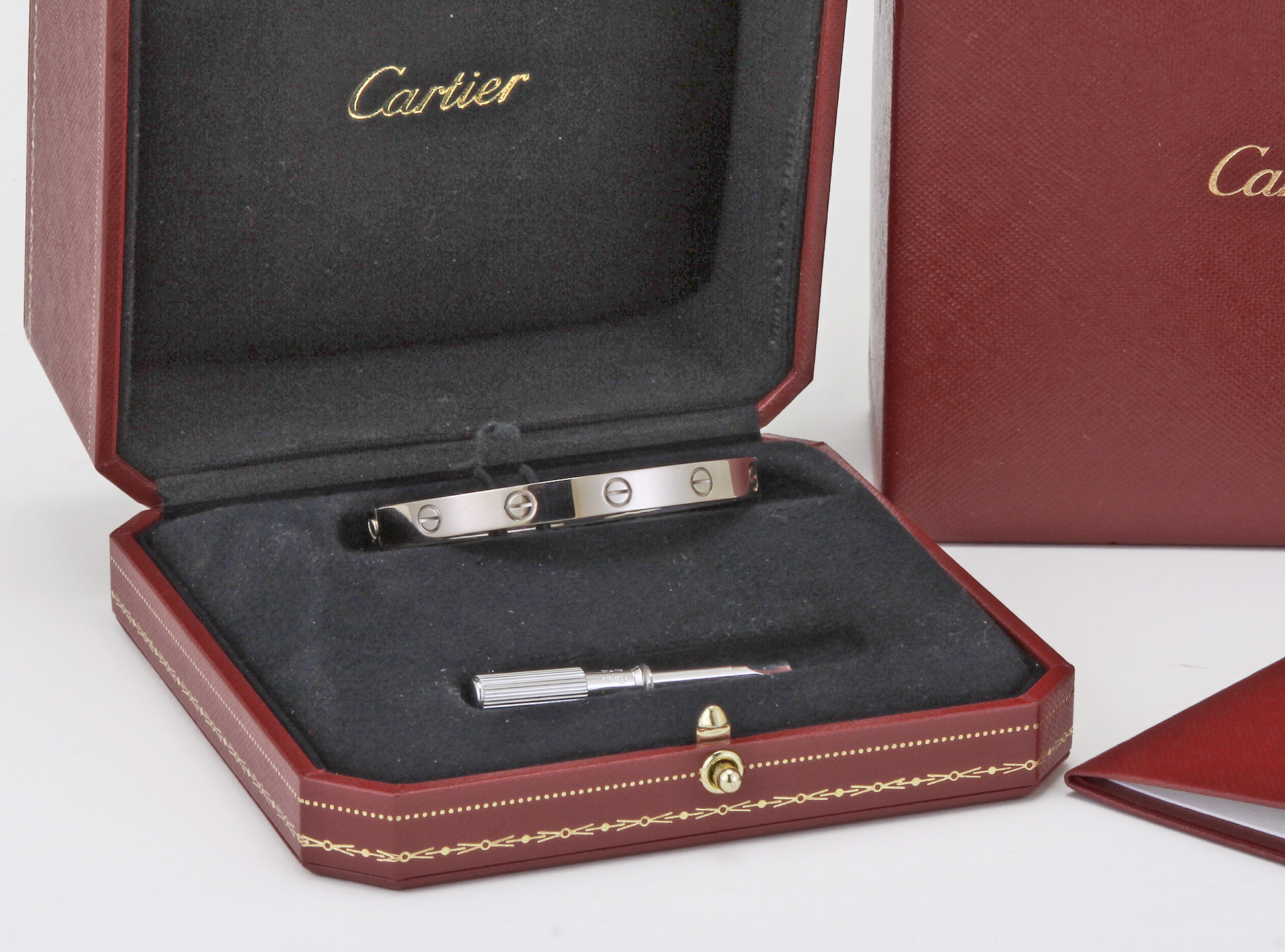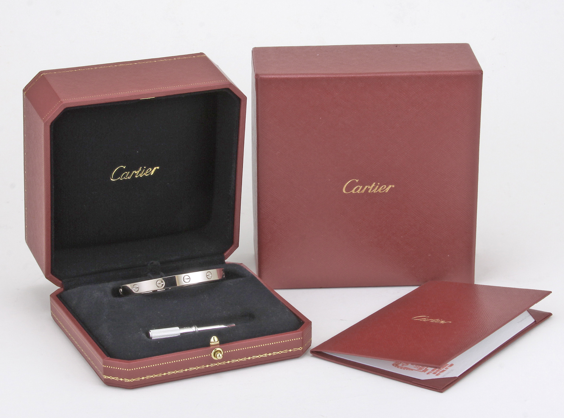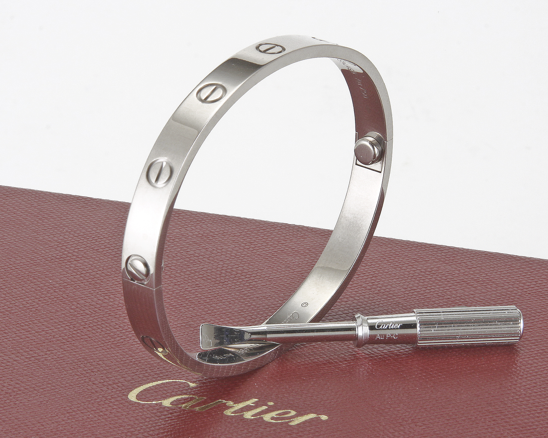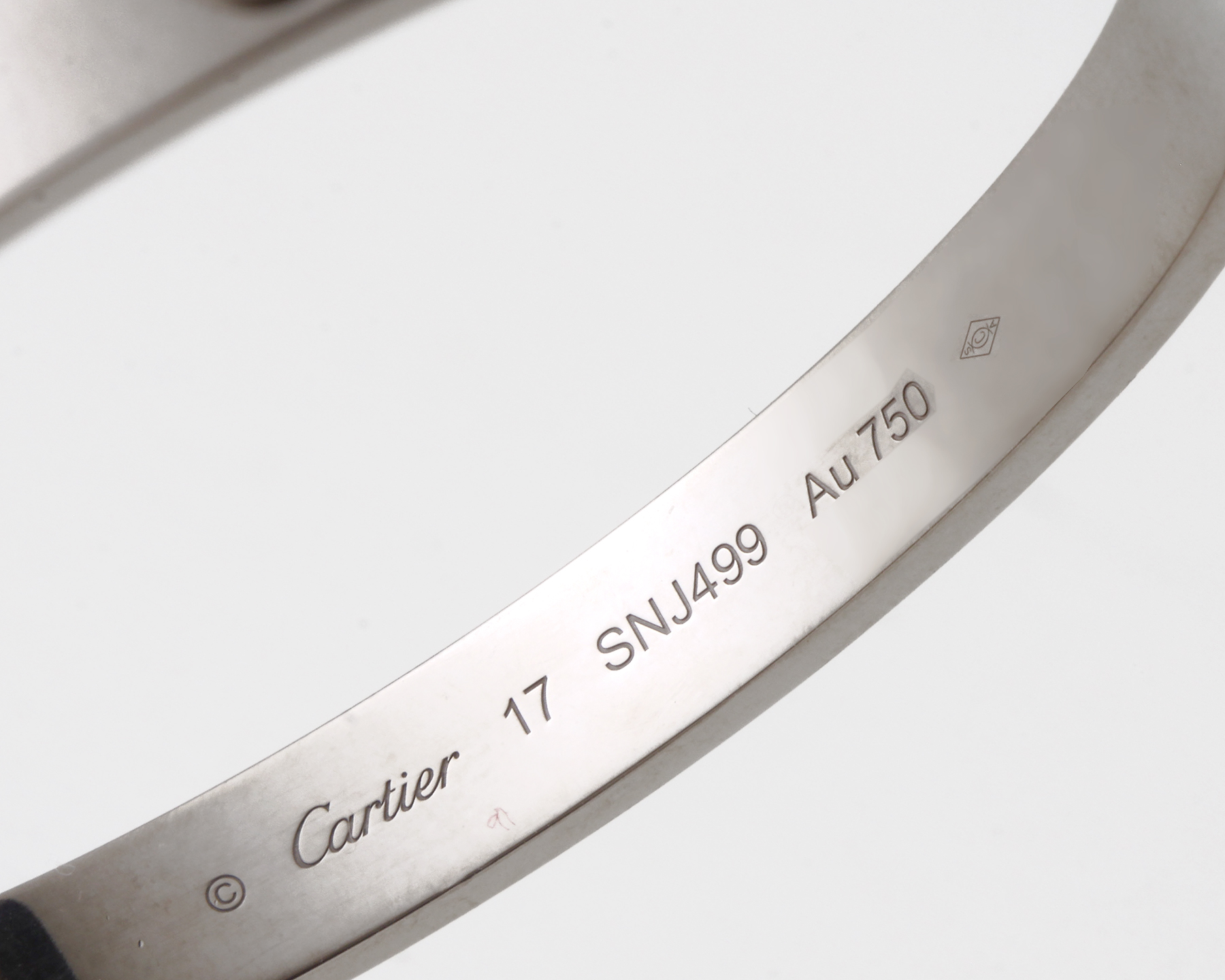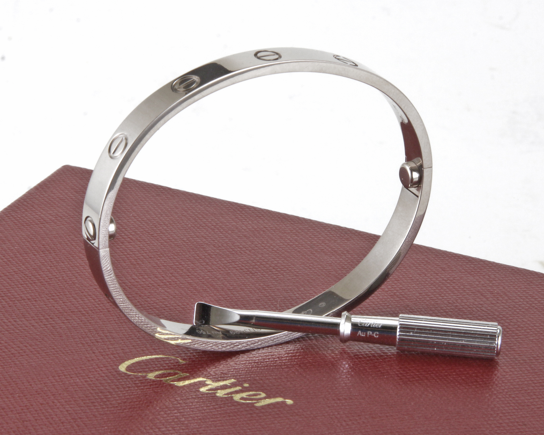 Authentic Cartier Love bracelet crafted in 18 karat White gold. Designed by Aldo Cipullo in 1969, the Cartier Love bracelet remains a timeless symbol of everlasting love. The iconic bracelet is accompanied by a Cartier 18kt gold screwdriver to secure it on to your wrist.