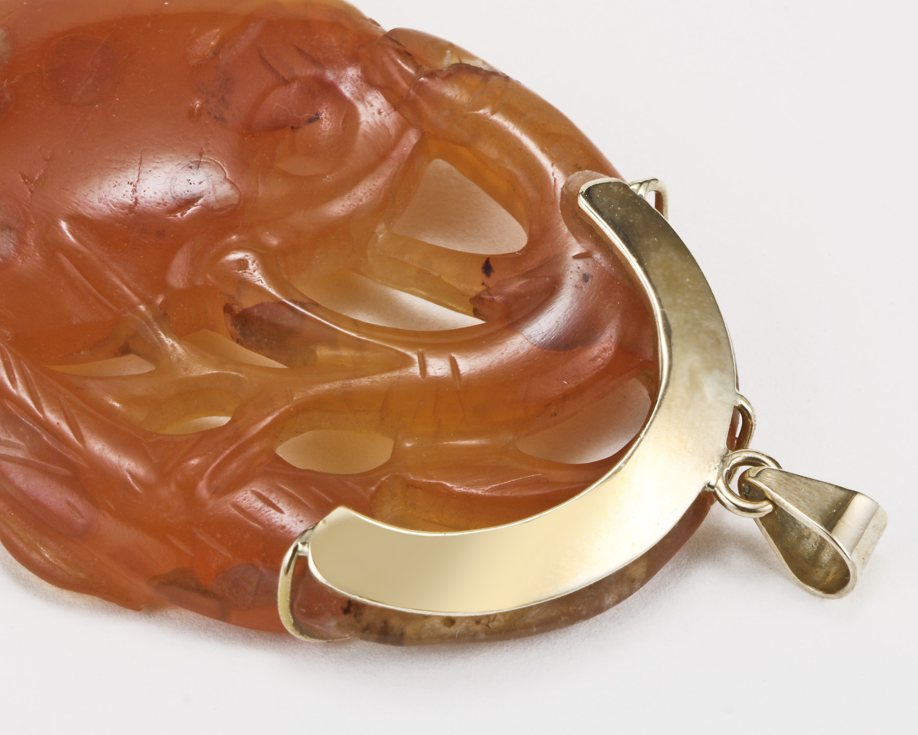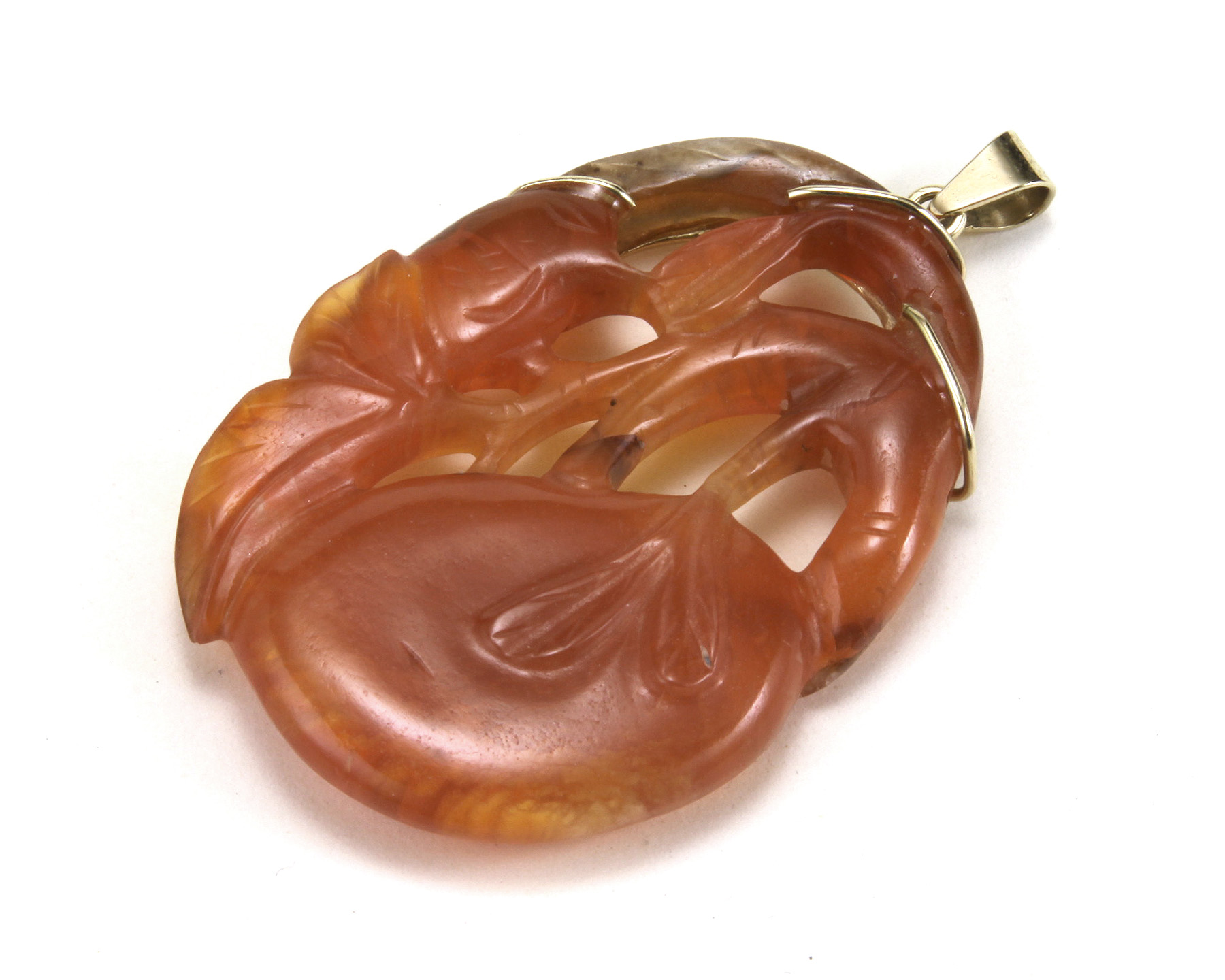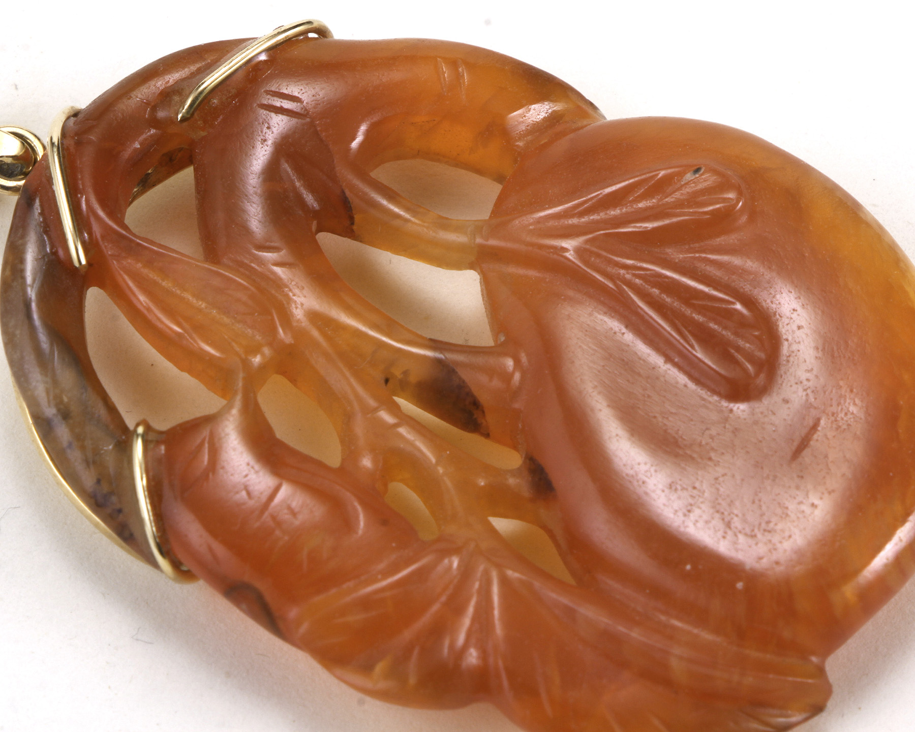 Chinese “Qing Su Zhou” school carved agate pendant, depicting Gish and lotus, having 14K gold shoulder and bail.