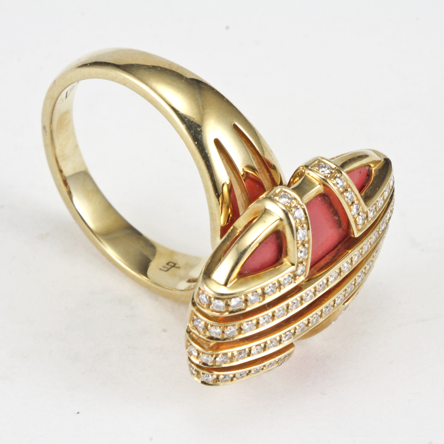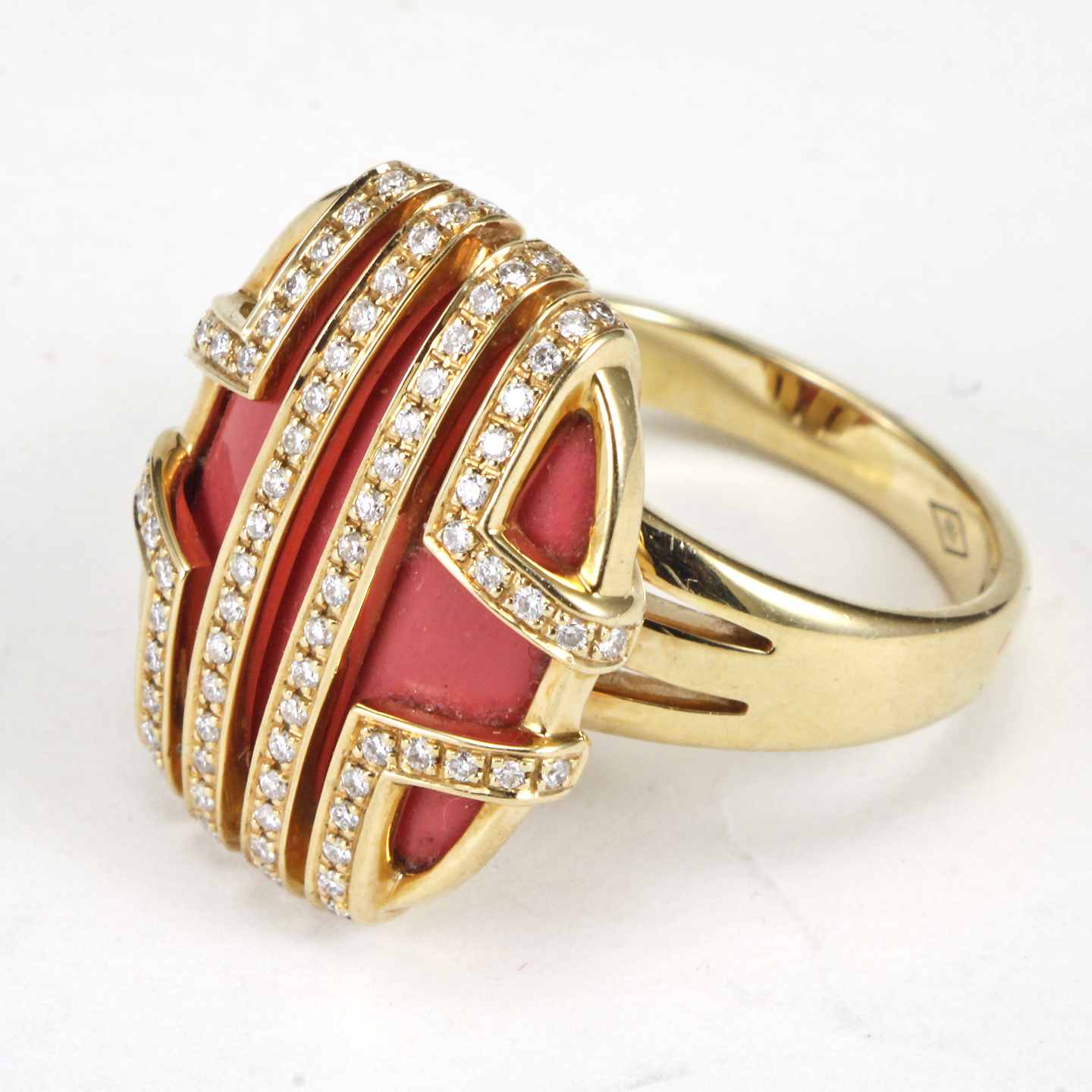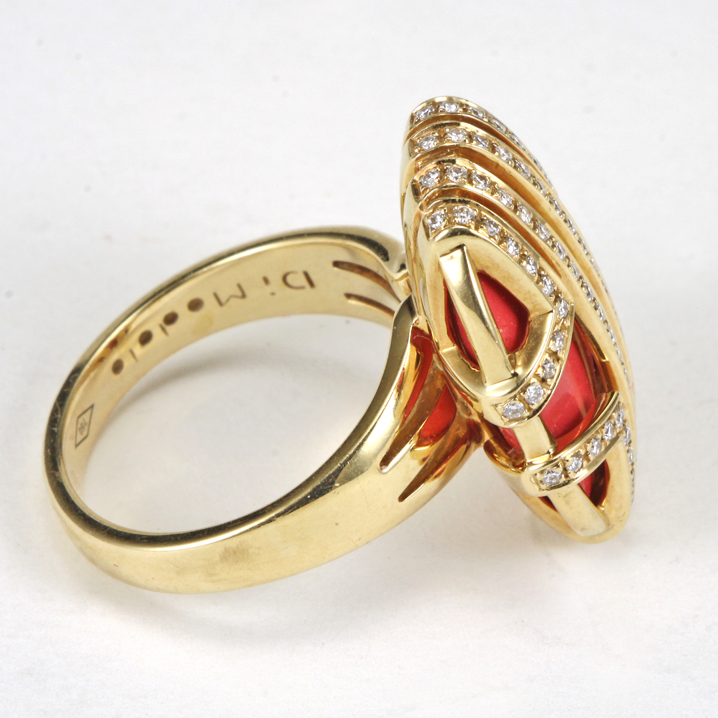 DI MODOLO, REDDISH PINKISH WHITISH CORAL, DIAMOND AND 18KT GOLD COCKTAIL RING.