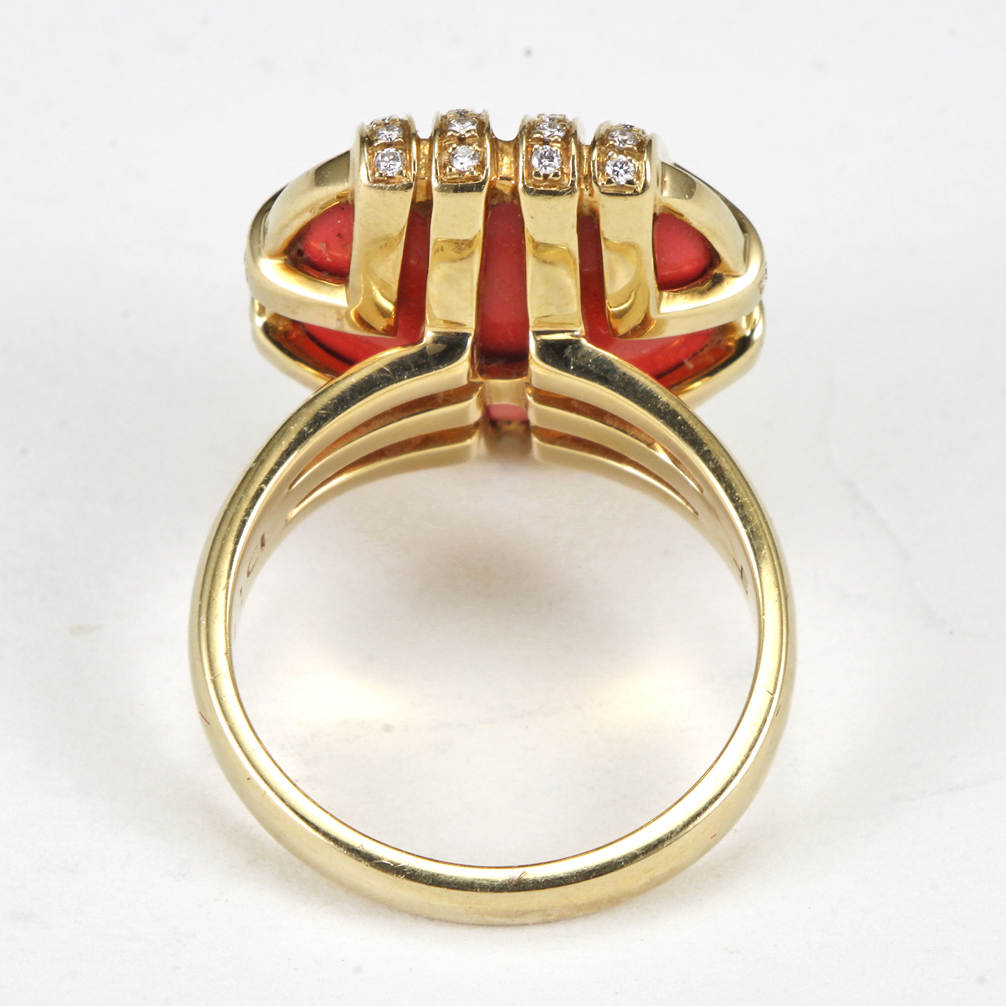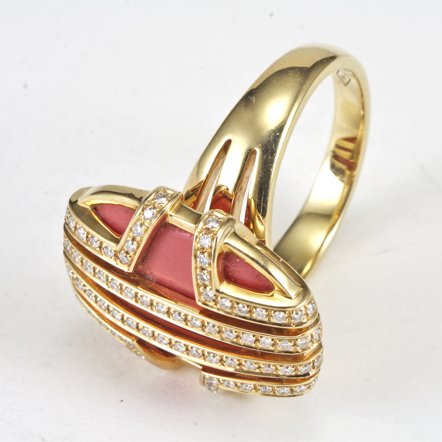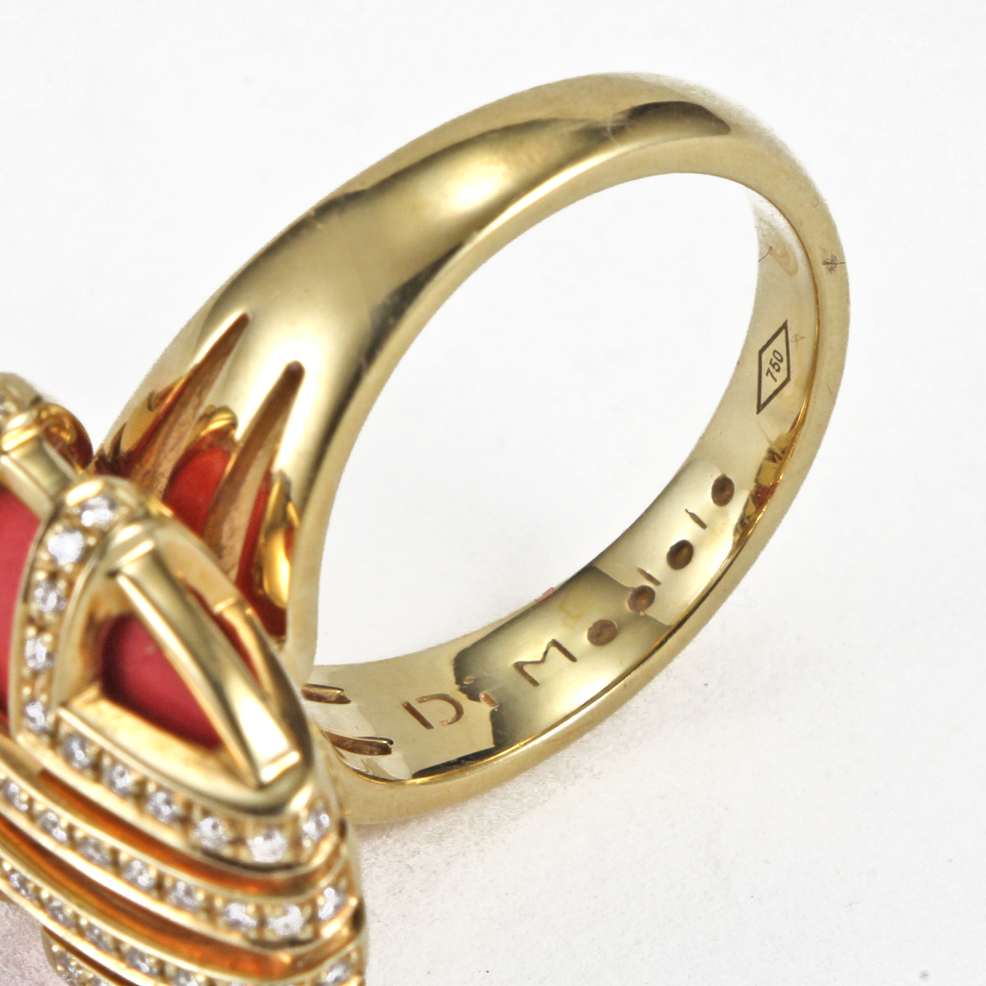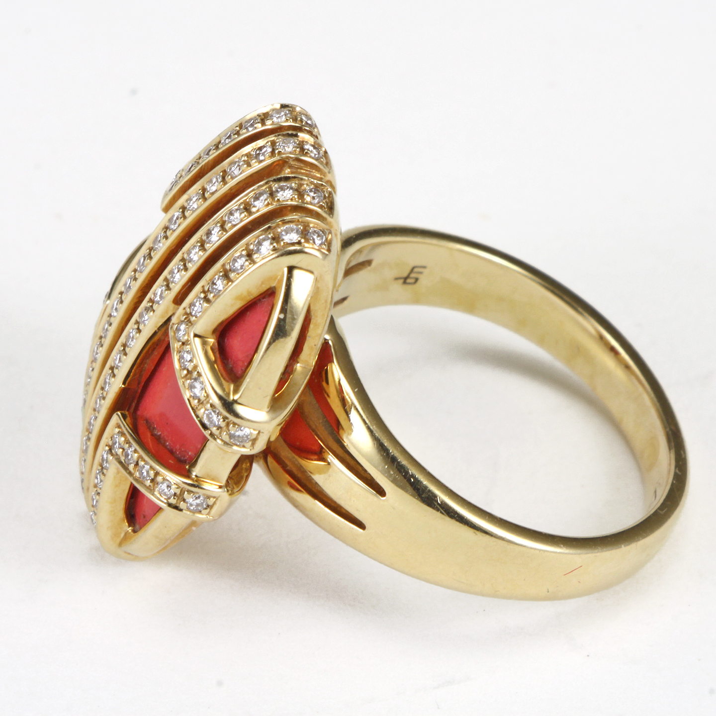 DI MODOLO, REDDISH PINKISH WHITISH CORAL, DIAMOND AND 18KT GOLD COCKTAIL RING.