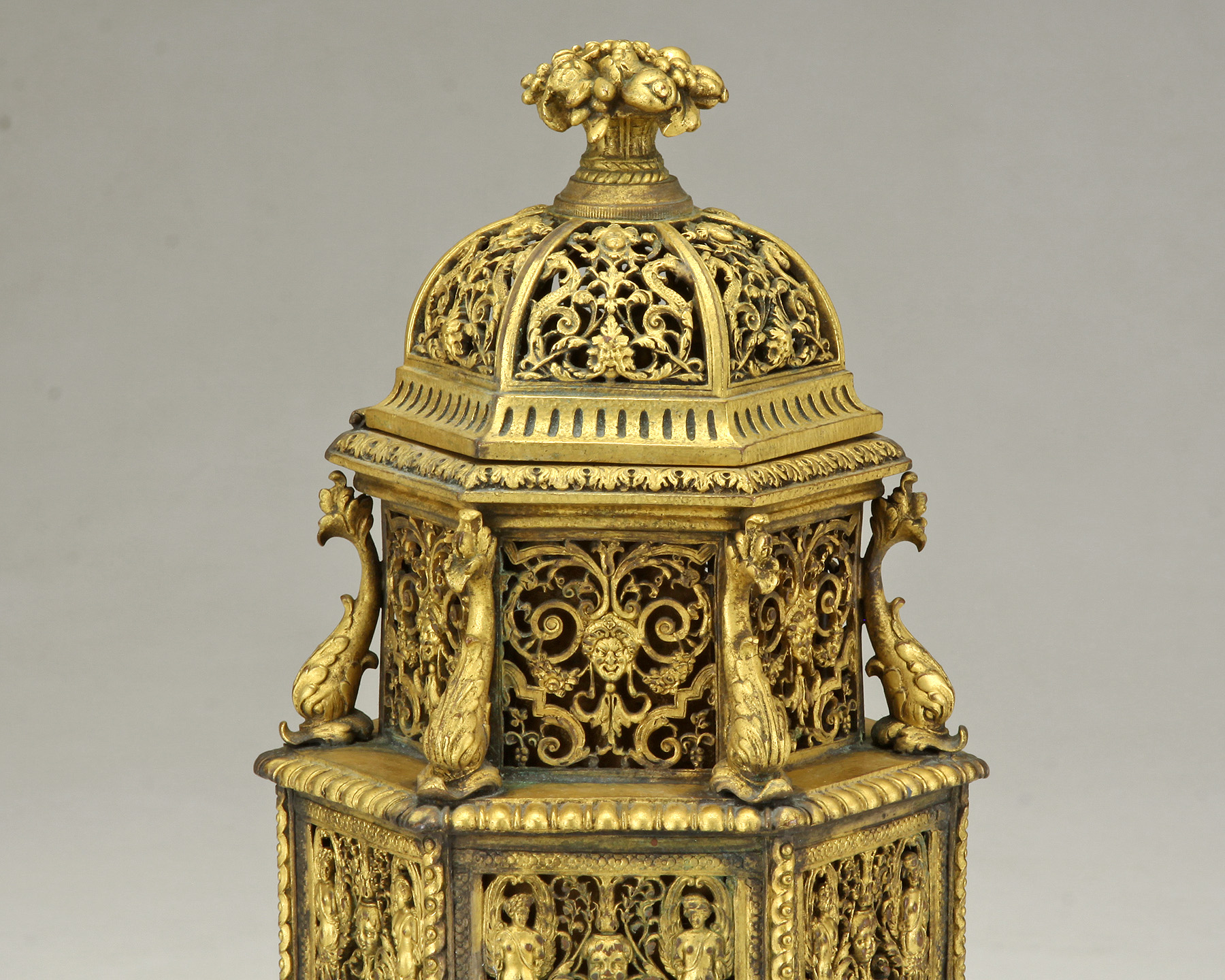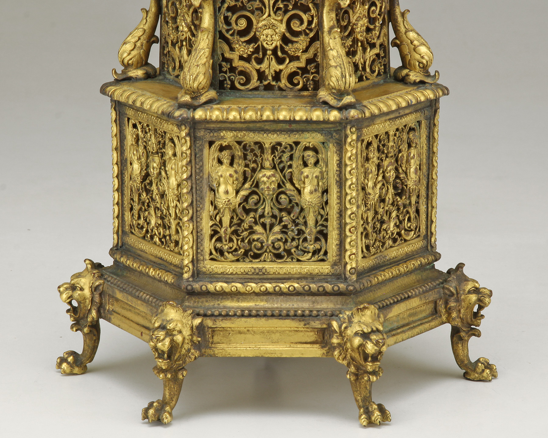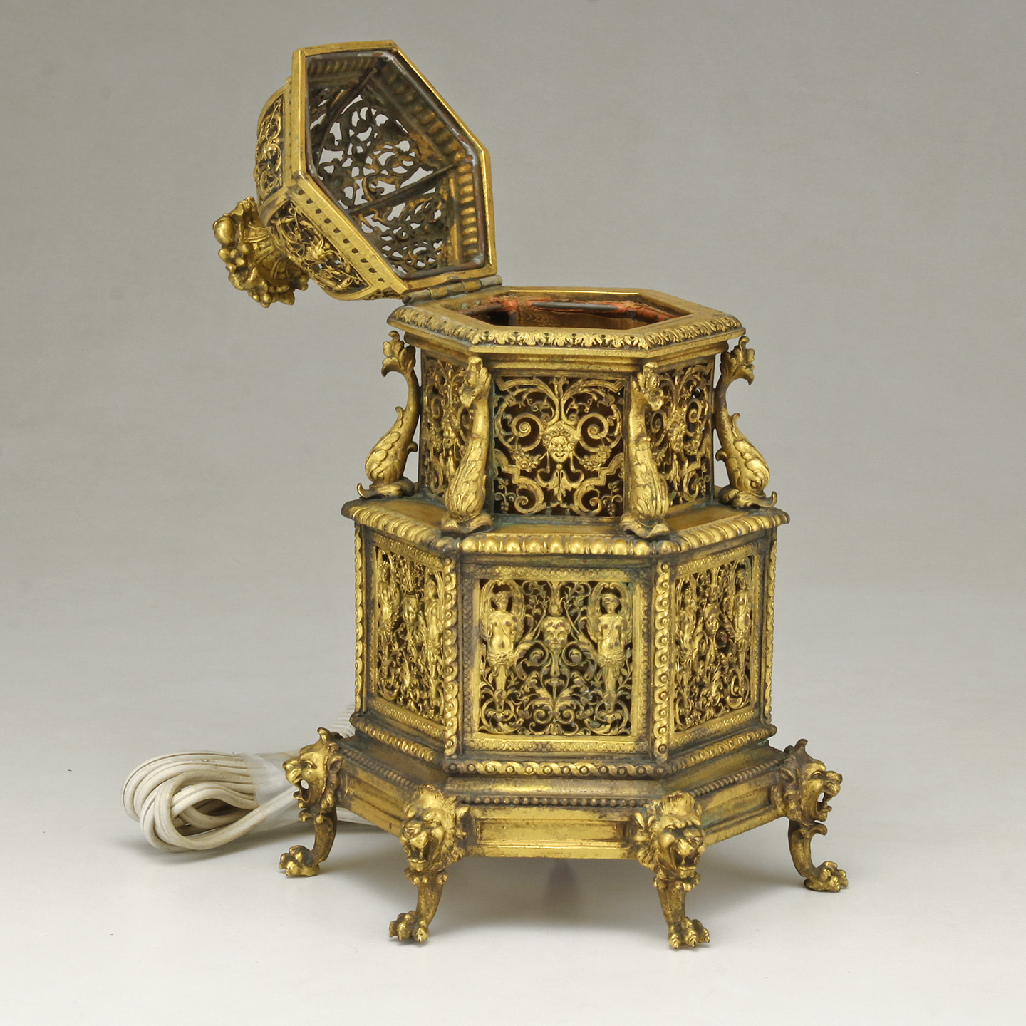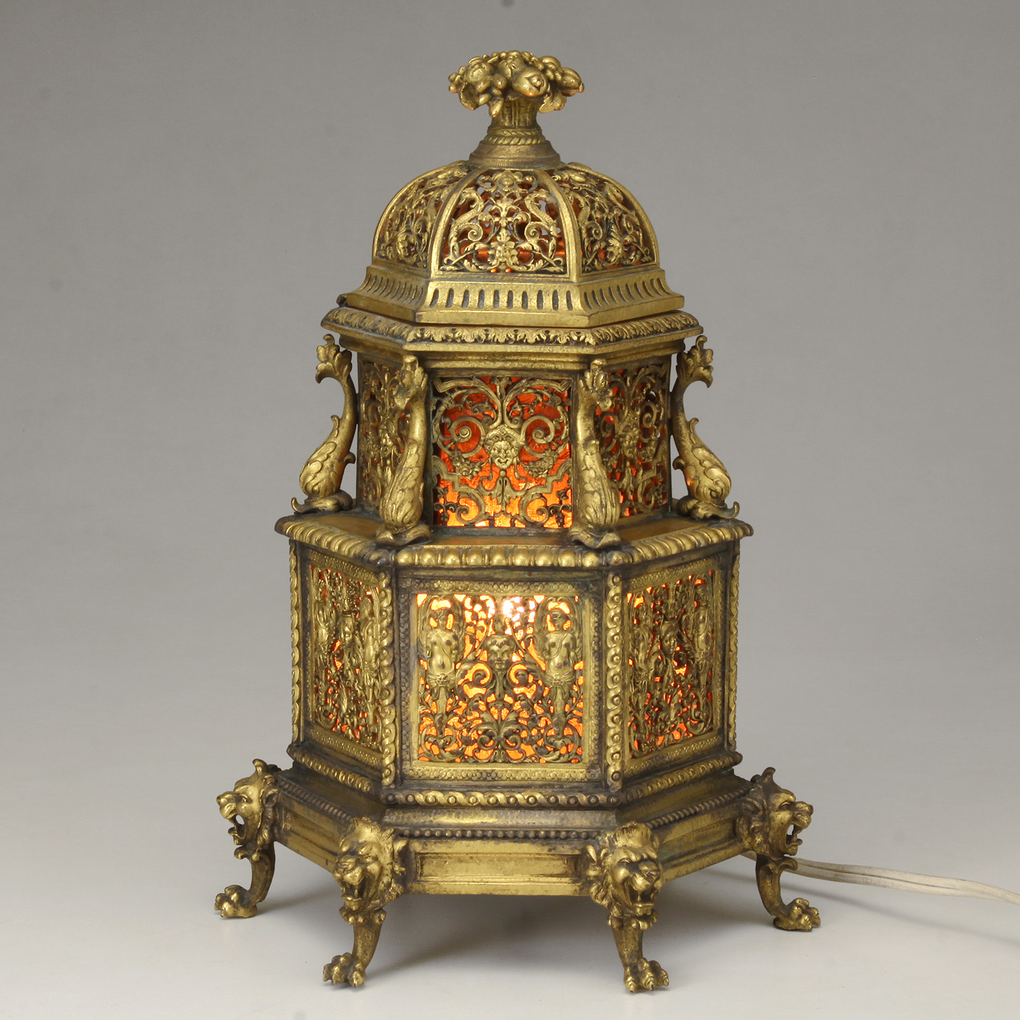 The pagoda form rococo revival boudoir lamp - Having lion head feet, dolphin standard, throughout an open work floral/ classical figural body ending in a stylized floral finial of high relief.