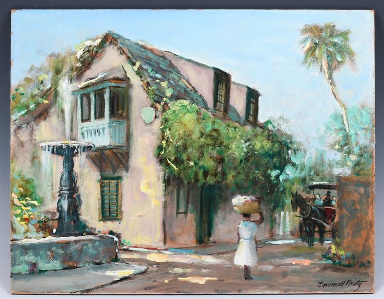 Lot Note(s): Not all Emmett John Fritz American, 1917-1995 ST. AUGUSTINE street scenes are created equally: this example exhibits expert: color palette, brushwork, (application of paint) vanishing point, and reflections.