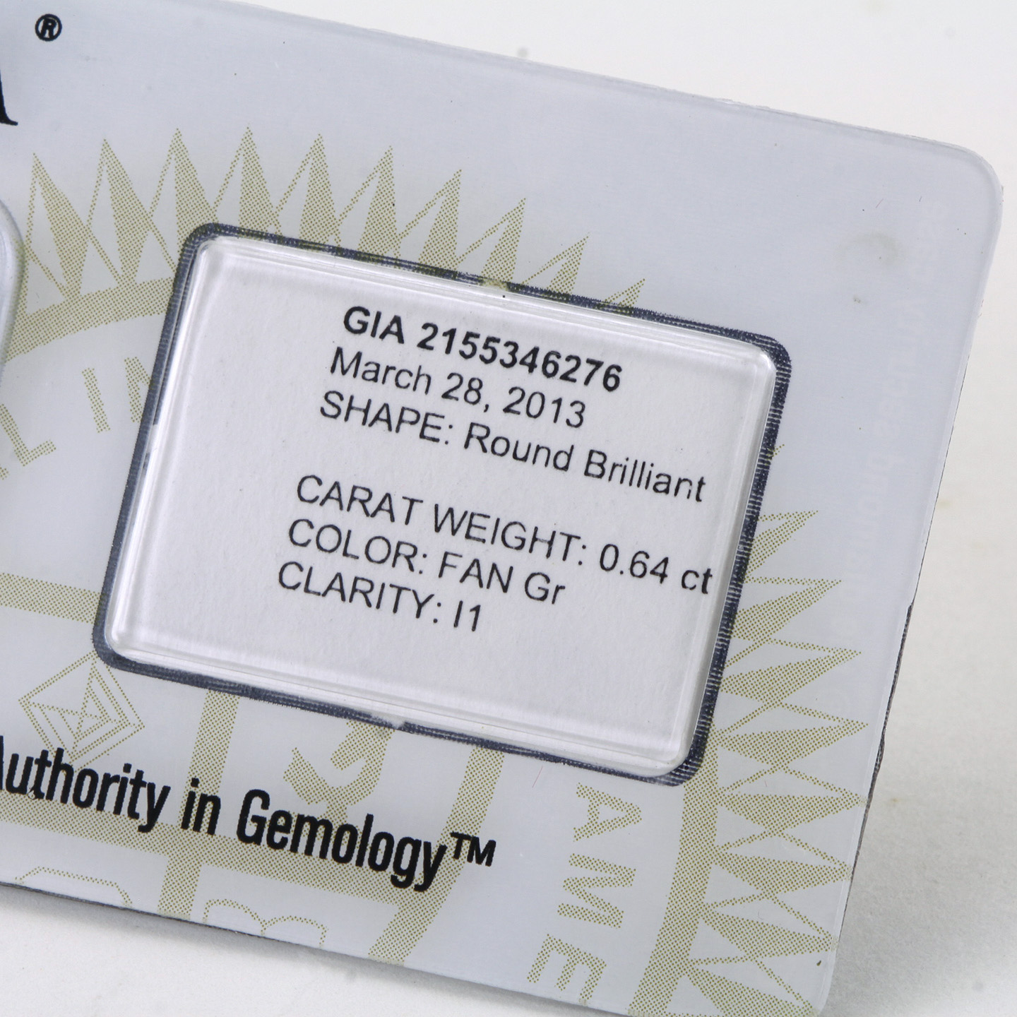 The round brilliant-cut diamond weighs .64 carats. A GIA report # 2155346276, dated March 28th, 2013, stating Fancy Gray.