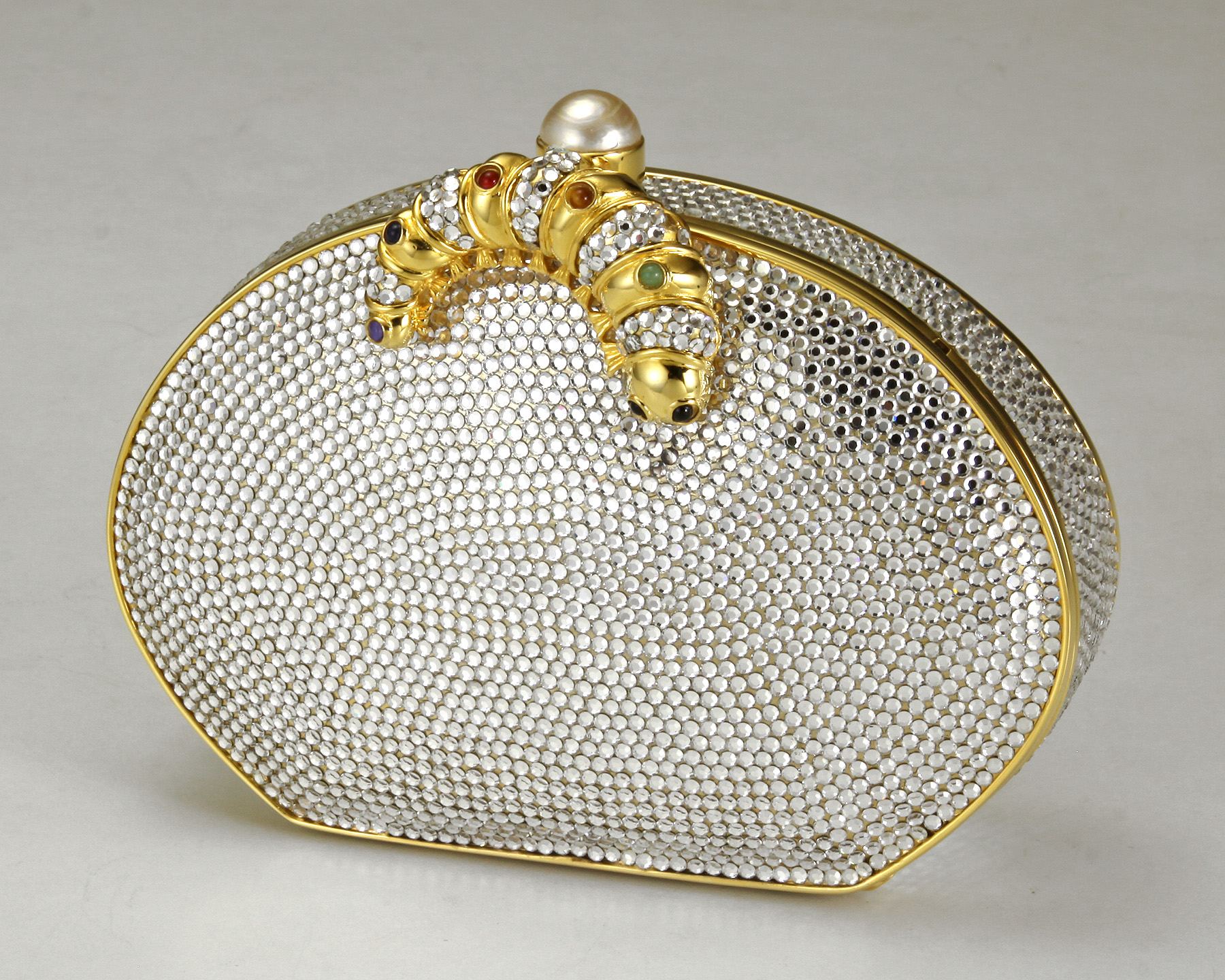 Fun and caterpillar handle form, this clutch makes it easy to wear a spectacular Judith Leiber minaudiere with virtually any evening ensemble.