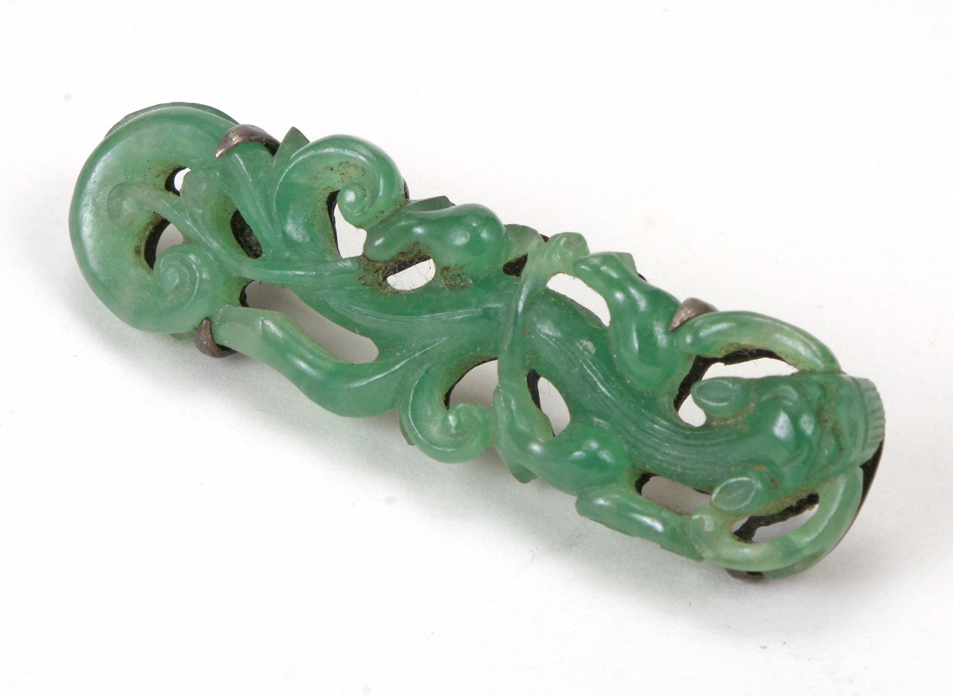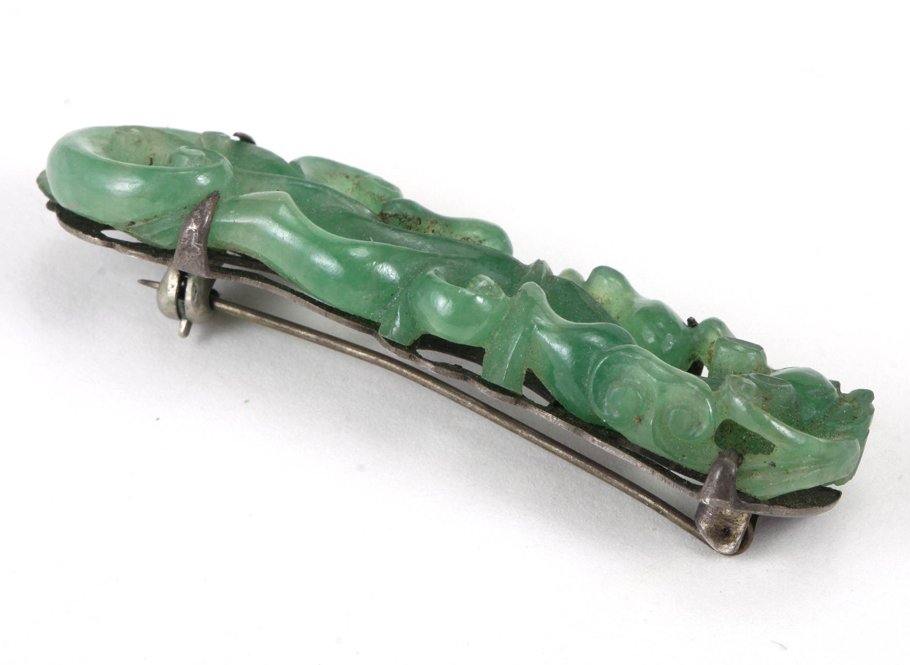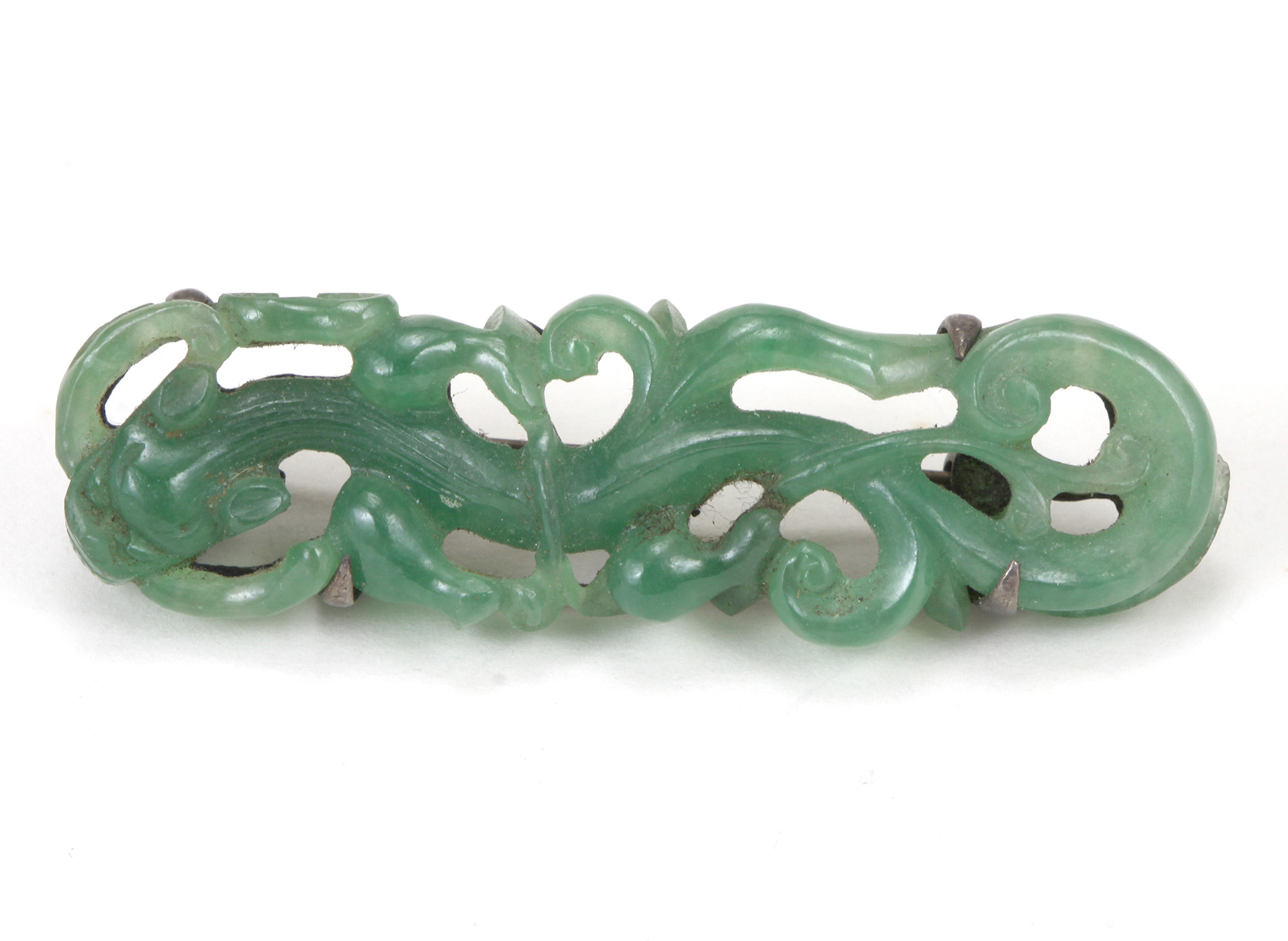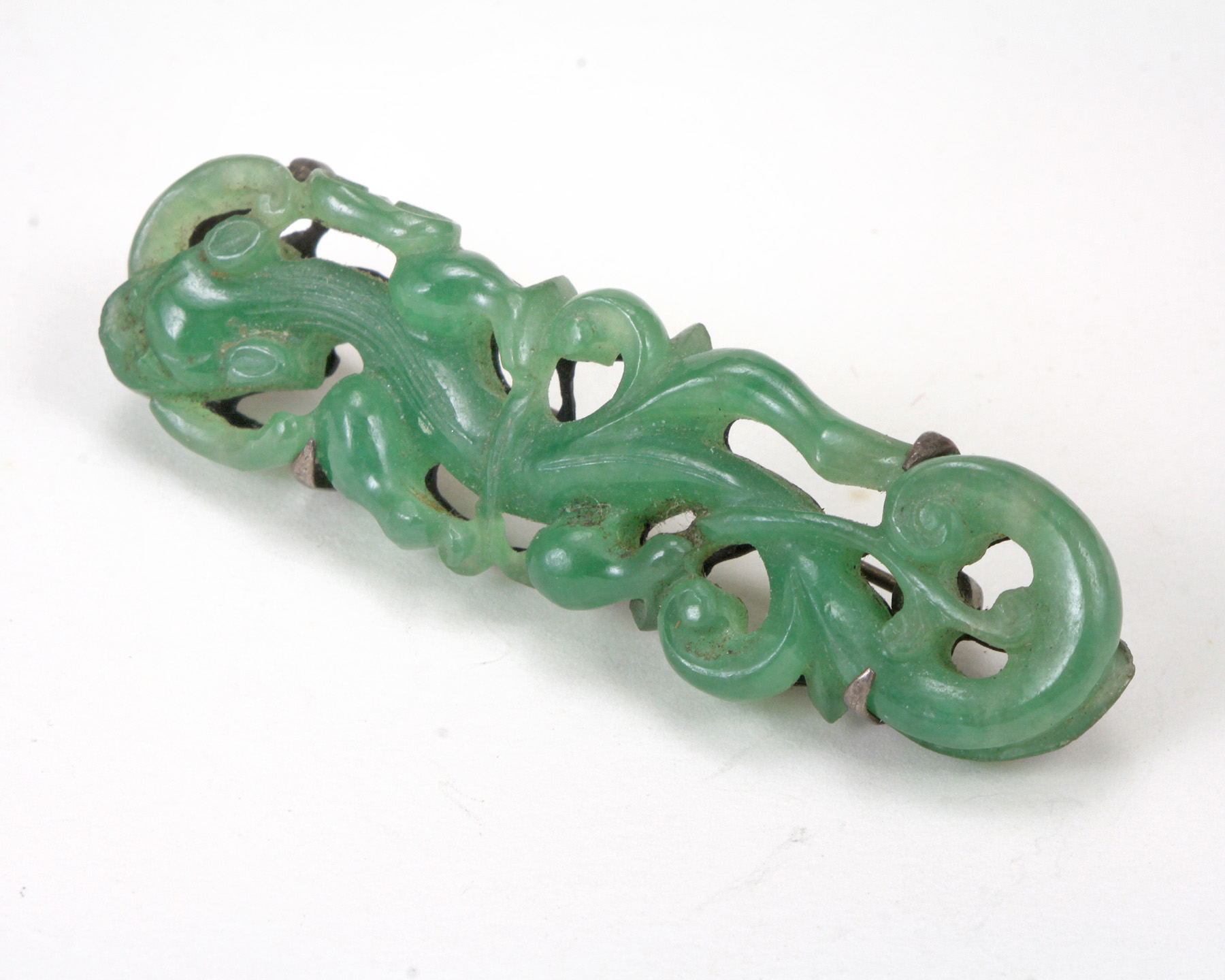 This late Qing Chinese brooch is carved out of apple green jadeite jade depicting a chilong/dragon with open work design and cut outs to the silver backing...