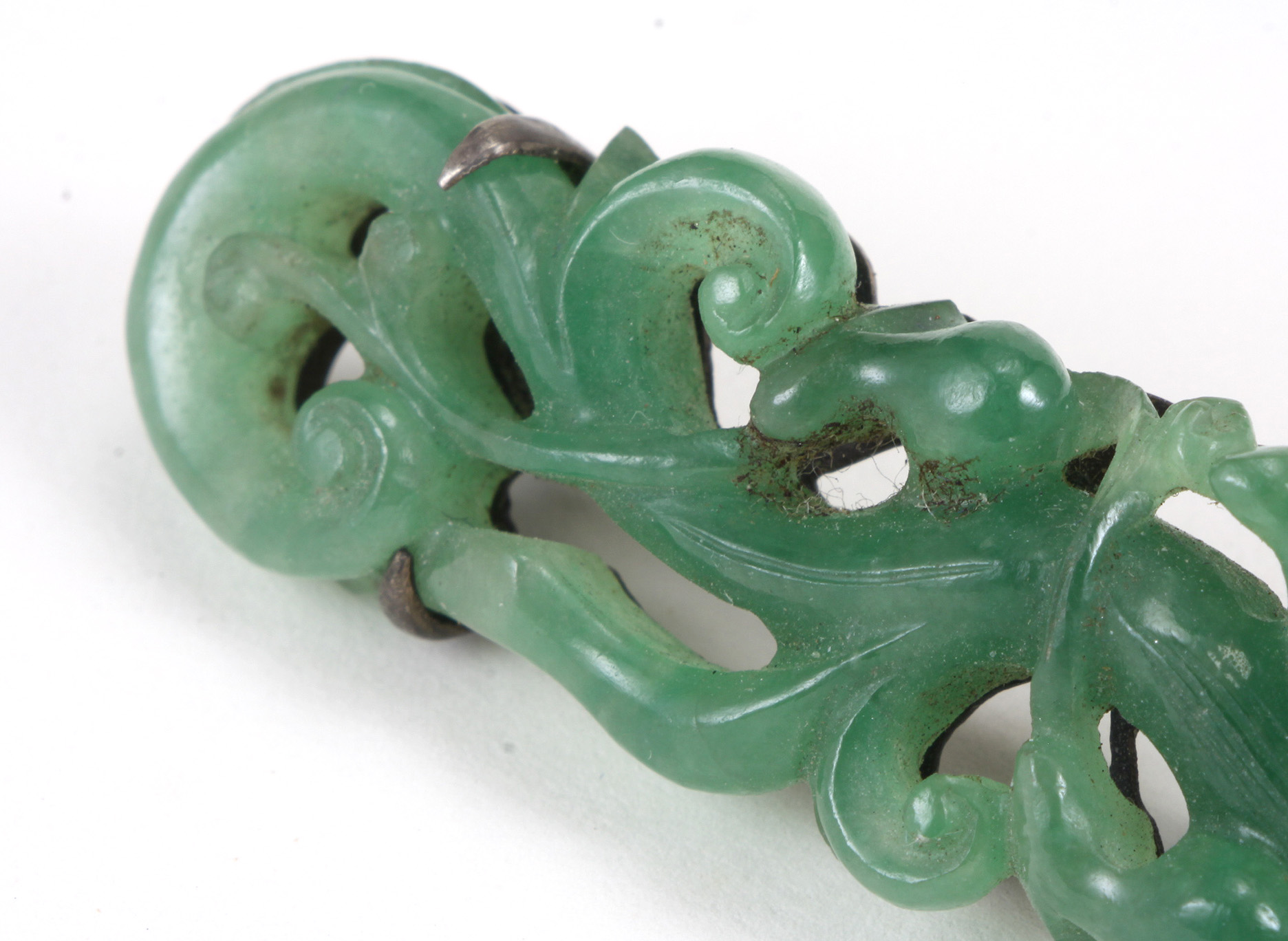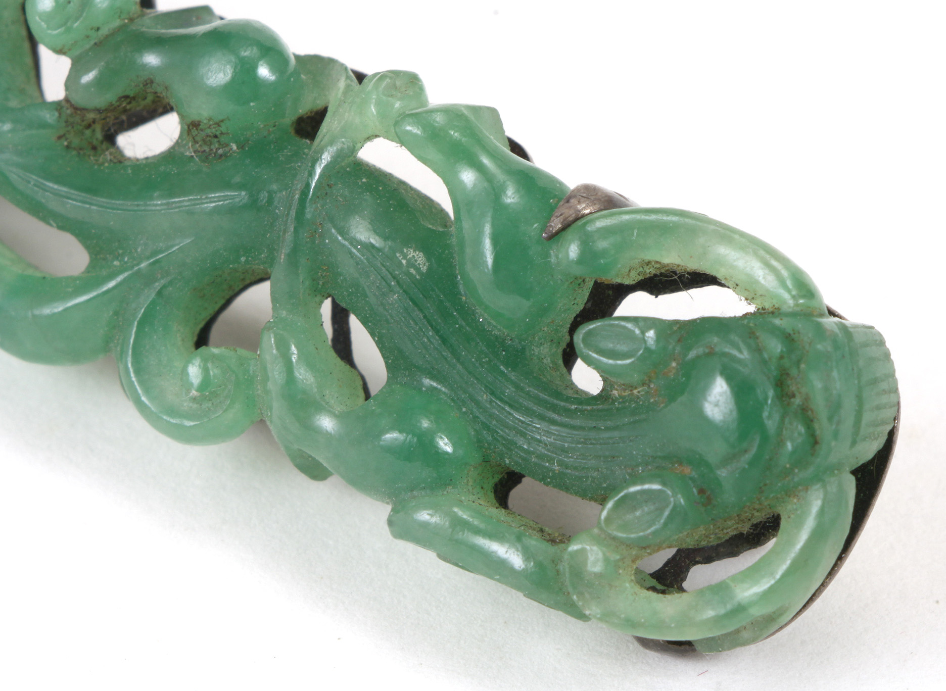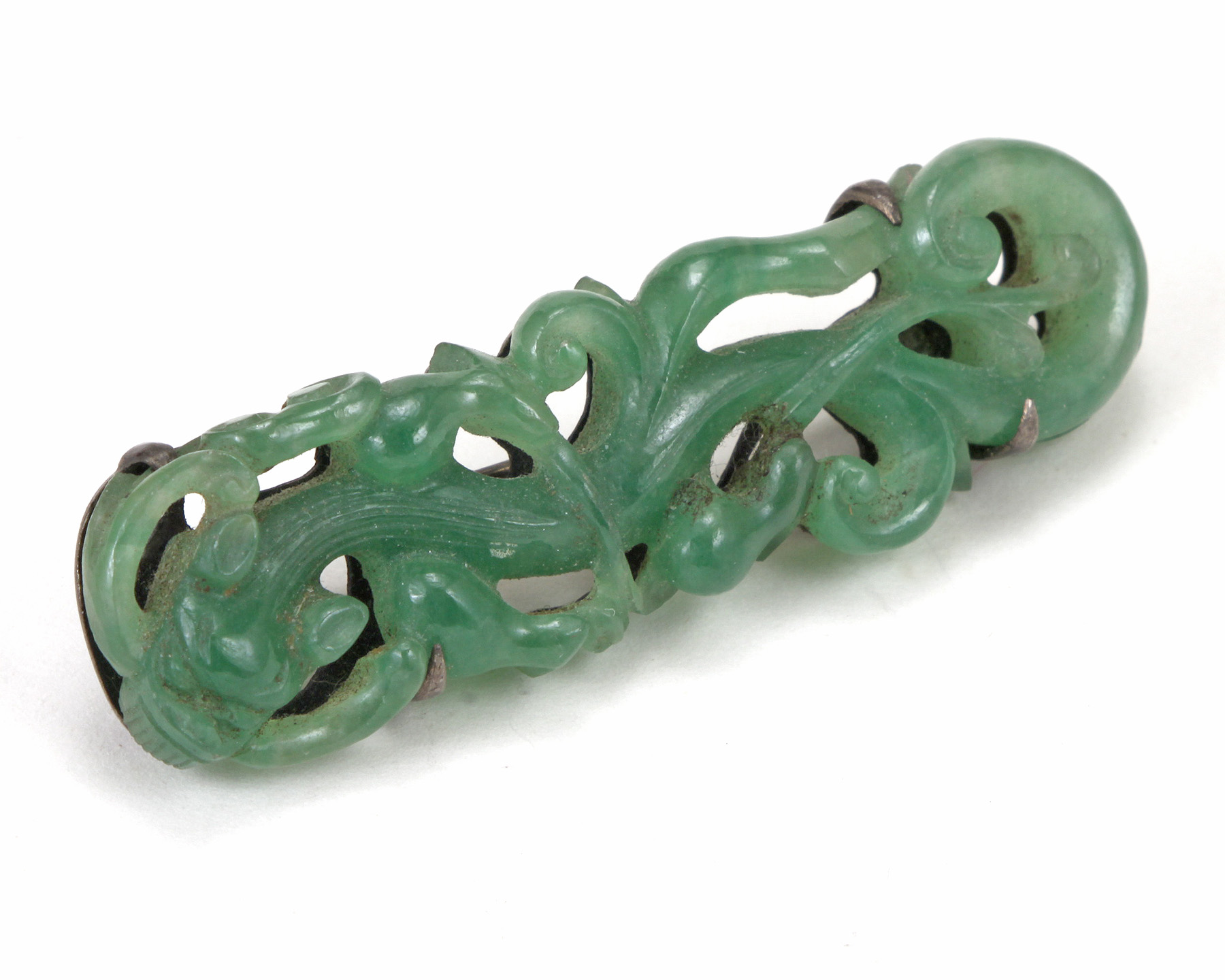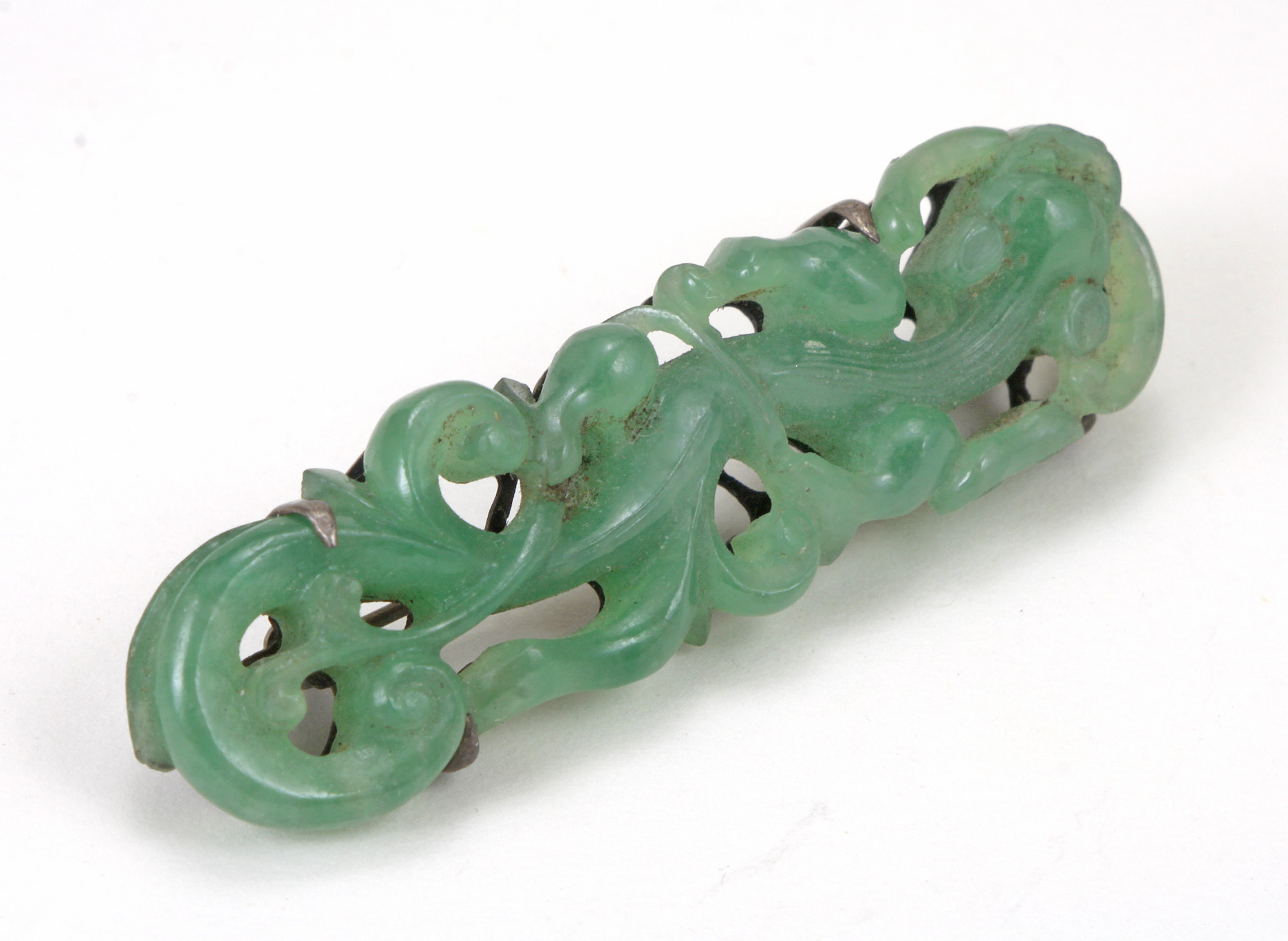 This late Qing Chinese brooch is carved out of apple green jadeite jade depicting a chilong/dragon with open work design and cut outs to the silver backing...