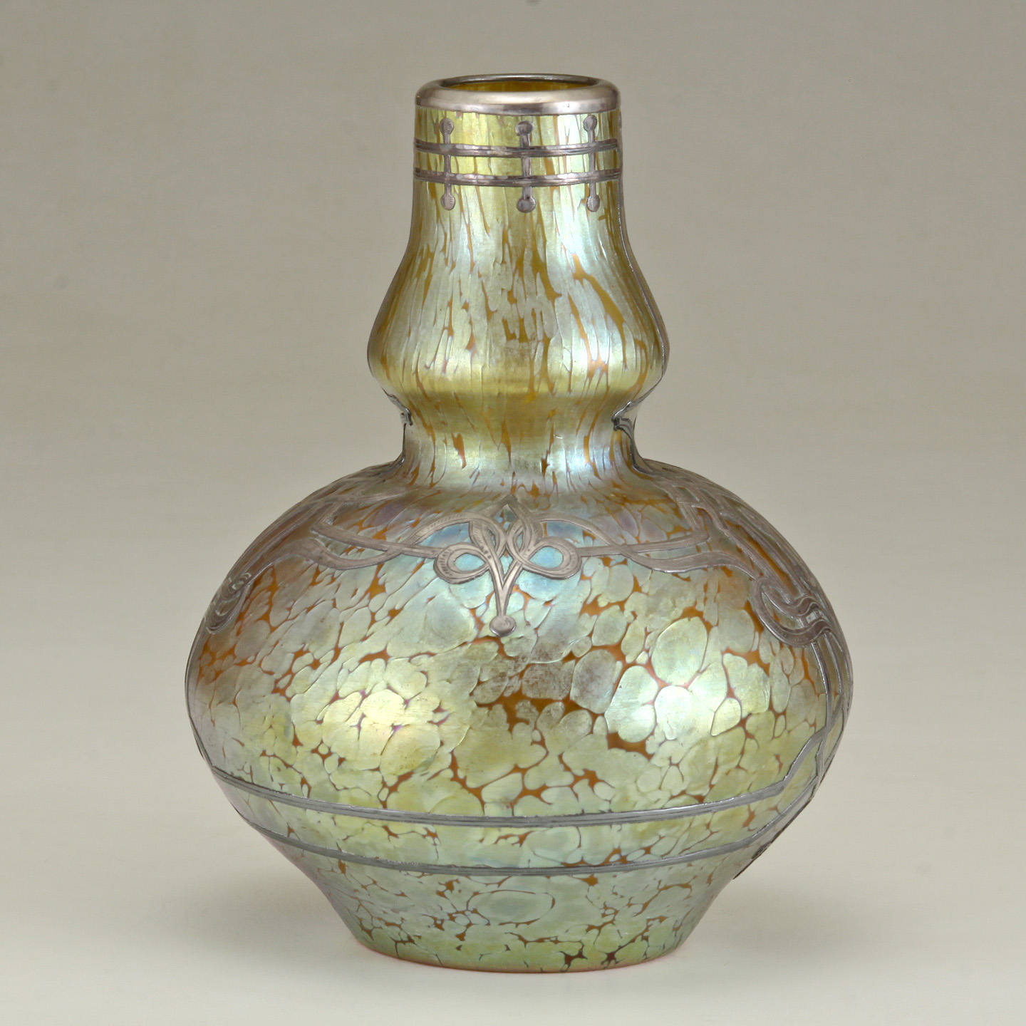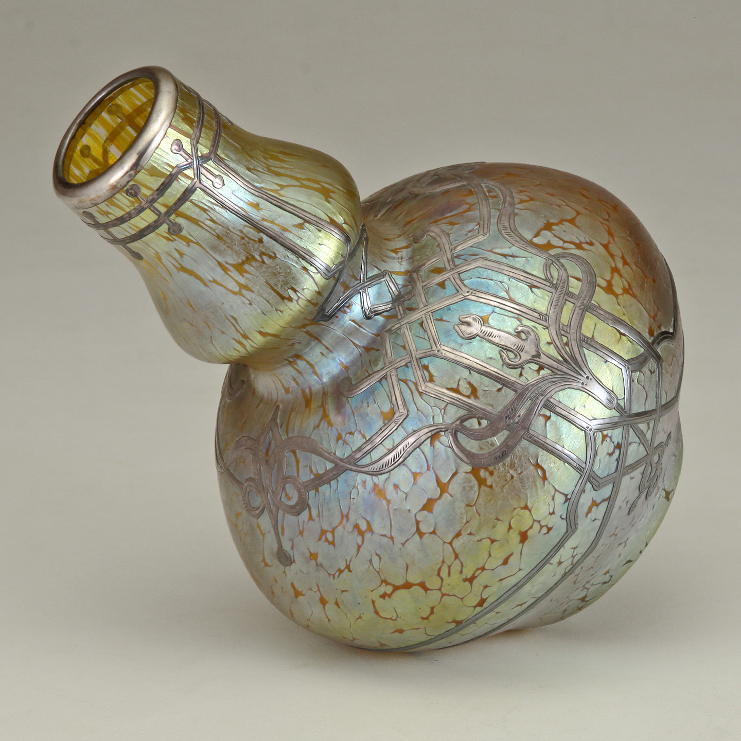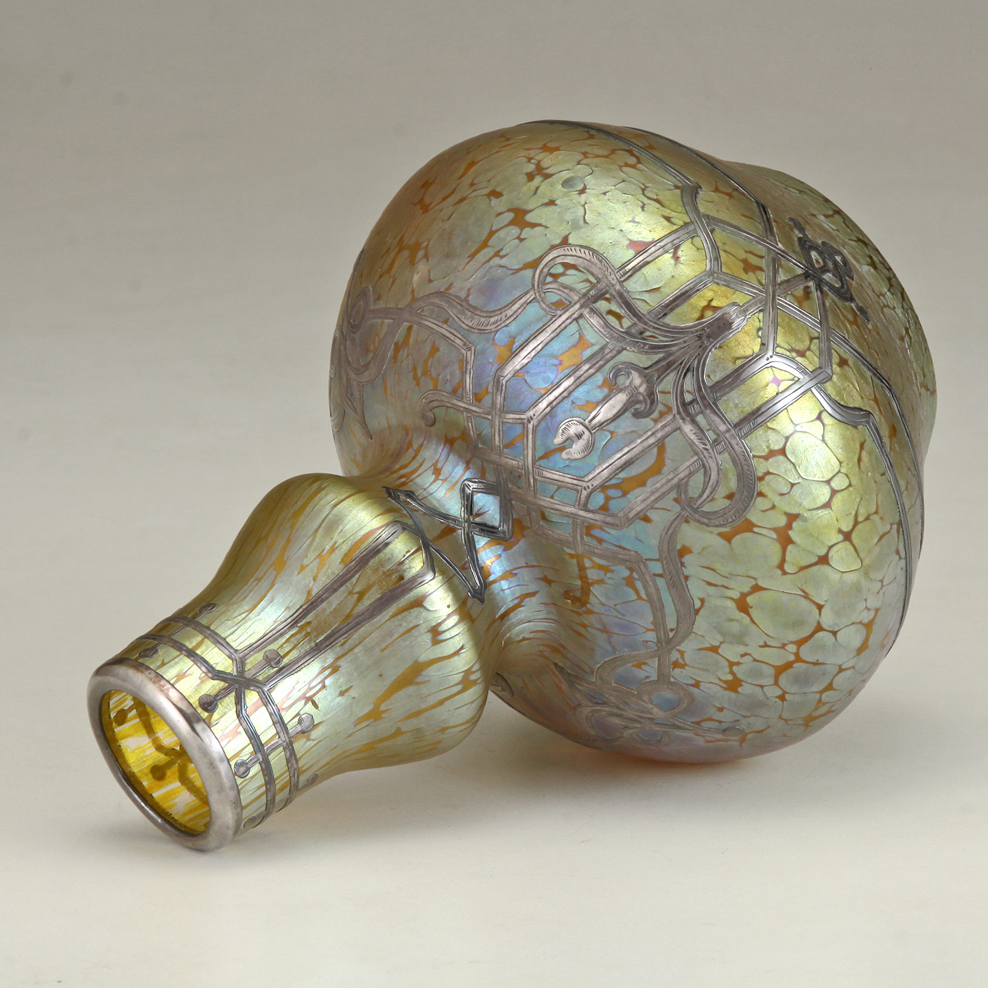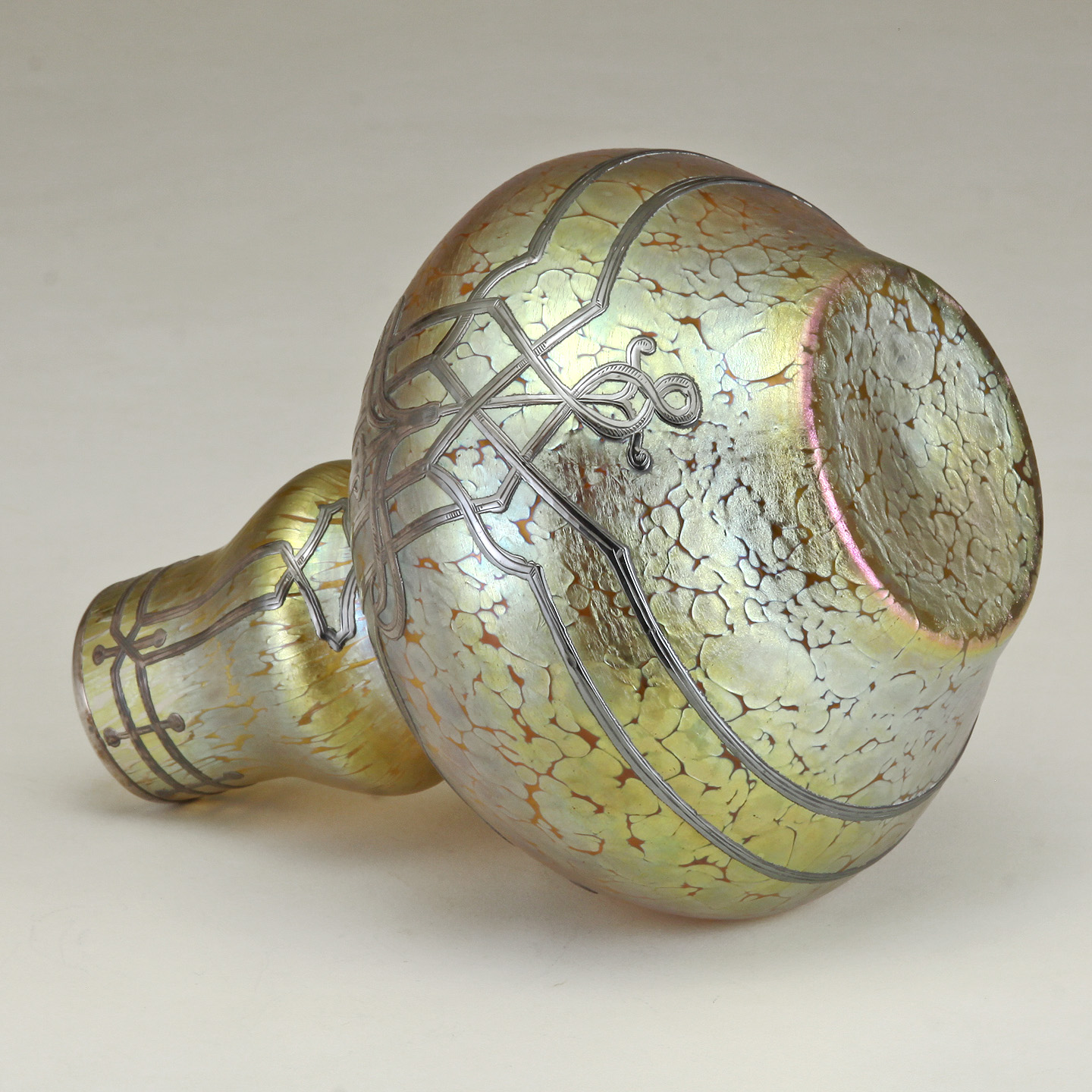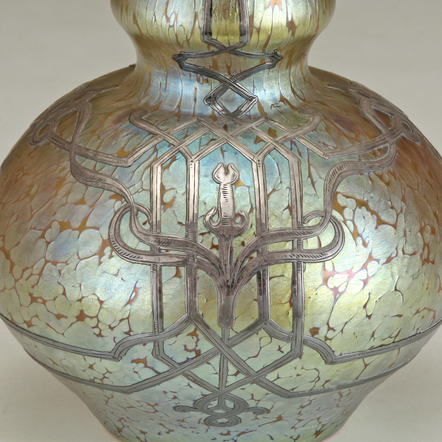 The narrowed neck with flared shoulder, and bulbous base in gold/yellow “papillon oil spotted" glass with iridescent blue highlights followed by Art Nouveau silver tendril decorations with "Fleur De Lis" Geometric paterns, scrolls and floral design throughout.
