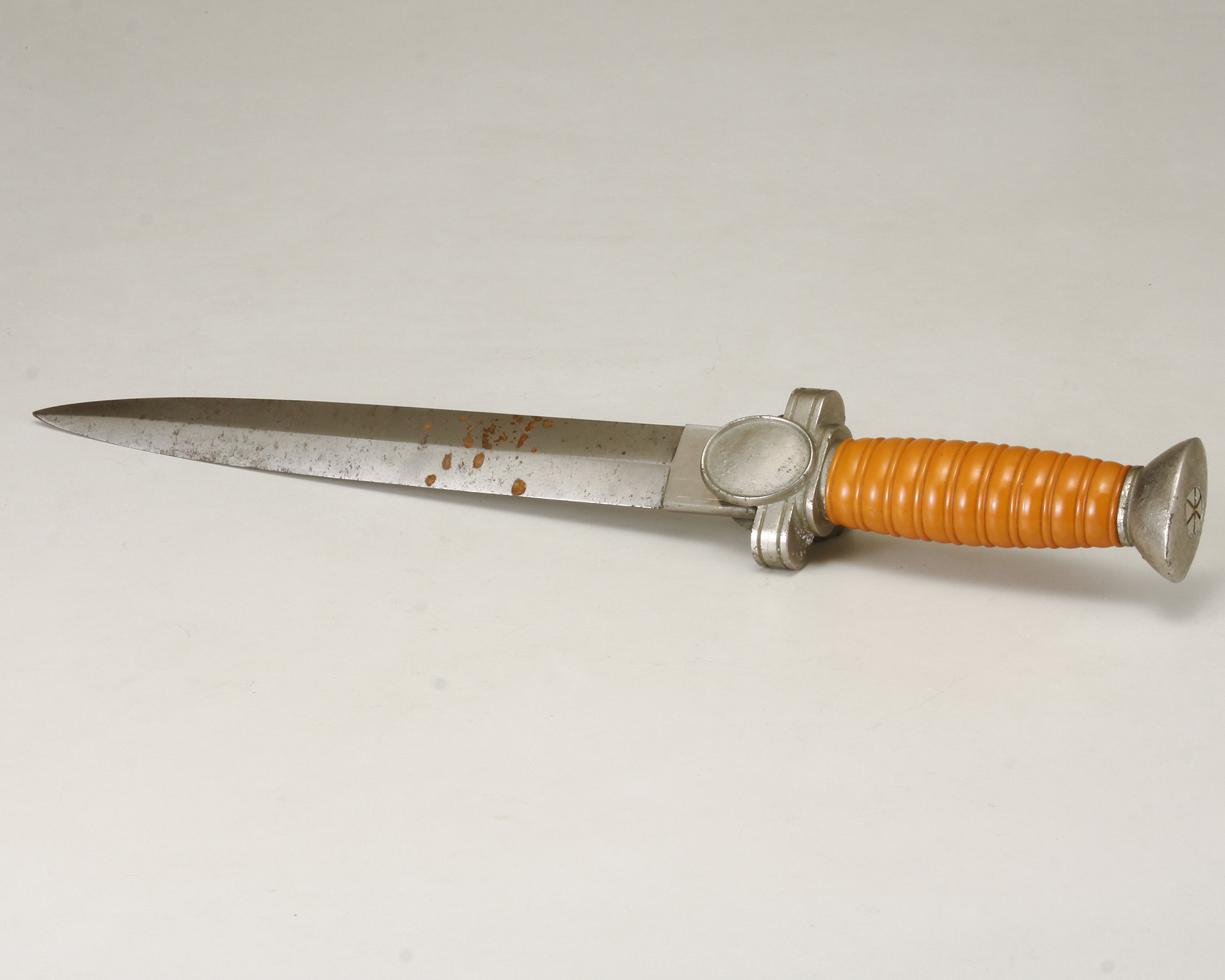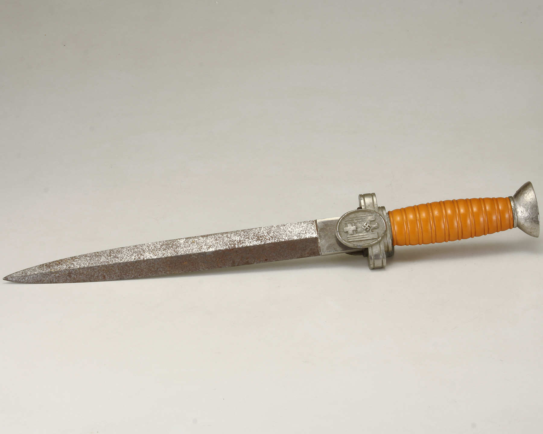 CA. 1938 NAZI WWII SOCIAL WELFARE LEADER DRESS DAGGER. NICKELED, ROUNDED FLAT TOP POMMEL AND CROSS GUARD/LANGET BEARING A RELIEF EAGLE/SWASTIKA/GENEVA CROSS.