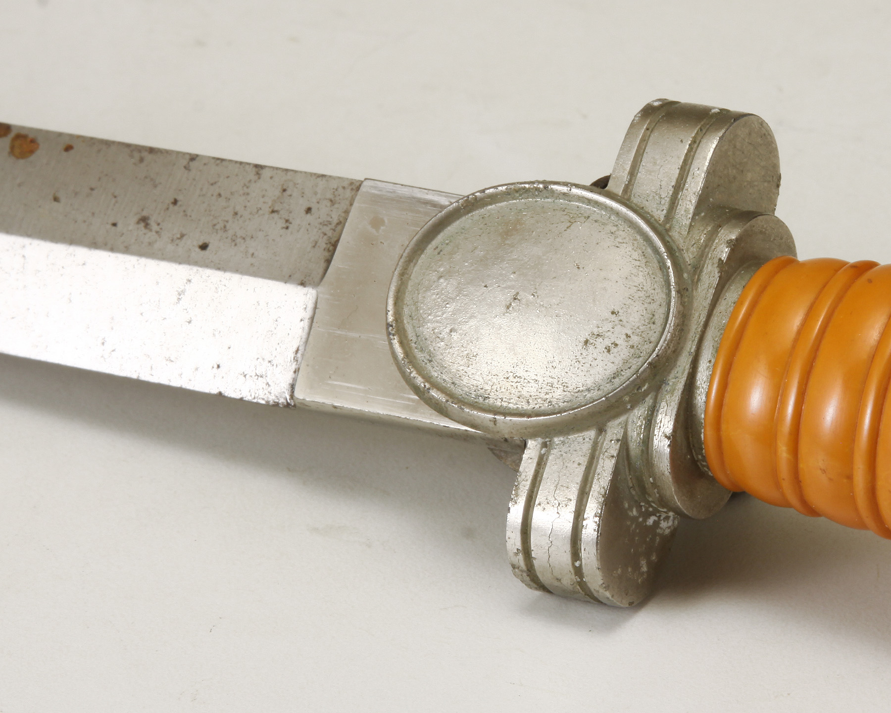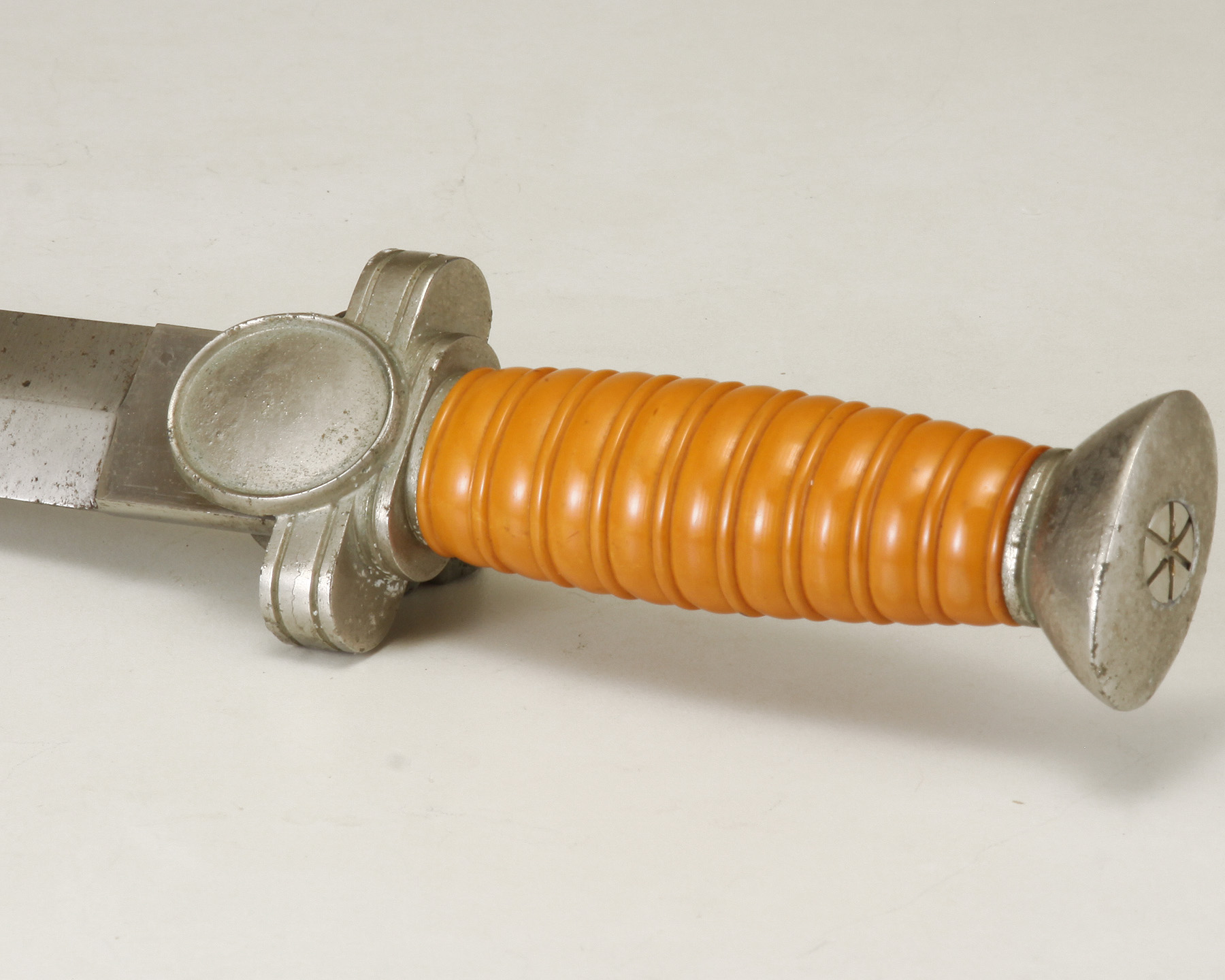 Unmarked polished blade, nickel-plated cross guard and pommel, orange-colored celluloid ribbed grip,