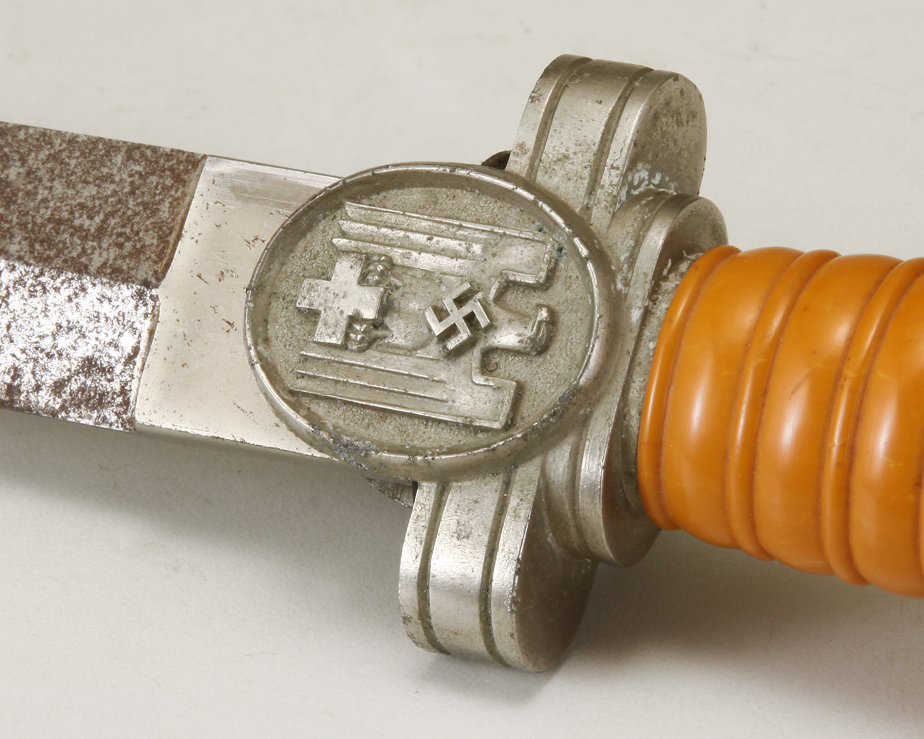 The cast alloy cross guard, langets, and pommel all have a matte nickel/silver plating. The obverse vertically oval langet has a raised, smooth outer edge encompassing an embossed second pattern, (1938), DRK eagle with a highly embossed swastika to its breast, on a slightly recessed, pebbled field.