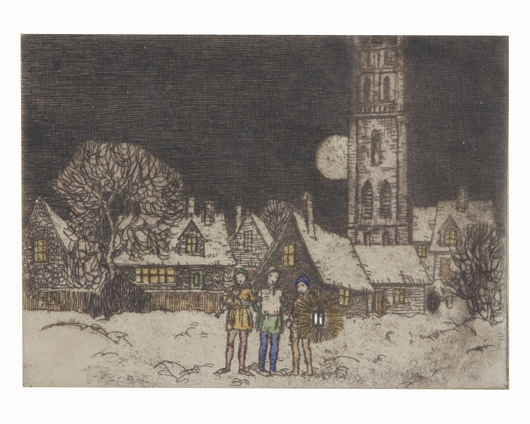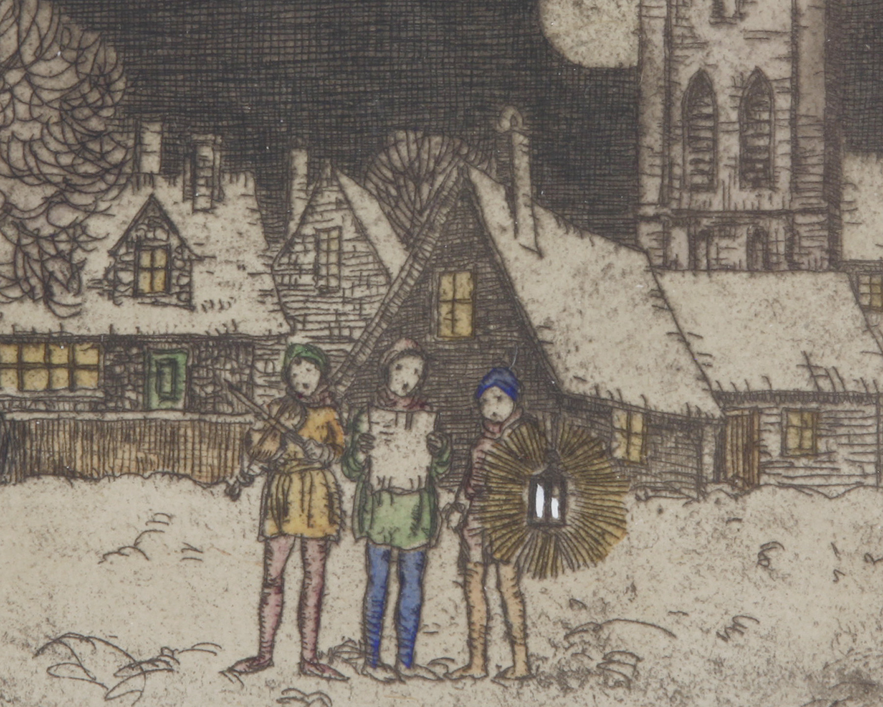 Depicting a landscape scene in winter with figures over a moonlight sky.