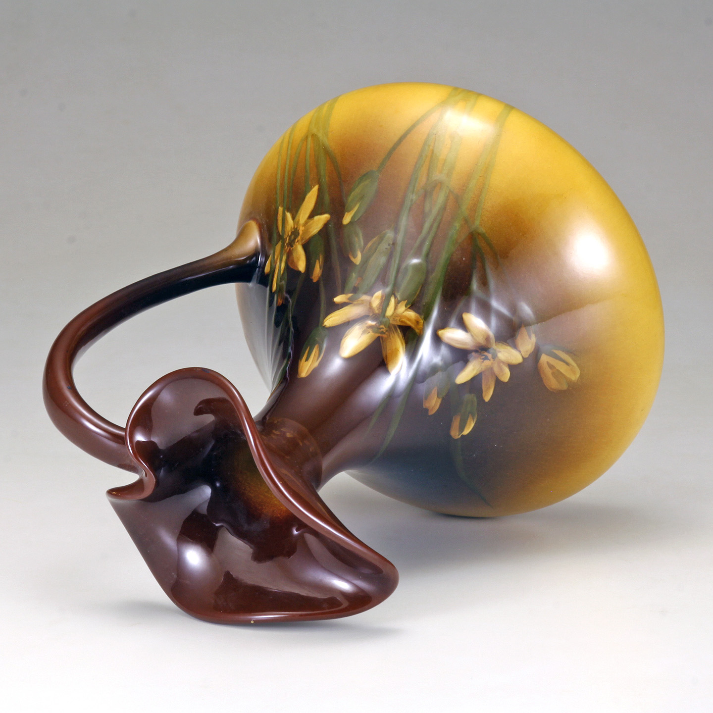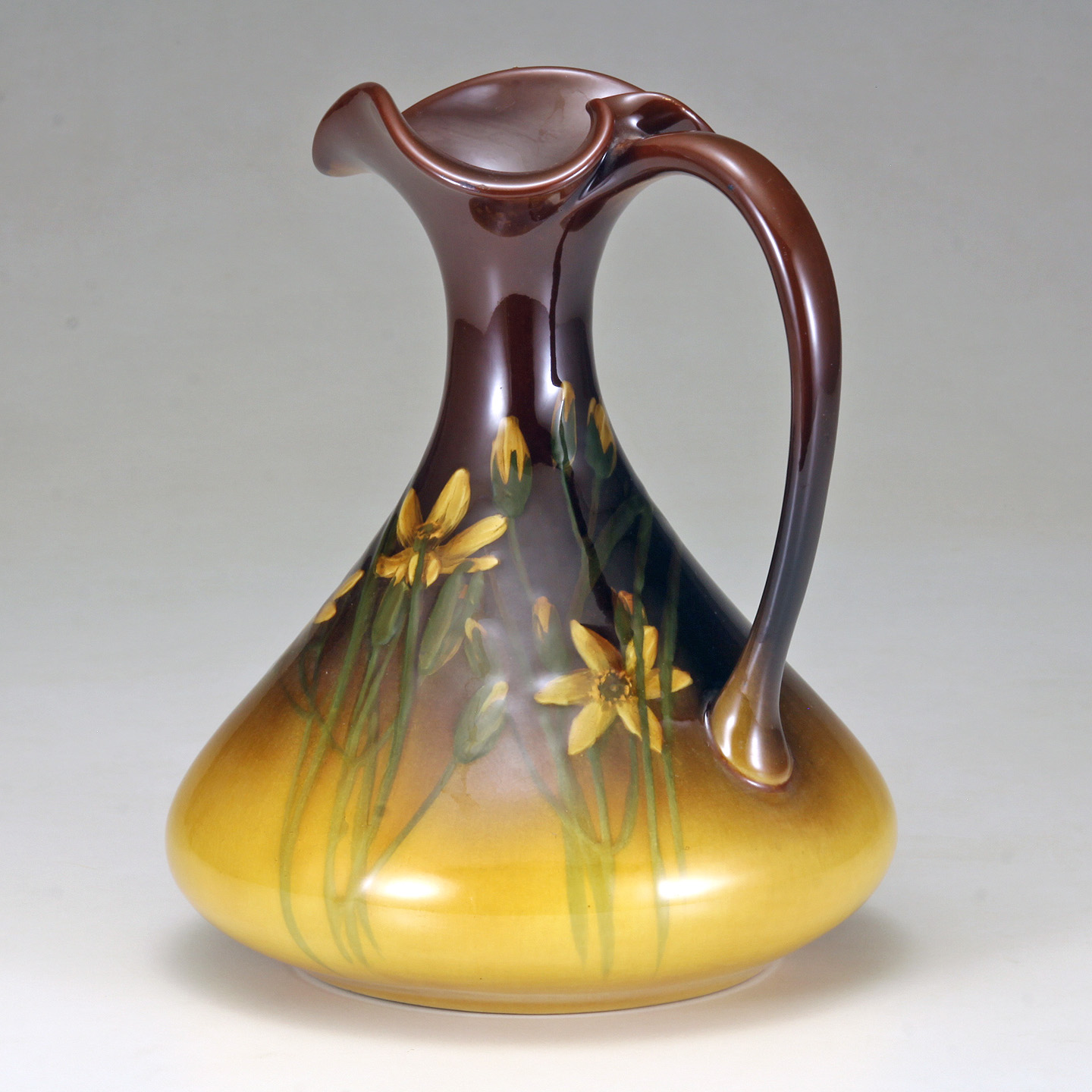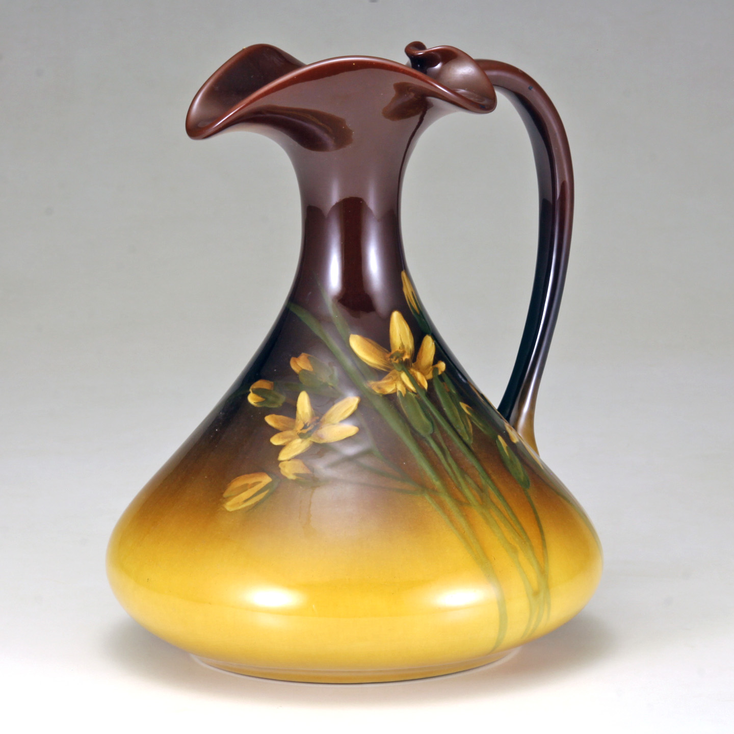 The standard glaze ewer vase decorated with finely detailed daffodils on a shaded yellowish brownish ground.