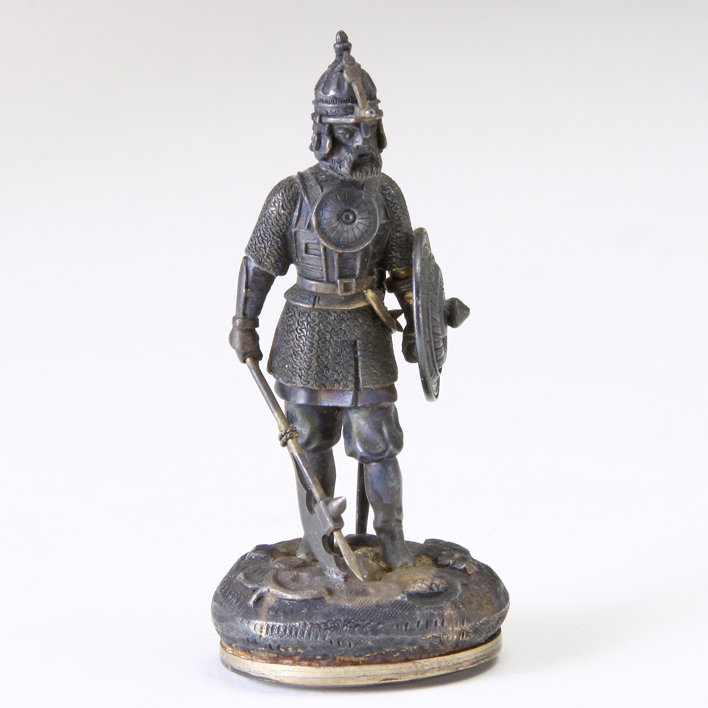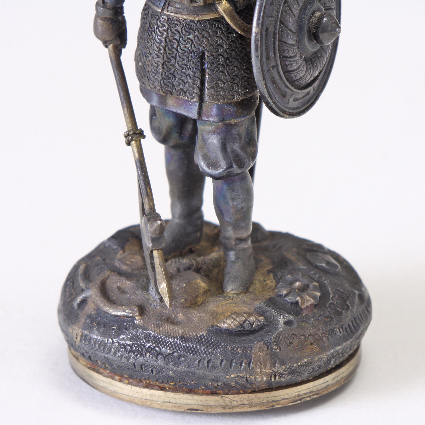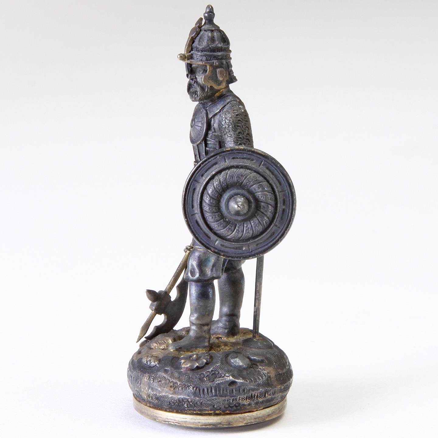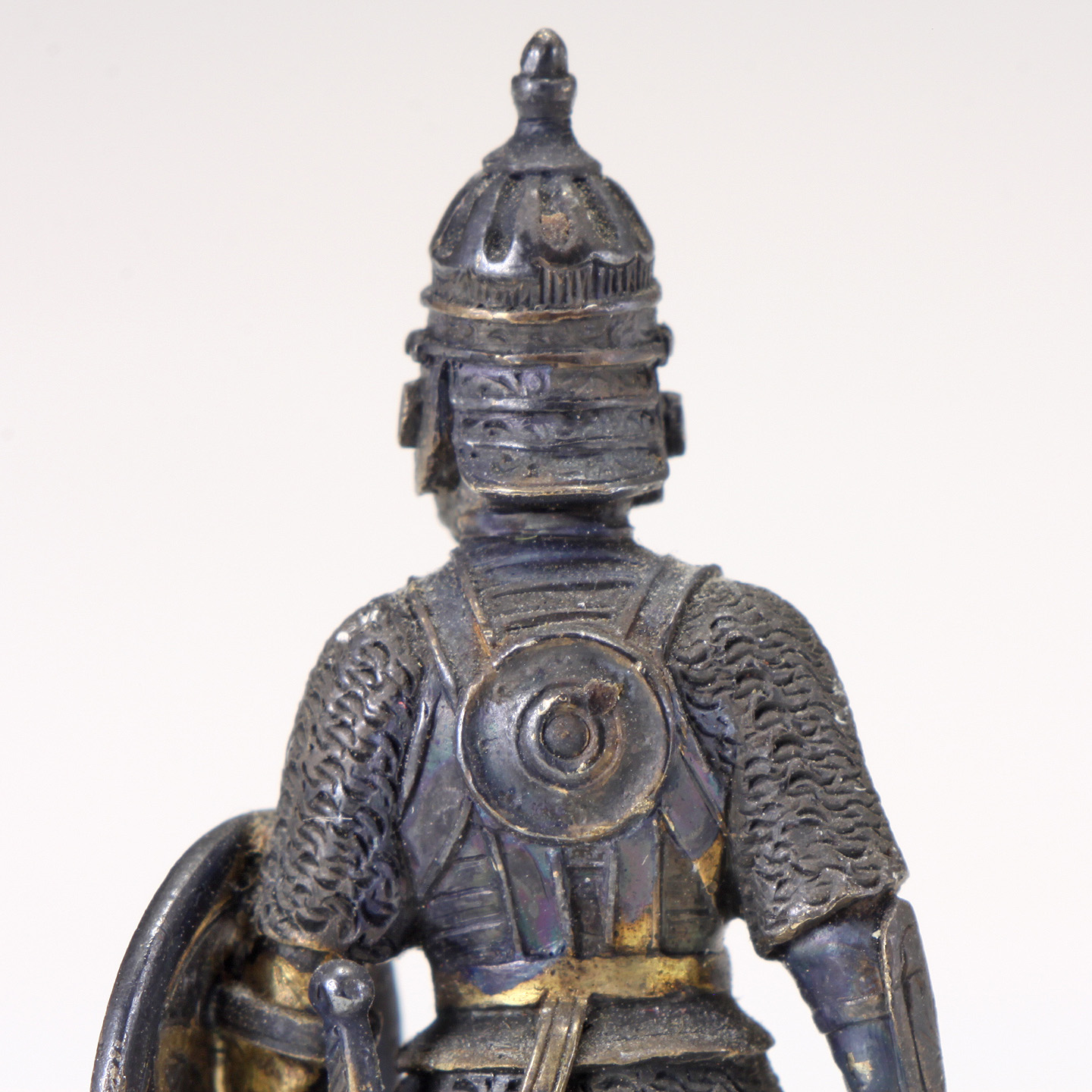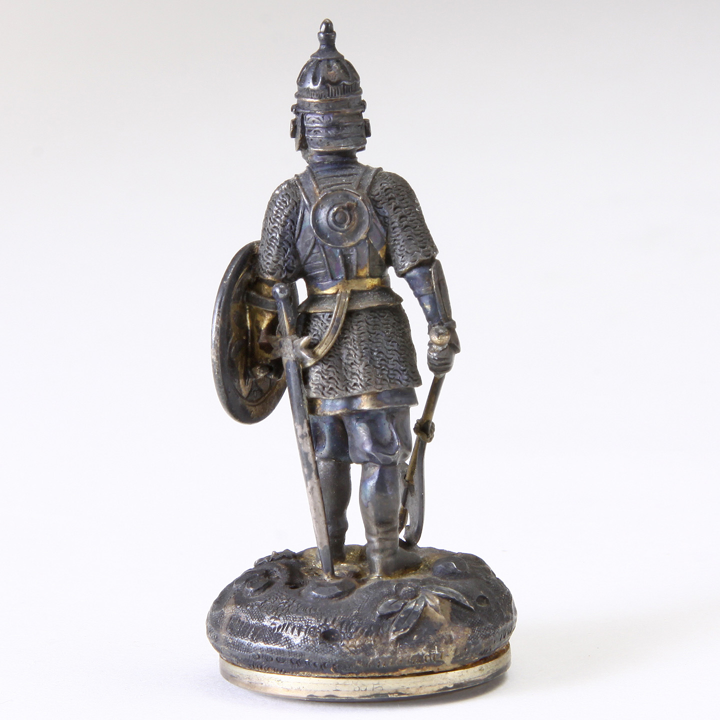 Depicting a finely chased helmet, breastplate, sword, shield, and axe. Accented with gilt highlights throughout, raised on cushion shaped stylized base.