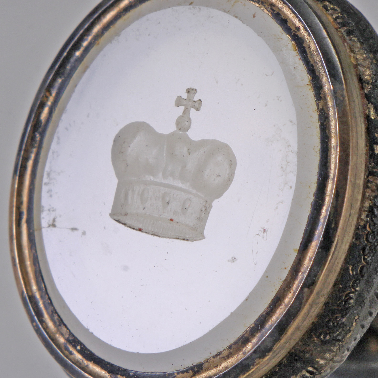 Over a carved whitish glass intaglio/agate hardstone: (cross over a crown).