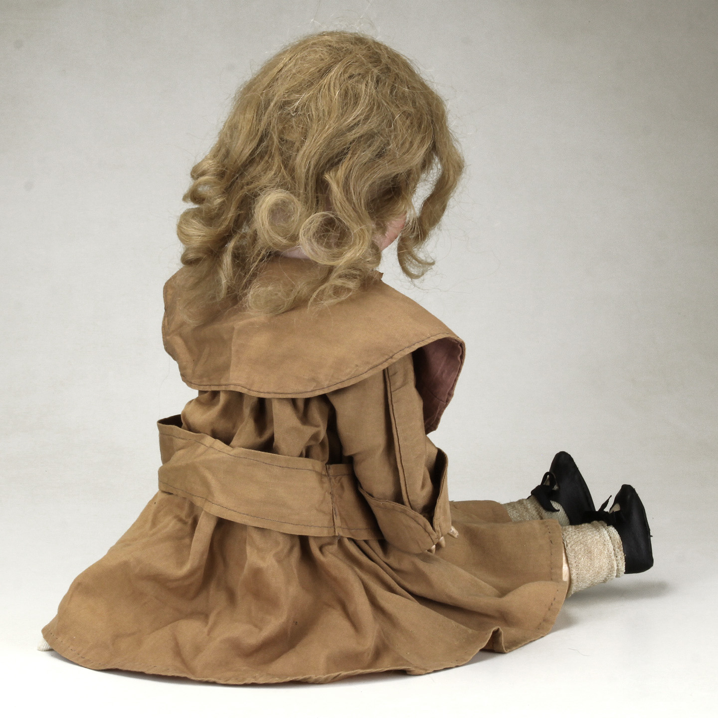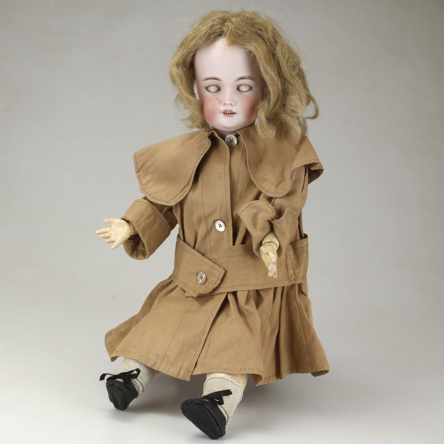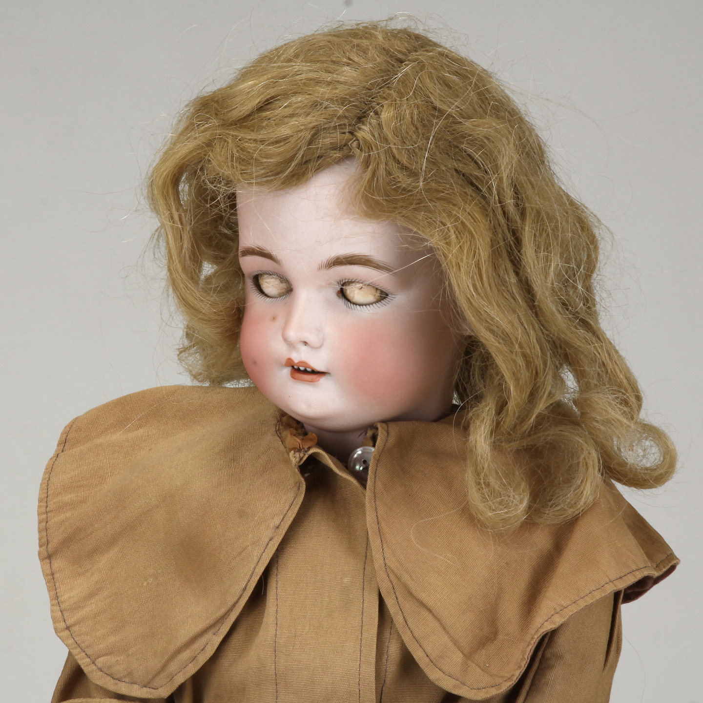 Socket head incised “S & H C.M.B.” by Simon & Halbig for C.M. Bergmann, sleeping eyes, open mouth with upper teeth, pierced ears, rosy cheeks, hand painted brows, & lashes; original blonde mohair wig; she is on a fully jointed composition body.