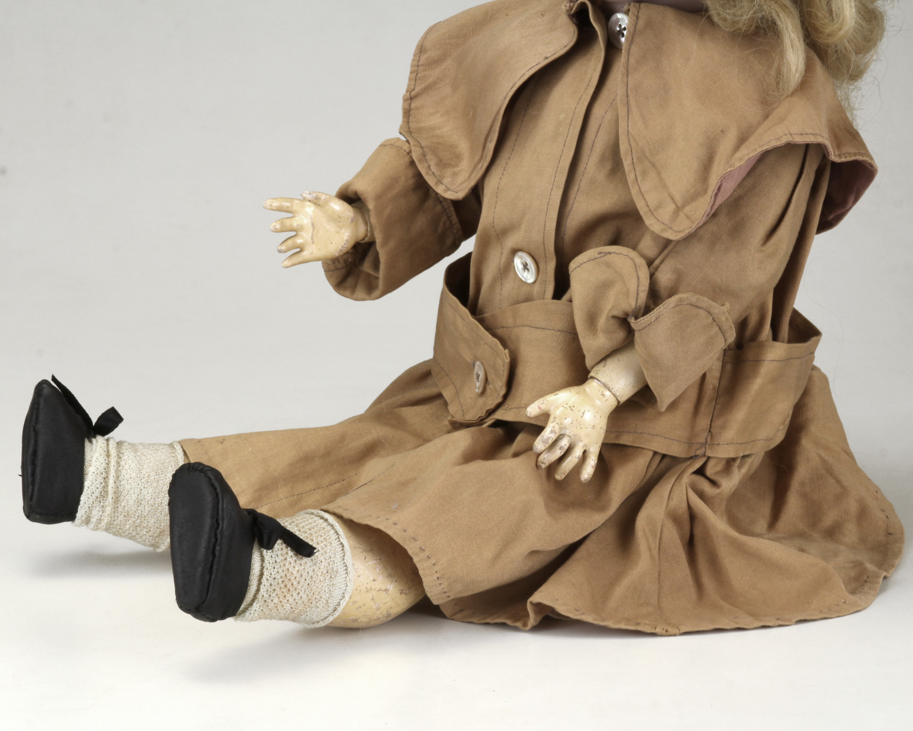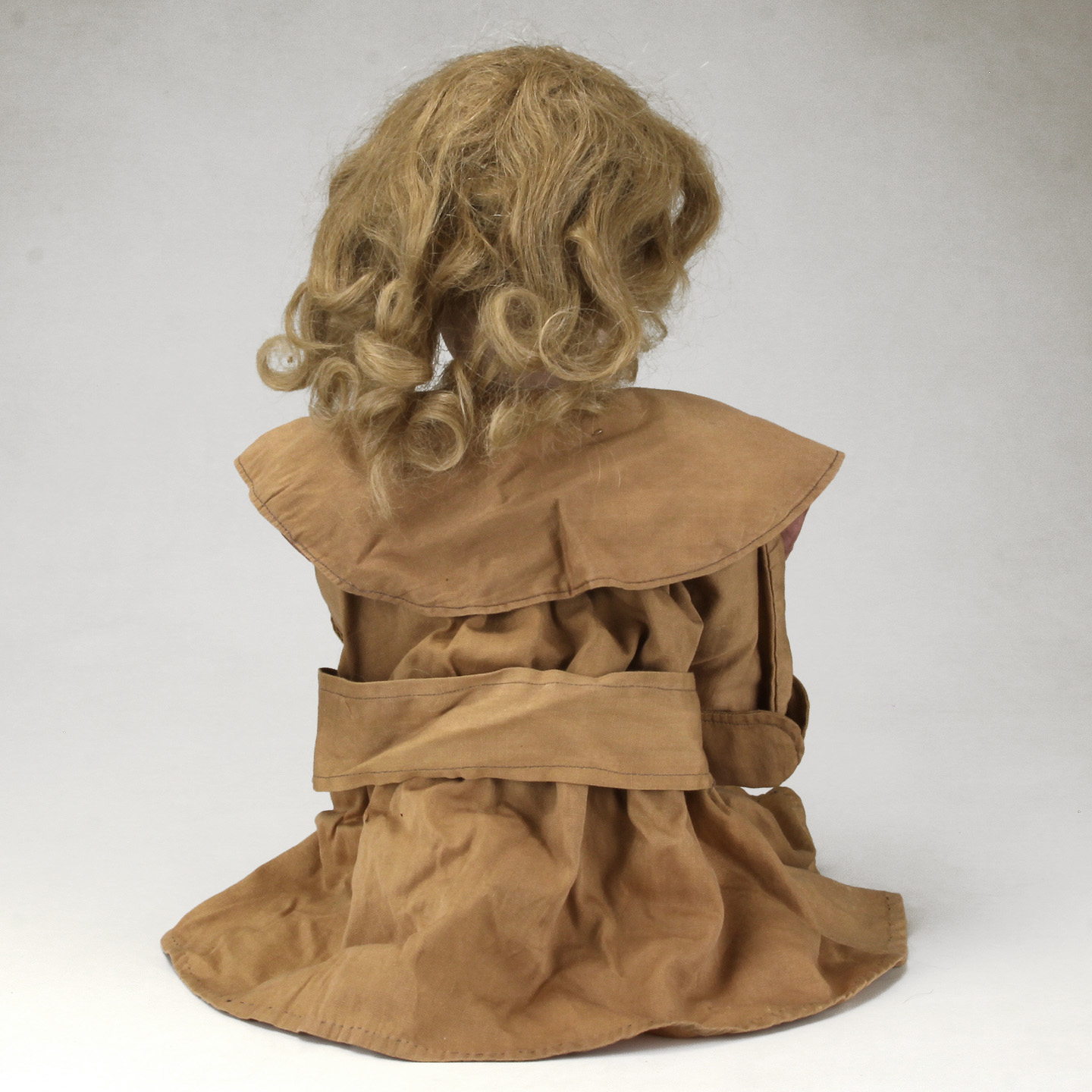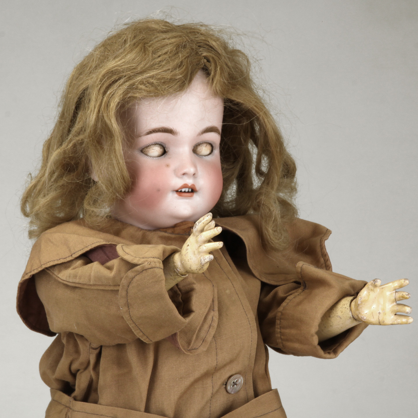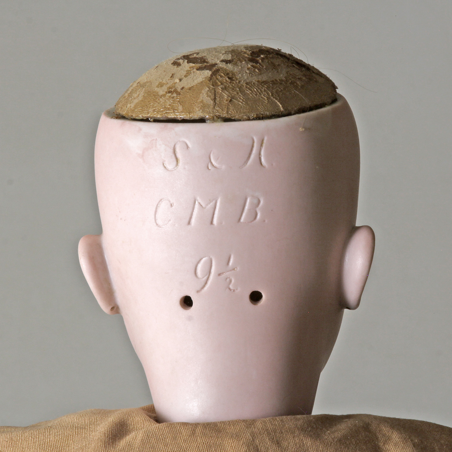 Socket head incised “S & H C.M.B.” by Simon & Halbig for C.M. Bergmann, sleeping eyes, open mouth with upper teeth, pierced ears, rosy cheeks, hand painted brows, & lashes; original blonde mohair wig; she is on a fully jointed composition body.