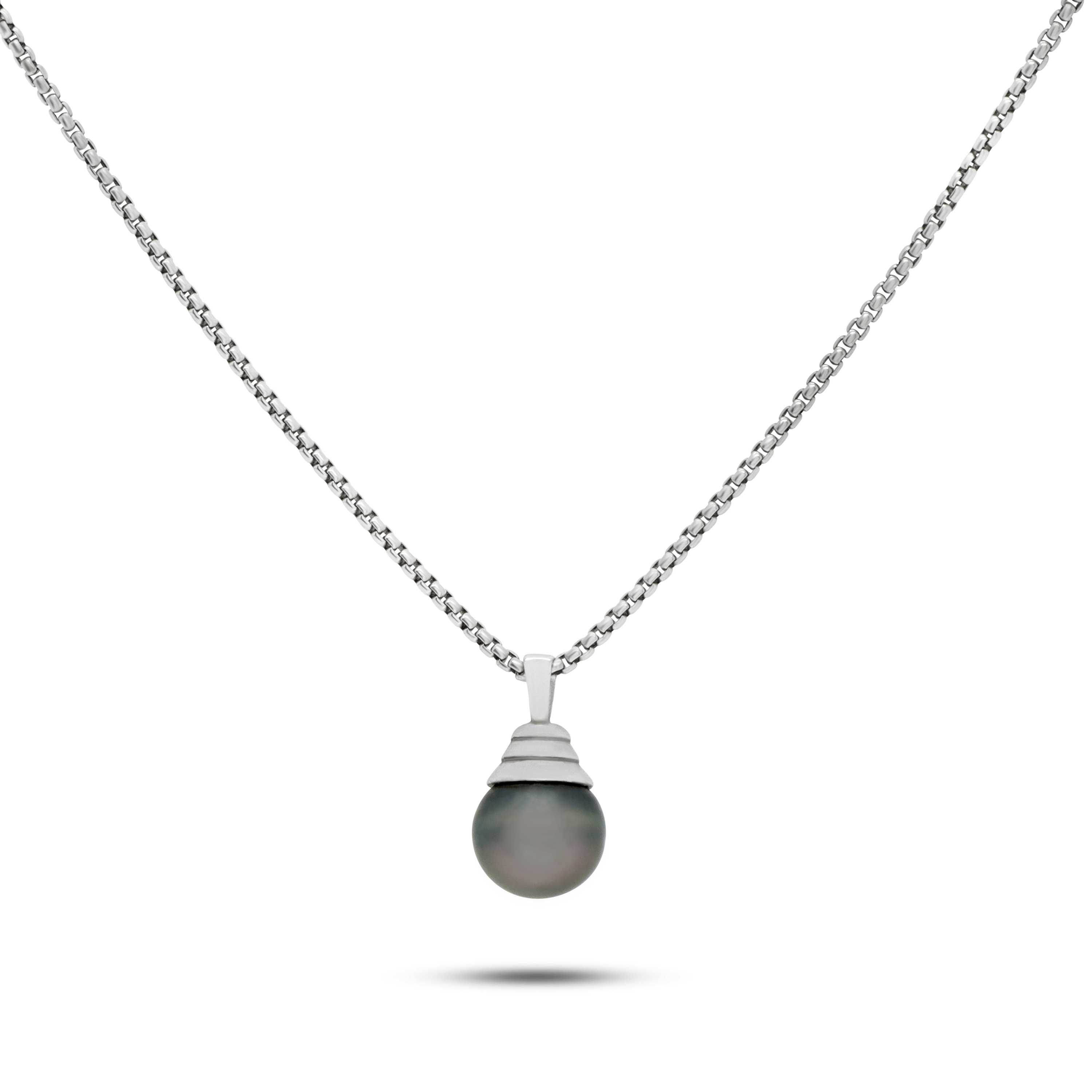 Sterling Silver Box Link Necklace With Round Tahitian Black Pearl