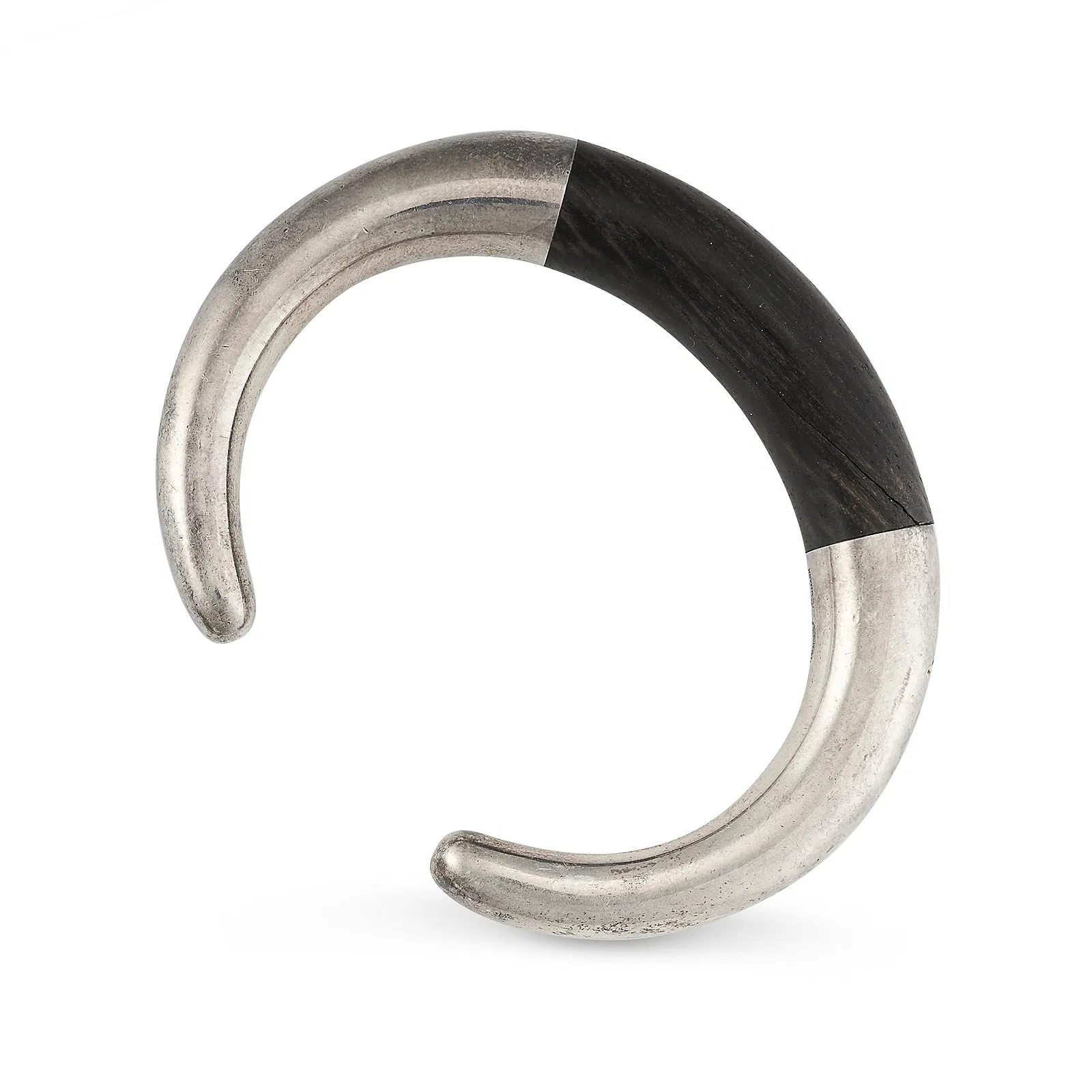 STYLE OF GEORG JENSEN, AN EBONIZED WOOD & SILVER BANGLE.