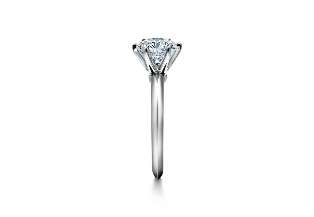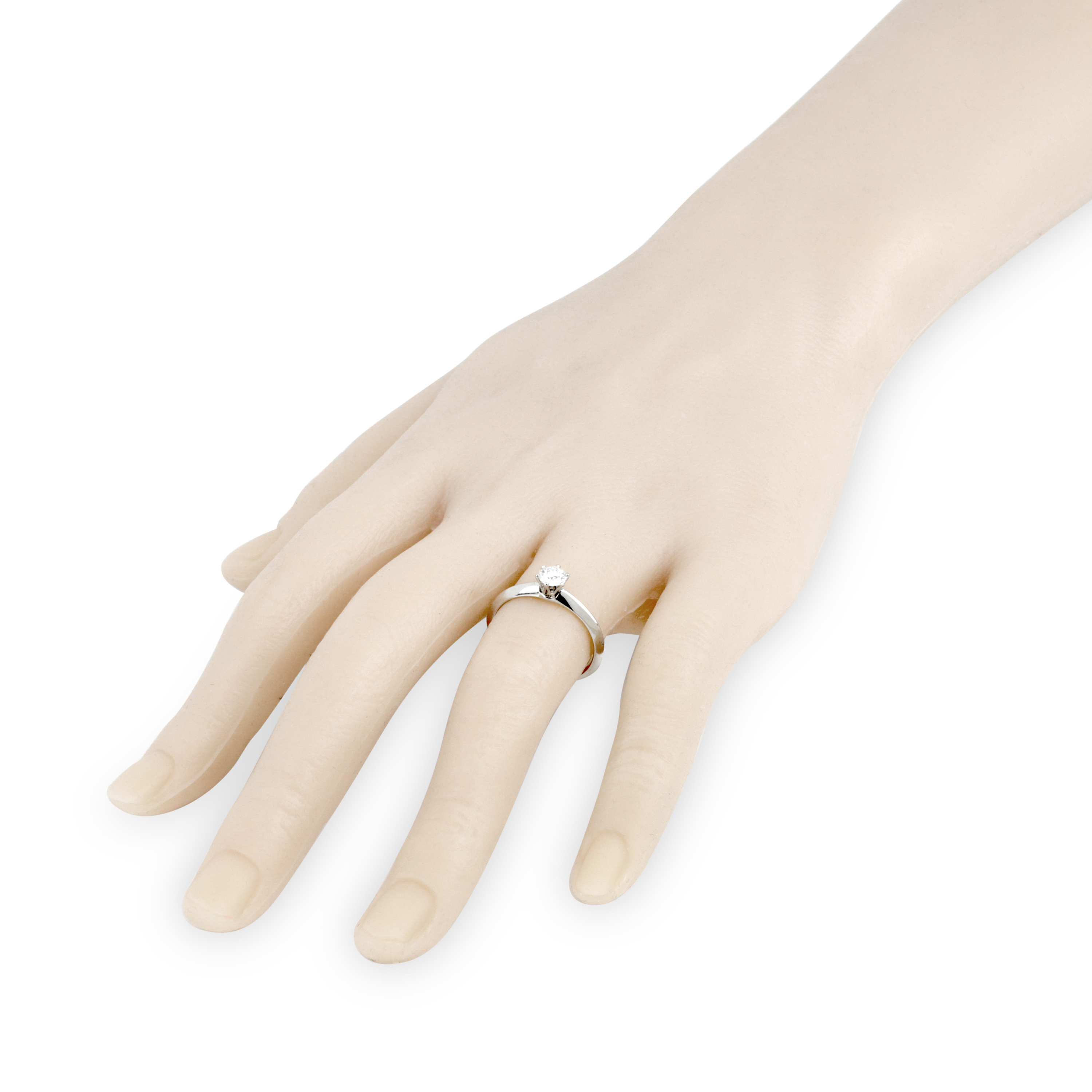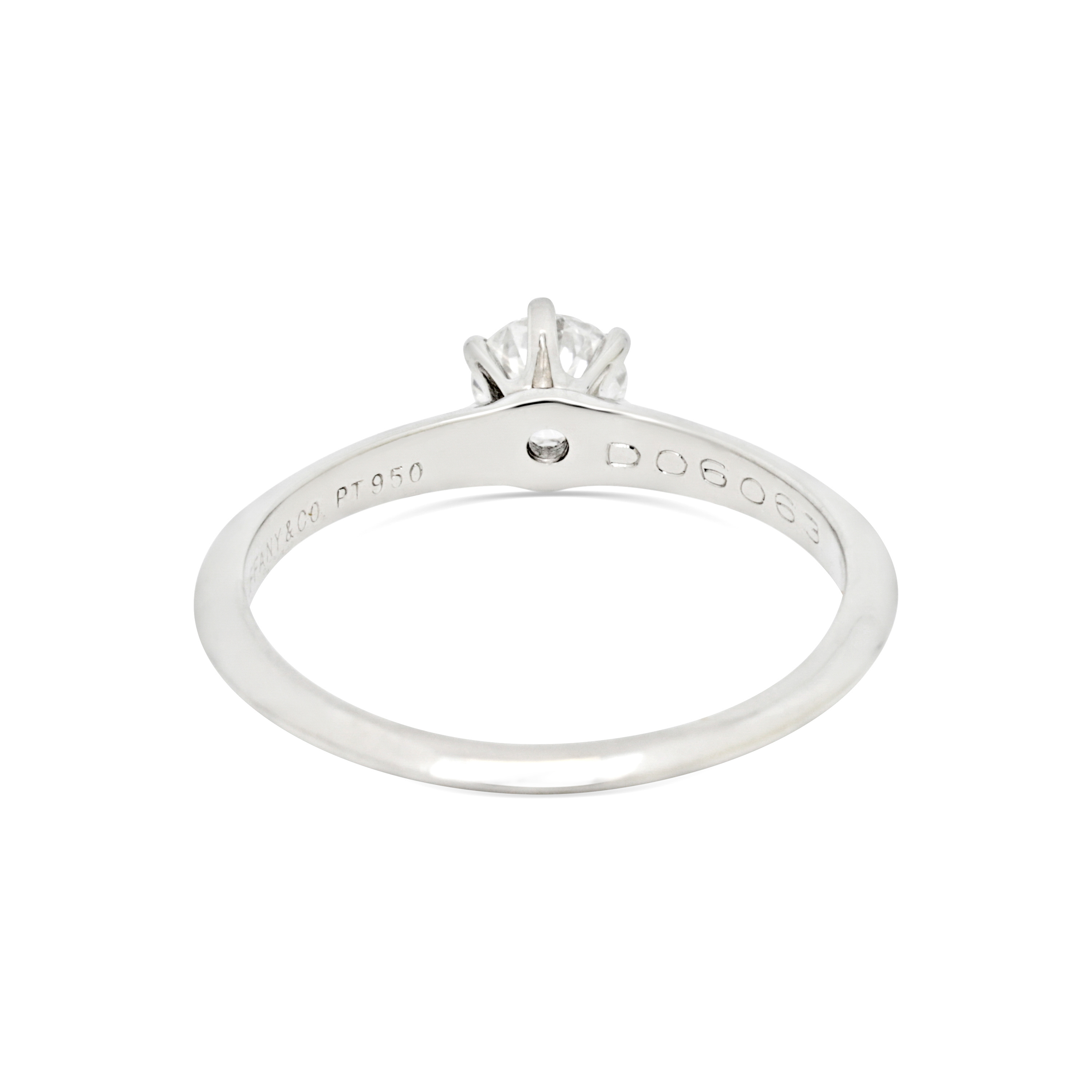 The round brilliant-cut diamond measures 4.68 - 4.71 x 2.82 mm and weighs .39 carats. A Tiffany & CO report #D06063 (serial inside shank) .39