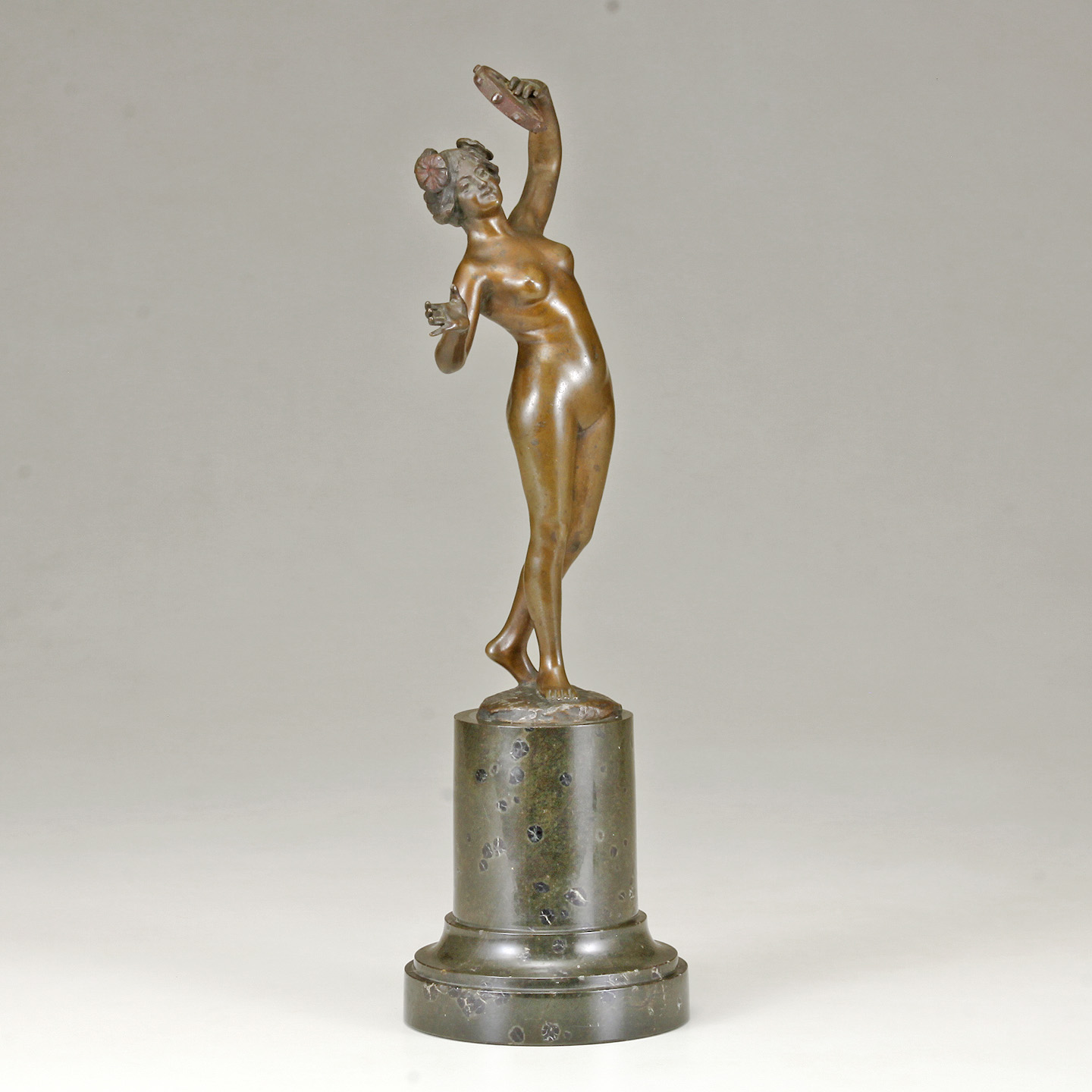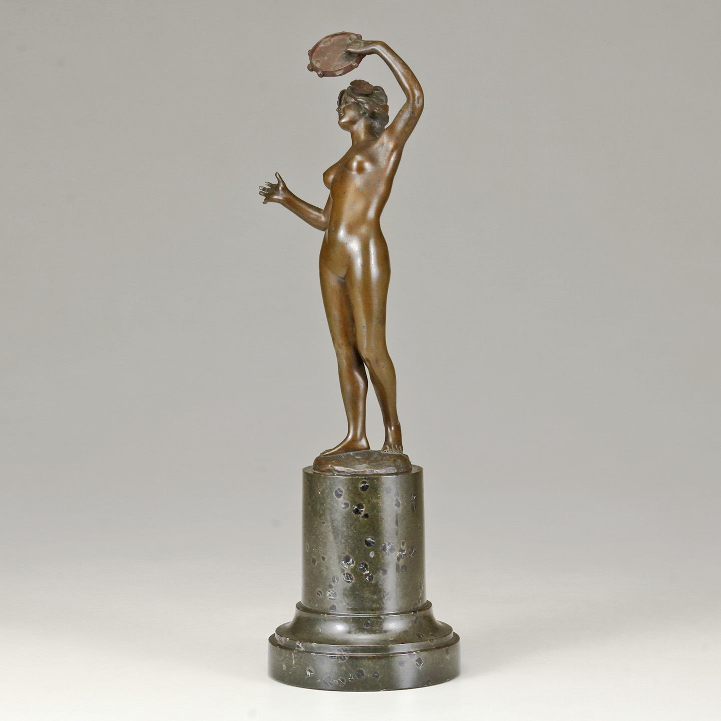 Modeled as a young girl with flowers in her hair with out stretched hands beholding a tambourine.